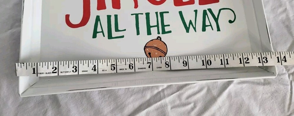 Add a touch of retro charm to your dining table with this medium-sized serving tray. The white metal decor tray features a jingle all the way pattern, perfect for the holiday season. Its rectangular shape and metallic finish give it a unique and festive look that is sure to impress your guests. Crafted from durable metal, this tray is perfect for serving your favorite dishes and snacks. Its features include a sturdy construction and ample space for serving. Whether you're hosting a Christmas dinner party or a seasonal gathering, this tray is a must-have addition to your kitchen collection.