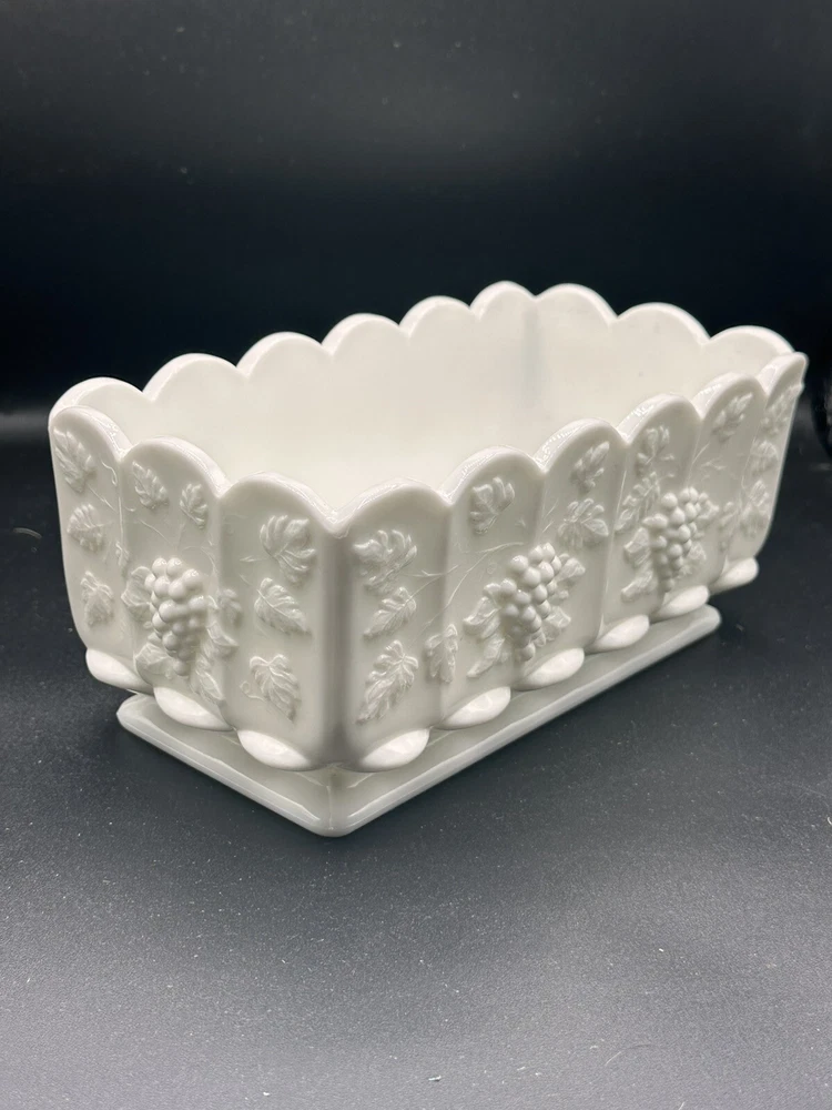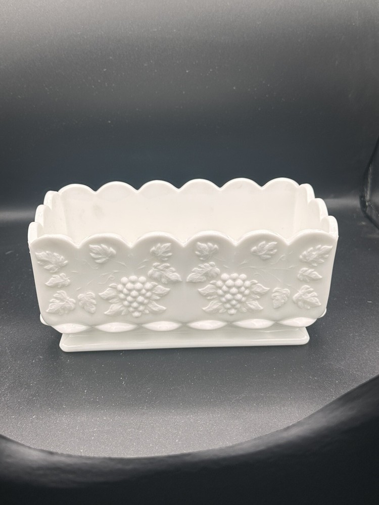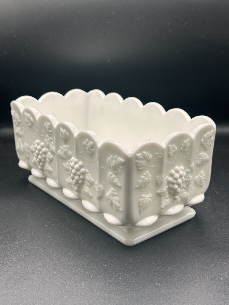 Vintage Westmorland White Milk Glass Paneled Grape Window Box Planter/Vase is a decorative piece featuring a grape pattern on glass. This Vase is designed in a boxing theme with a milk glass production style. It comes in a white color and packaged in a box. The product line is called Paneled Grape, showcasing a classic and elegant design. 8.5” x 4.5”