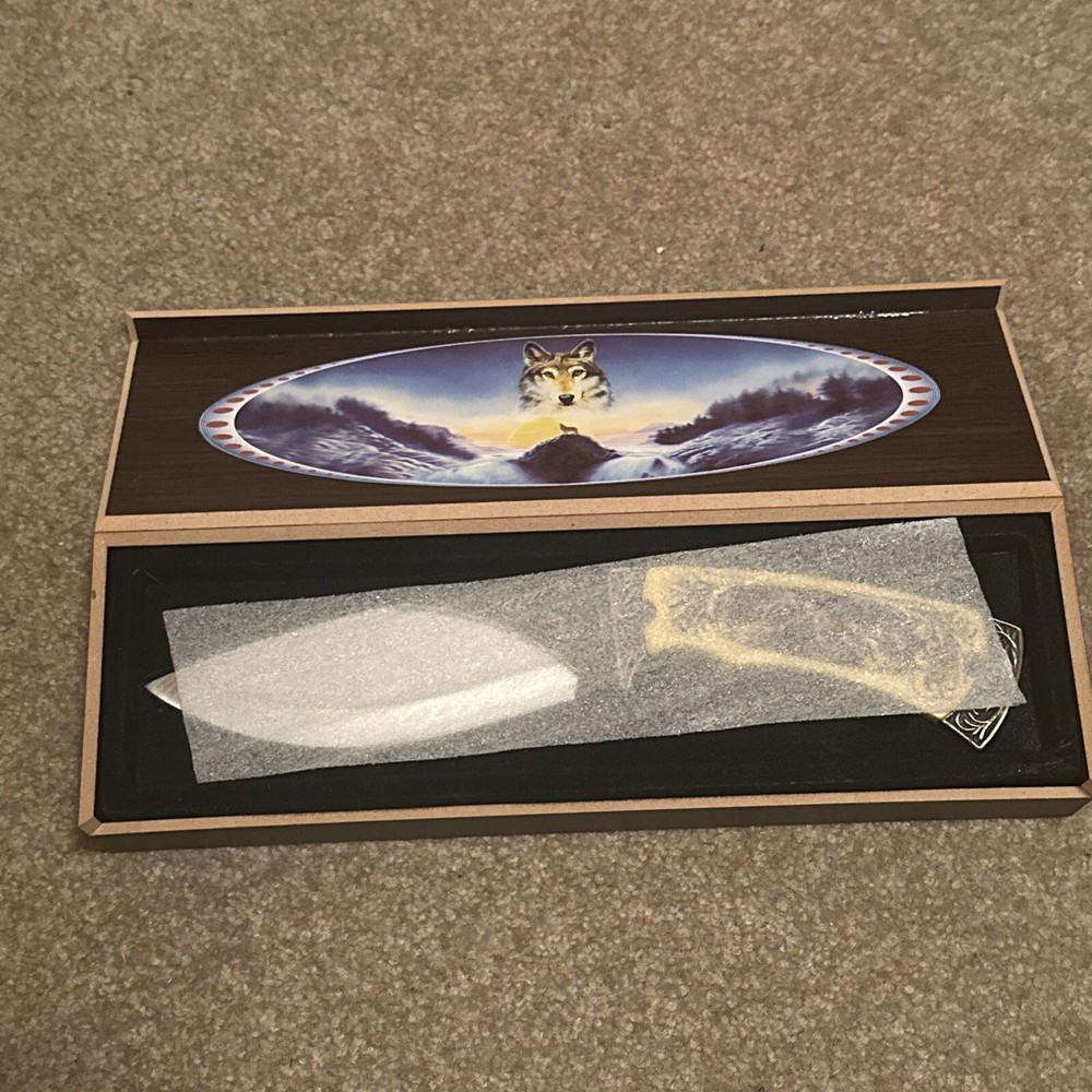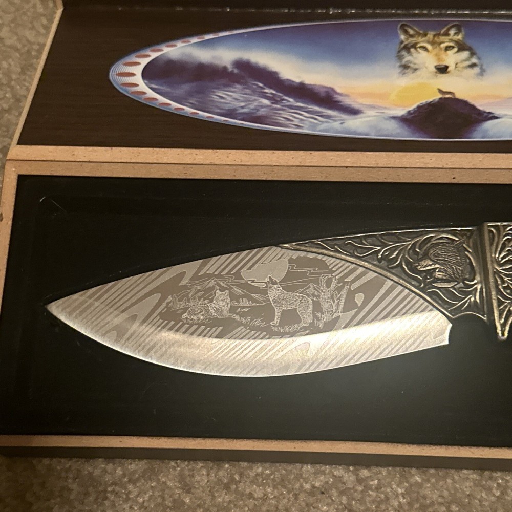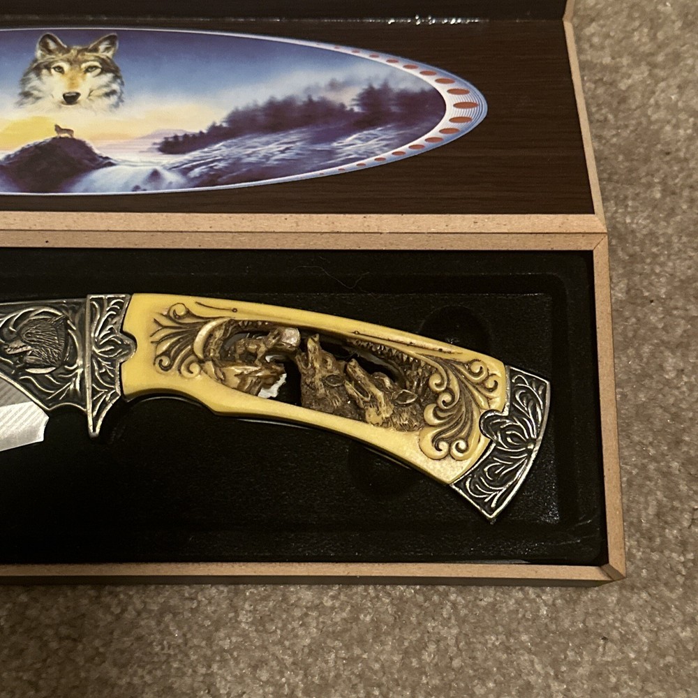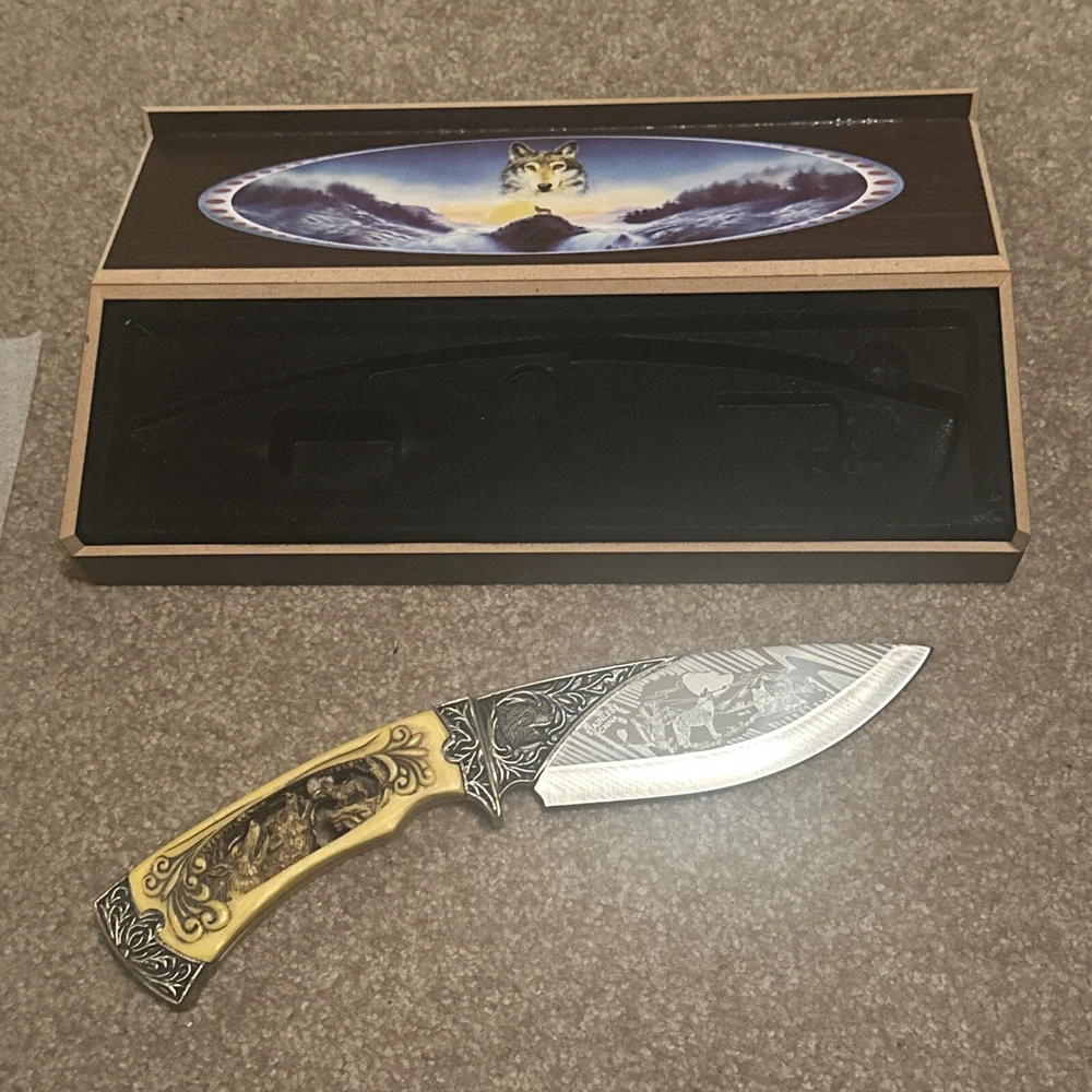 Vintage Wolves Hunting Engraved Knife with Box Outdoor Gift ST35