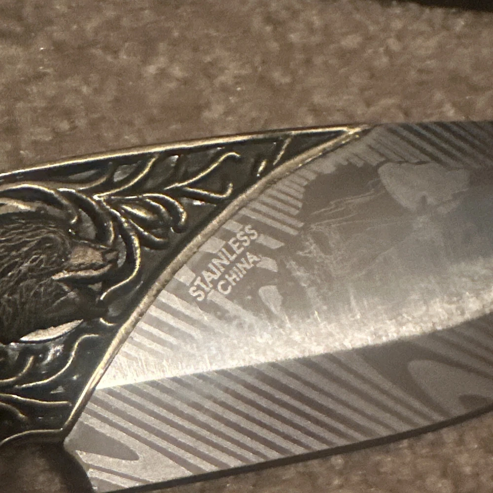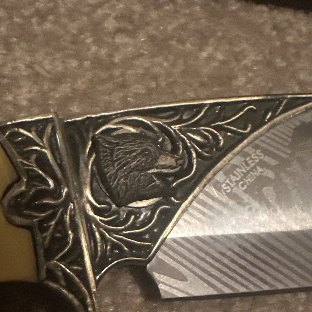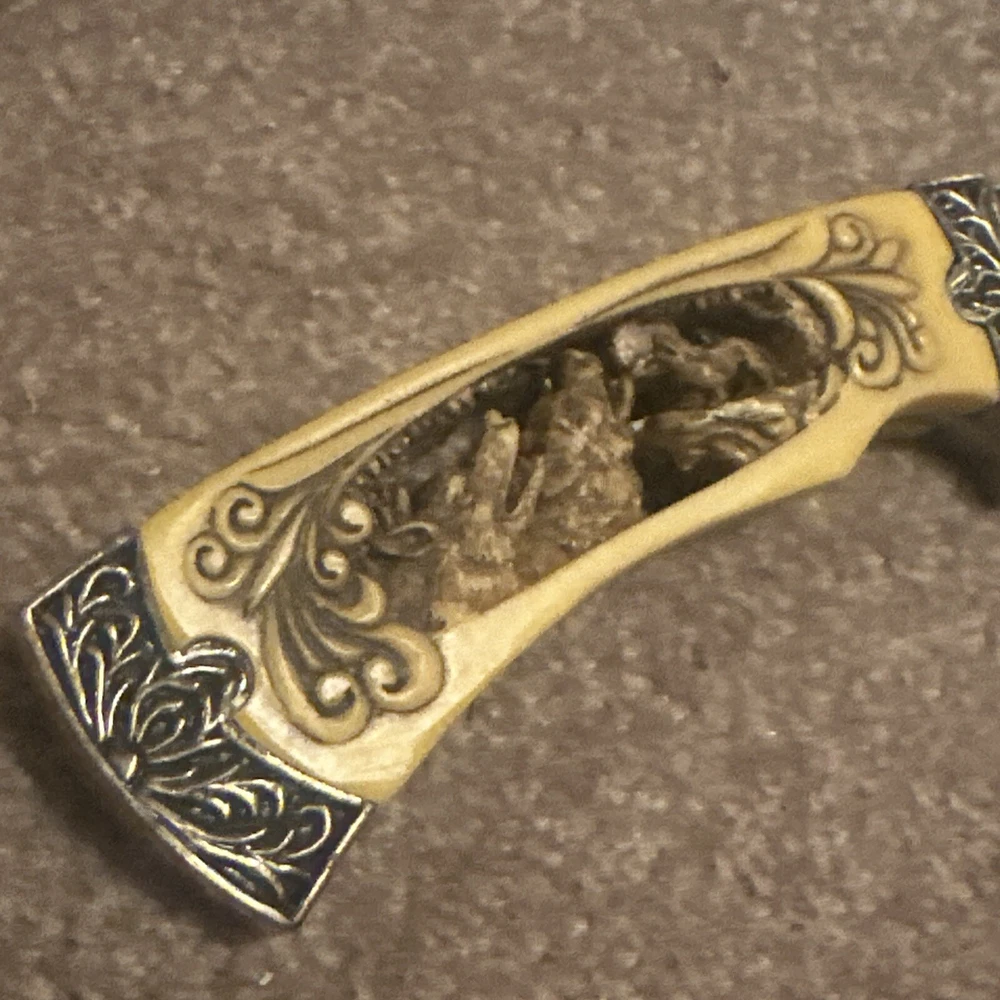 The product is a vintage decorative hunting engraved knife with a classic design and yellow color. It features a tactical style, one blade, a plastic handle, and belongs to the military product line. This collectible folding knife is suitable for outdoor use and would make a unique gift for enthusiasts or collectors. The knife comes with a box for safekeeping and display.
