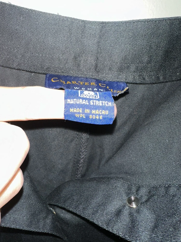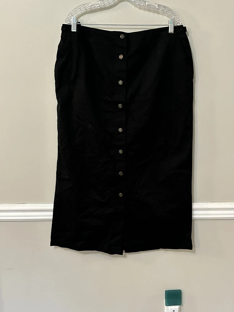 This vintage Charter Club skirt is a must-have for any fashion-forward woman. The black twill fabric, combined with spandex and cotton, makes it lightweight and comfortable to wear in any season. The A-line style and midi length create a flattering silhouette, while the high rise and button closure add a touch of sophistication. Perfect for travel, business, or casual occasions, this skirt is versatile and stylish. The solid pattern and 90s American theme make it a unique addition to any wardrobe. Plus, it's machine washable for easy care. Don't miss out on this rare find in plus size 14W.
