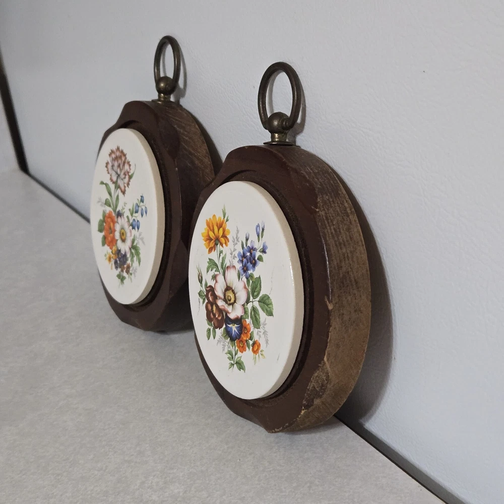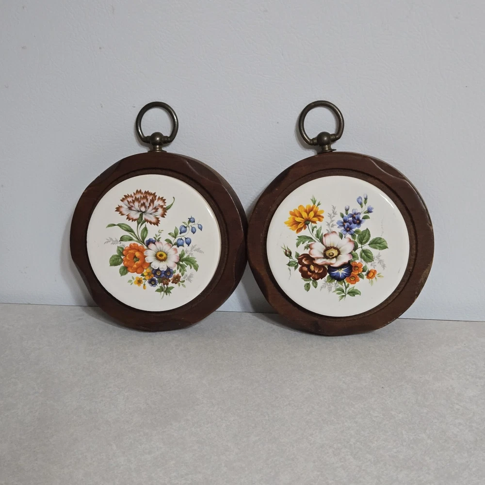 Vintage Wood And Ceramic Floral Tile Trivet Hot Plate Wall Hanging Decor. Nice used condition. Please see all photos for the best description and measurements
