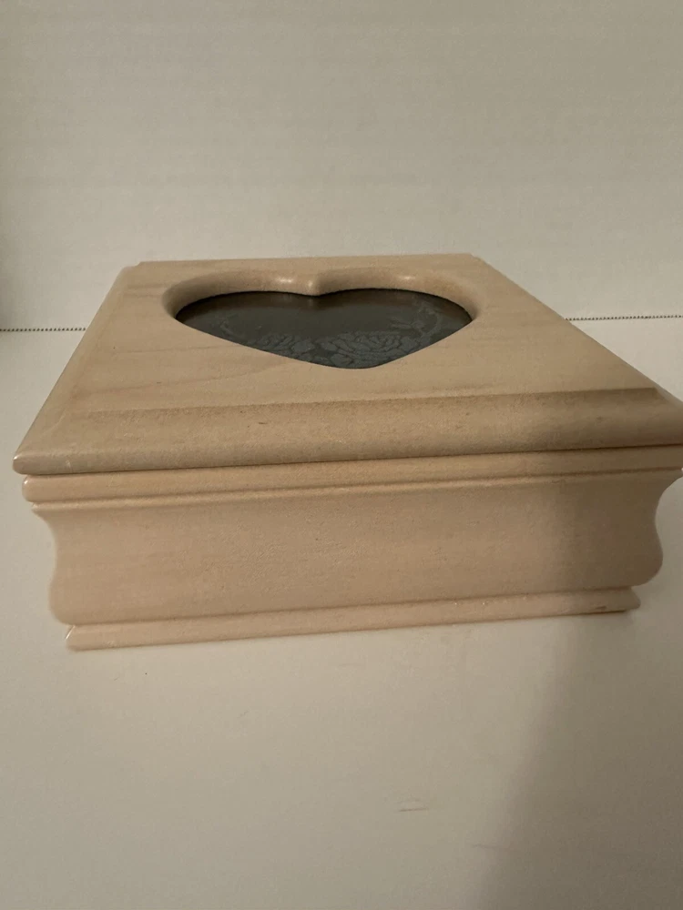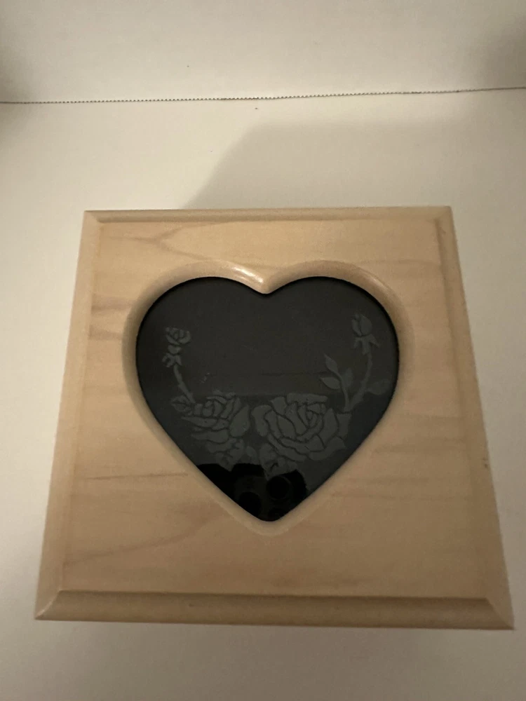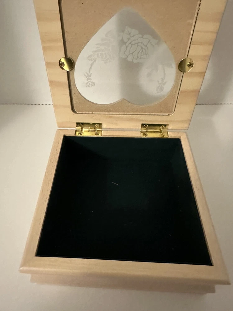 Vintage Wood Jewelry Box Heart Etched Rose Glass Lid