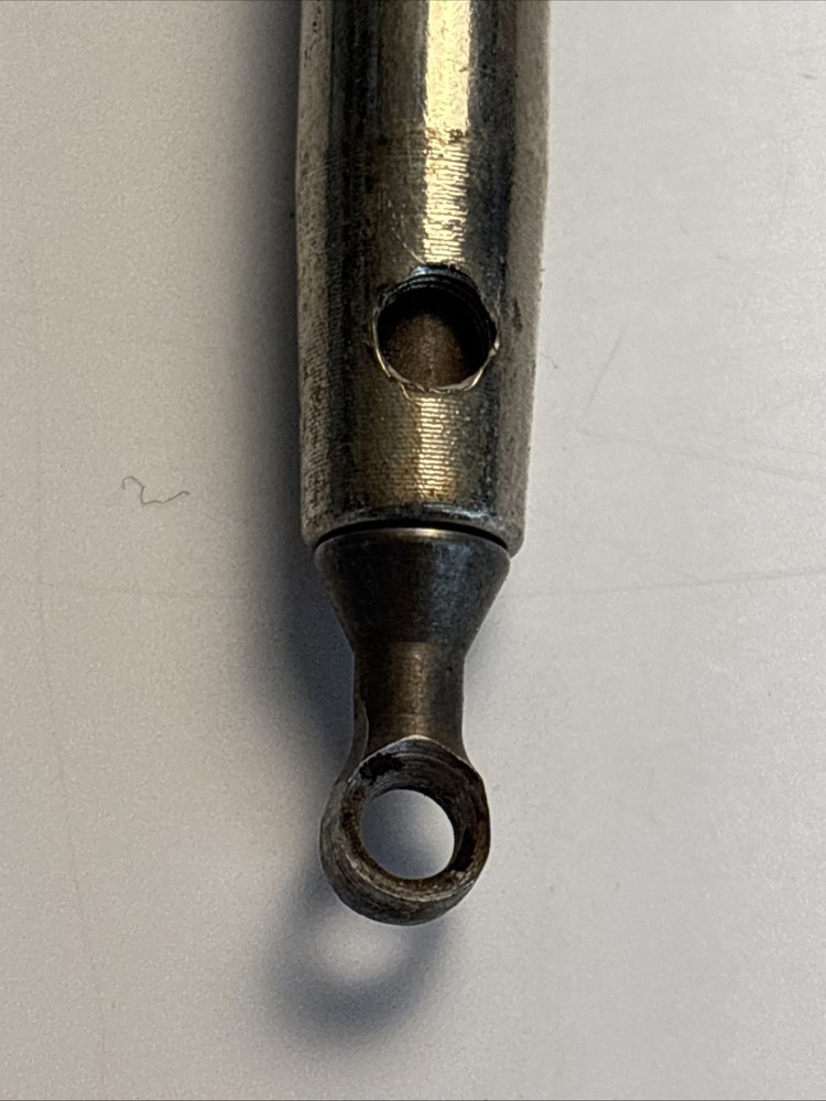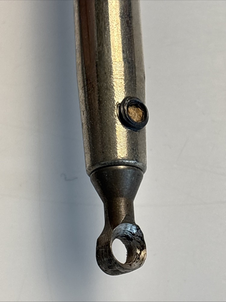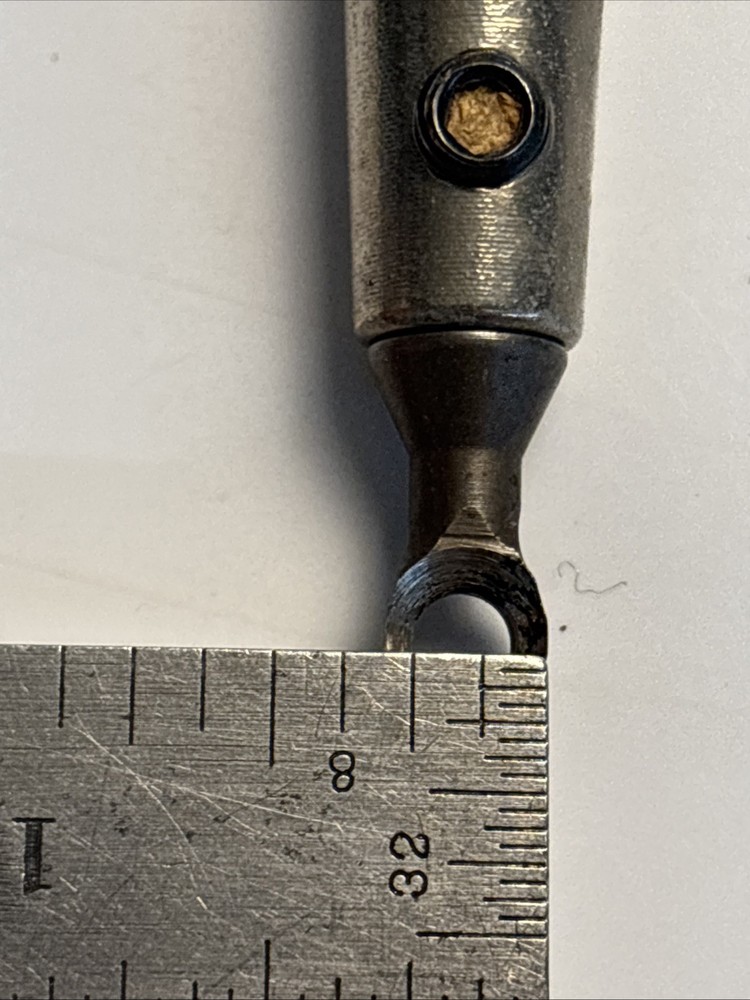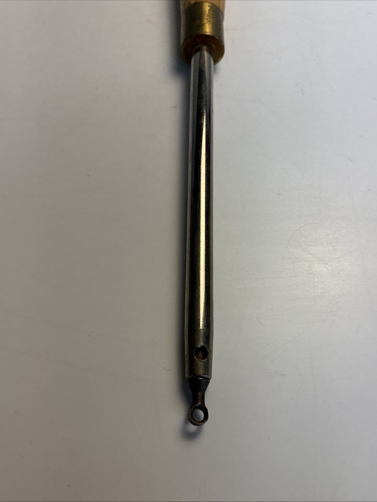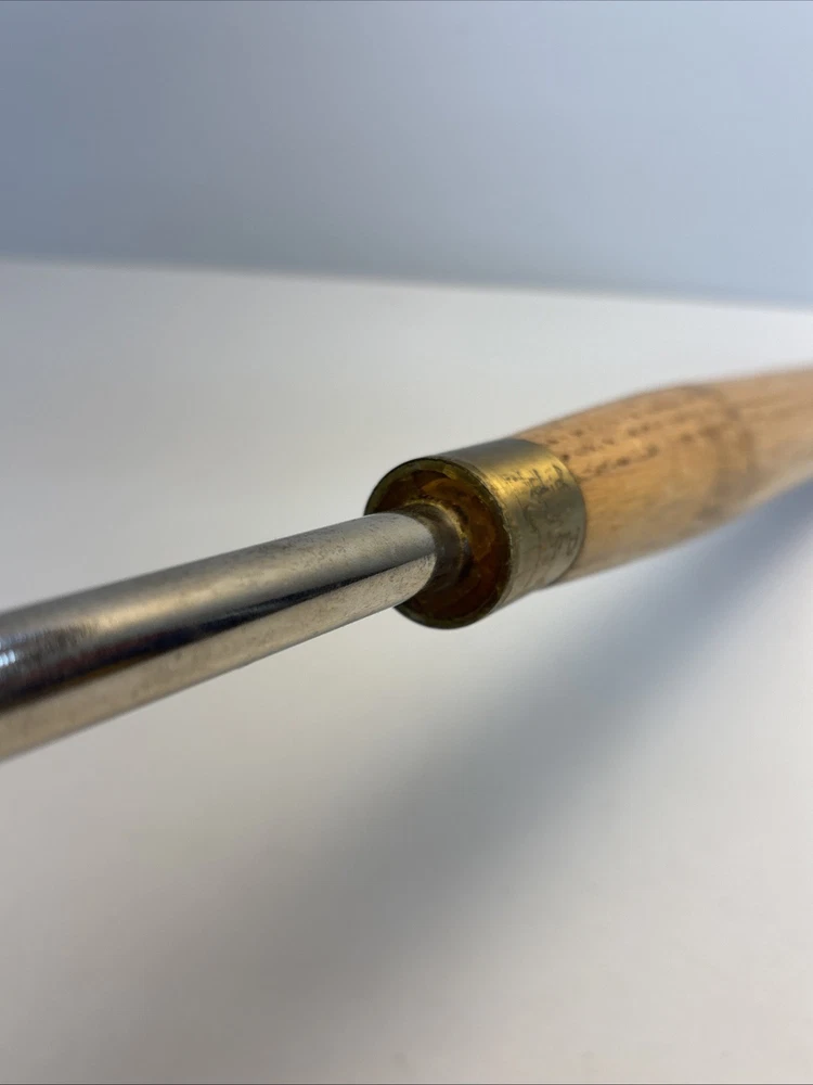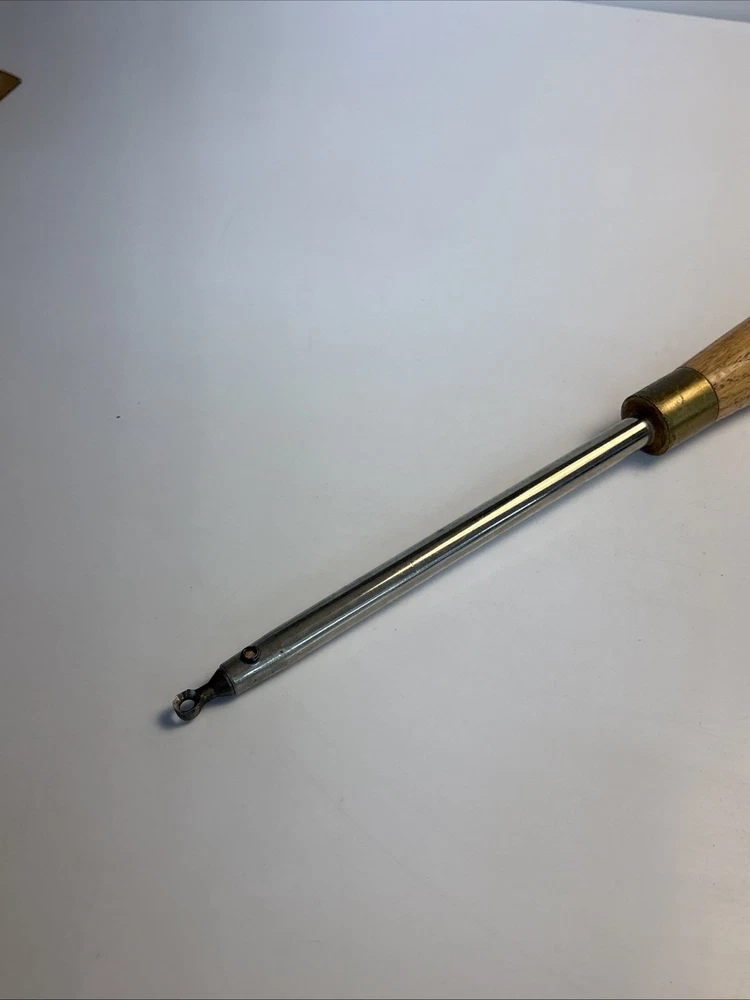 Vintage wood turning hollowing tool with straight shank and replaceable ring cutter. Overall length is approximately 23 inches. Features a small circular cutter measuring about 1/4 inch diameter designed for internal hollowing and detail work. Cutter is removable and secured through the shaft. Shows normal wear from use including surface marks and light oxidation on the steel. Cutter shows use and may benefit from sharpening or replacement. Handle is in good condition with light wear. Marked “Rich Jones” on the ferrule, likely an owner mark. See photos for complete details.