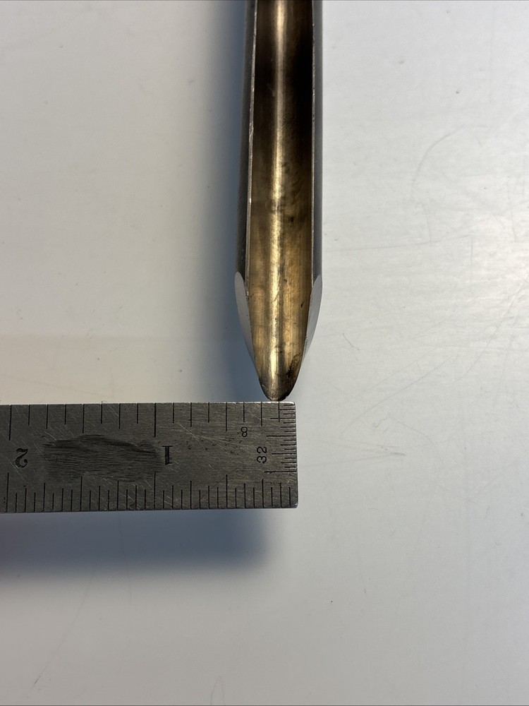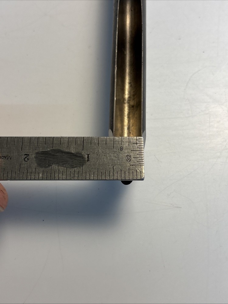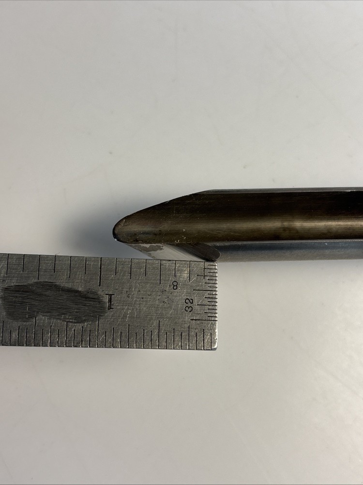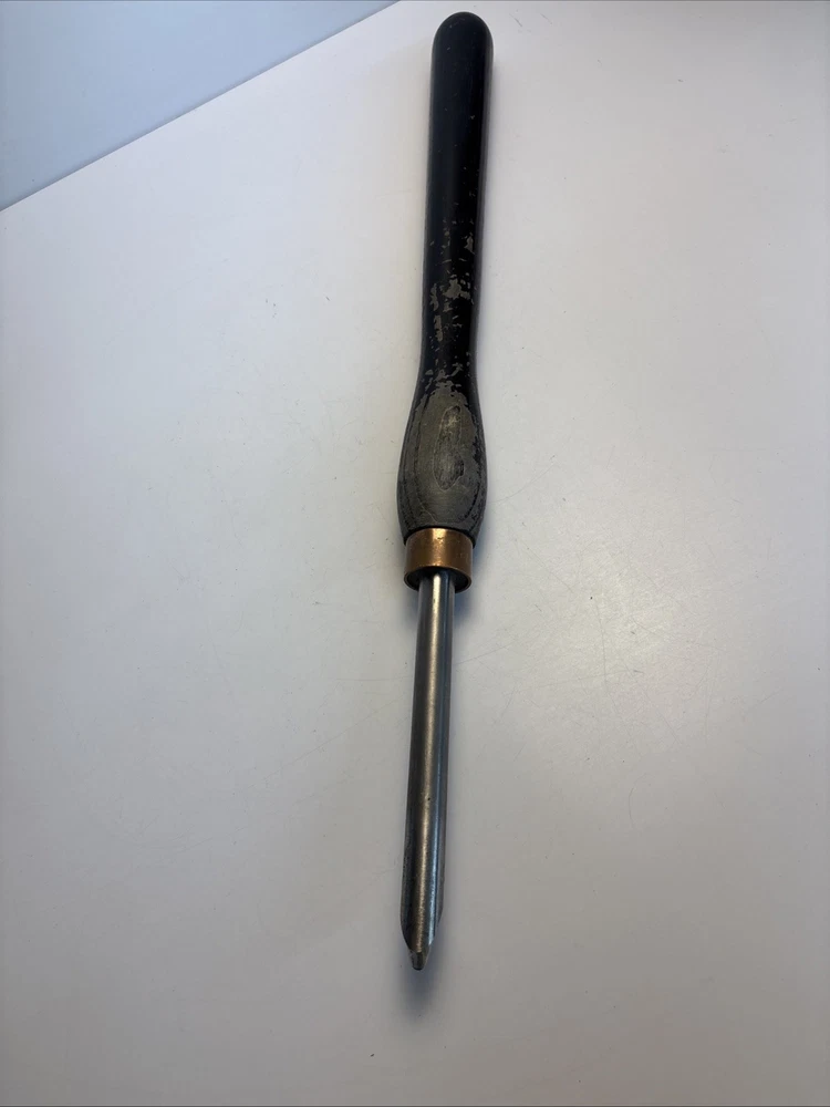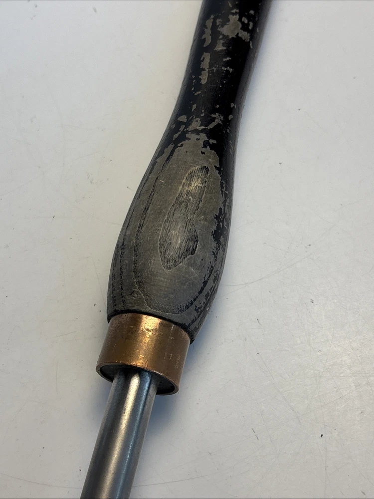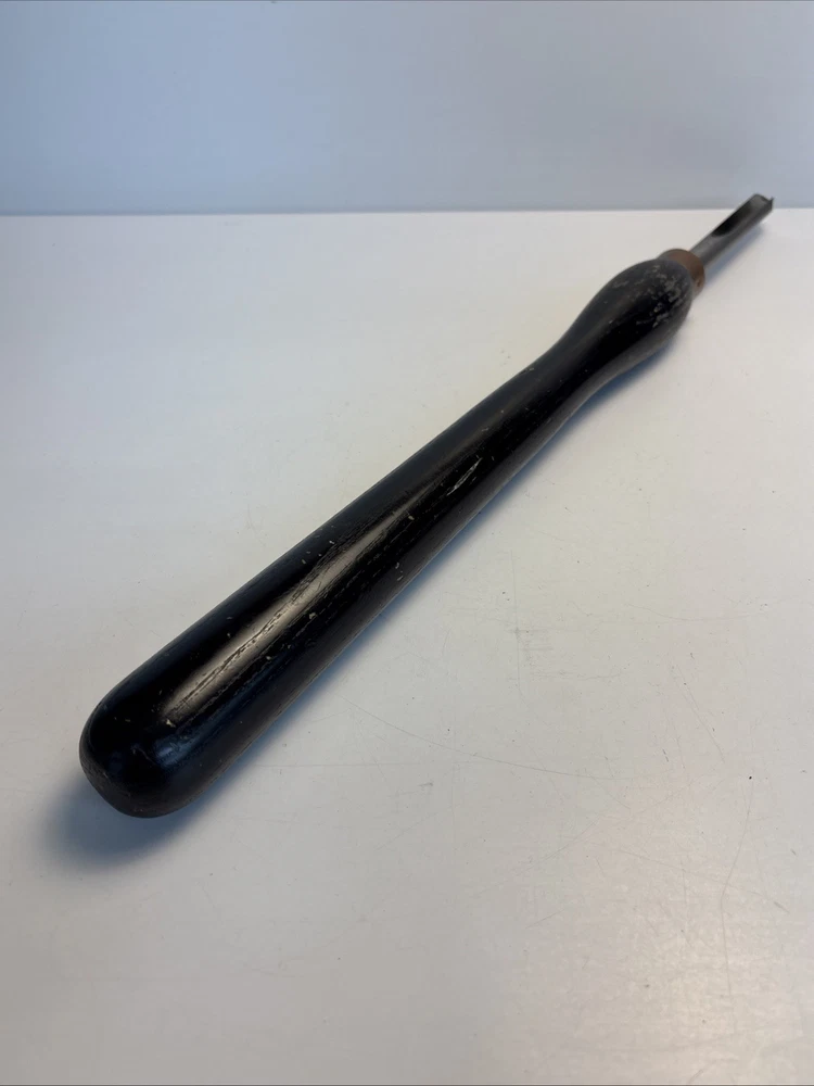 Vintage wood turning spindle gouge with deep U-shaped flute. Overall length is approximately 22 1/2 inches. Cutting edge starts around 1/4” wide and tapers up to approximately 1/2”. Long handle provides good control for detailed spindle work such as beads and coves. Unmarked maker. Shows normal wear from use including surface marks and light discoloration on the steel. Handle has finish wear and scuffs. Cutting edge appears serviceable but could benefit from sharpening. See photos for complete details.
