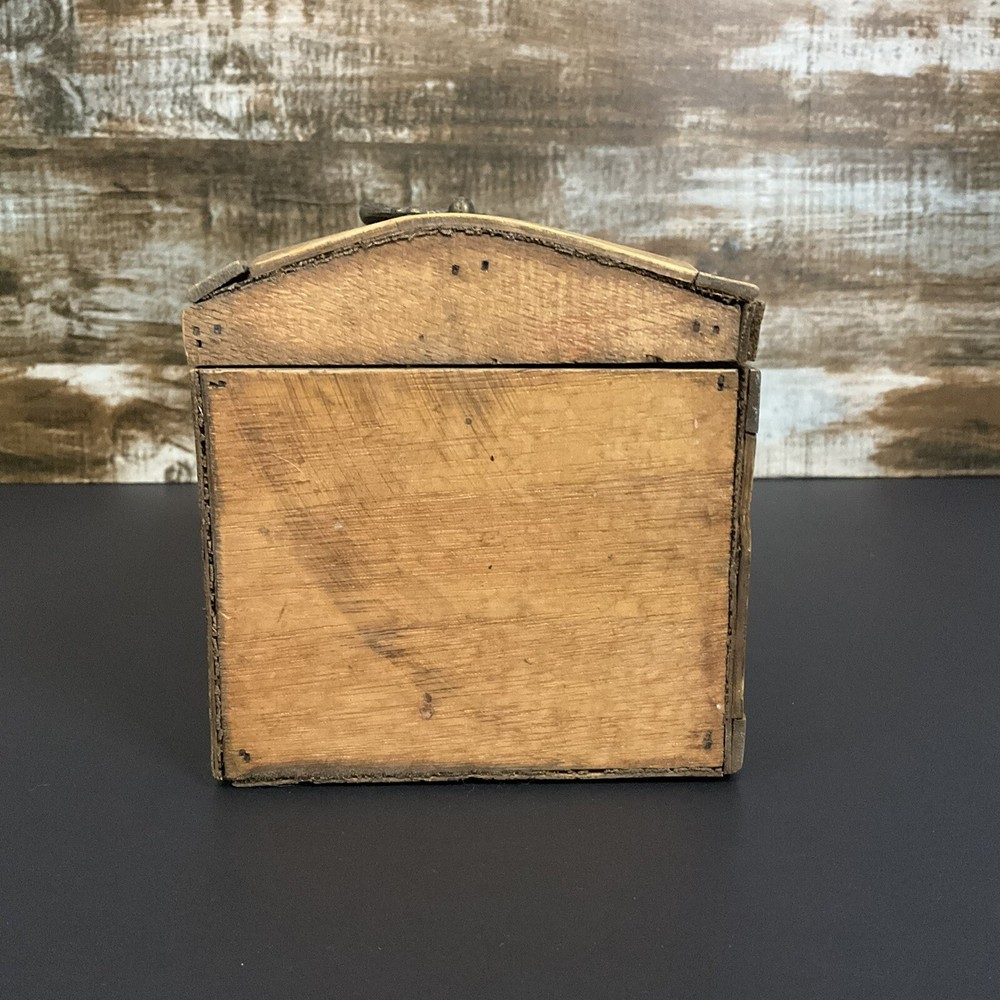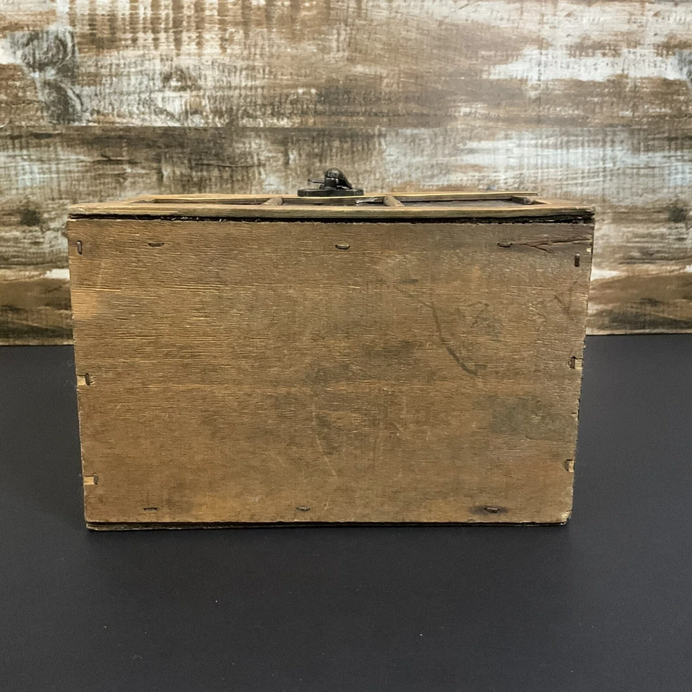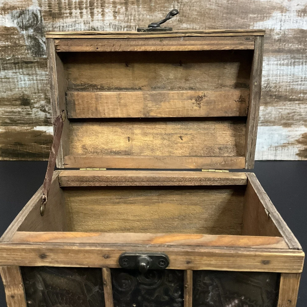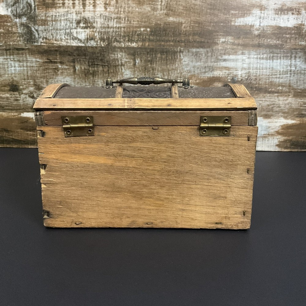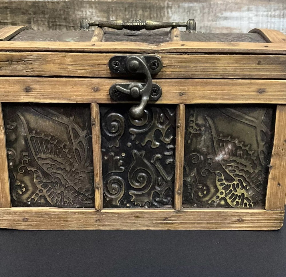 Welcome to Phantom Fables Vintage wood and metal (brass?j storage box Wood box with metal panels. Metal handle and latch. Interior is all wood. Small spot with tape residue on the bottom inside. Natural wear and patina. Otherwise in very good condition. Measurements take at widest point: Height-5 inches Width-4.5 inches Length-7 inches