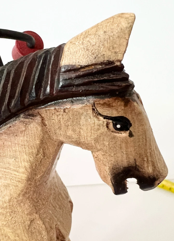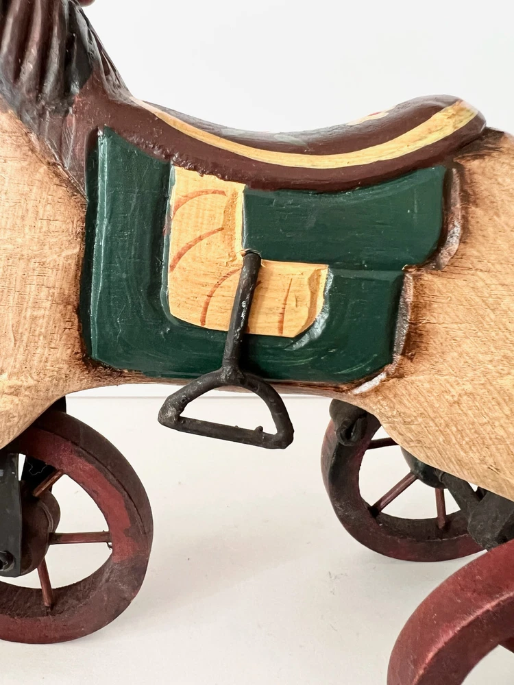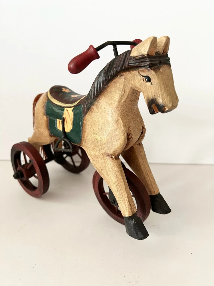 Vintage Wooden & Metal hand carved Horse Folk Art Horse Tricycle Saddle Stirrups The size of this piece is about 8 inches long by about 7.5 inches tall . Found at an Estate sale , could be Antique but for sure Vintage . This horse is in great condition and the wheels all turn. A fun piece of Folk Art .