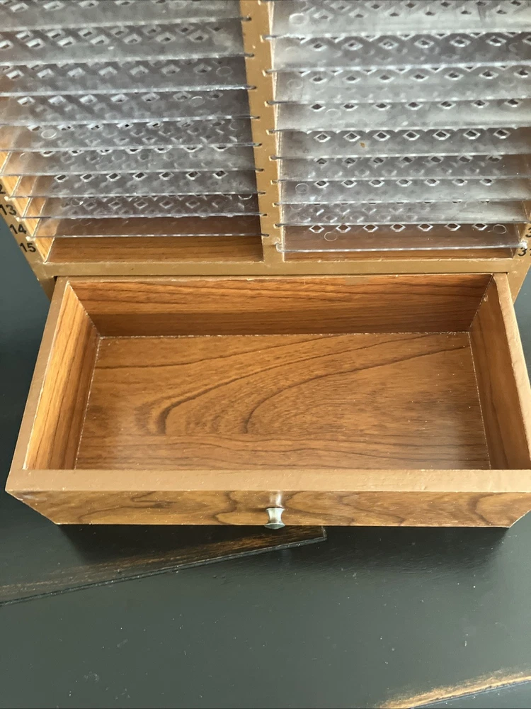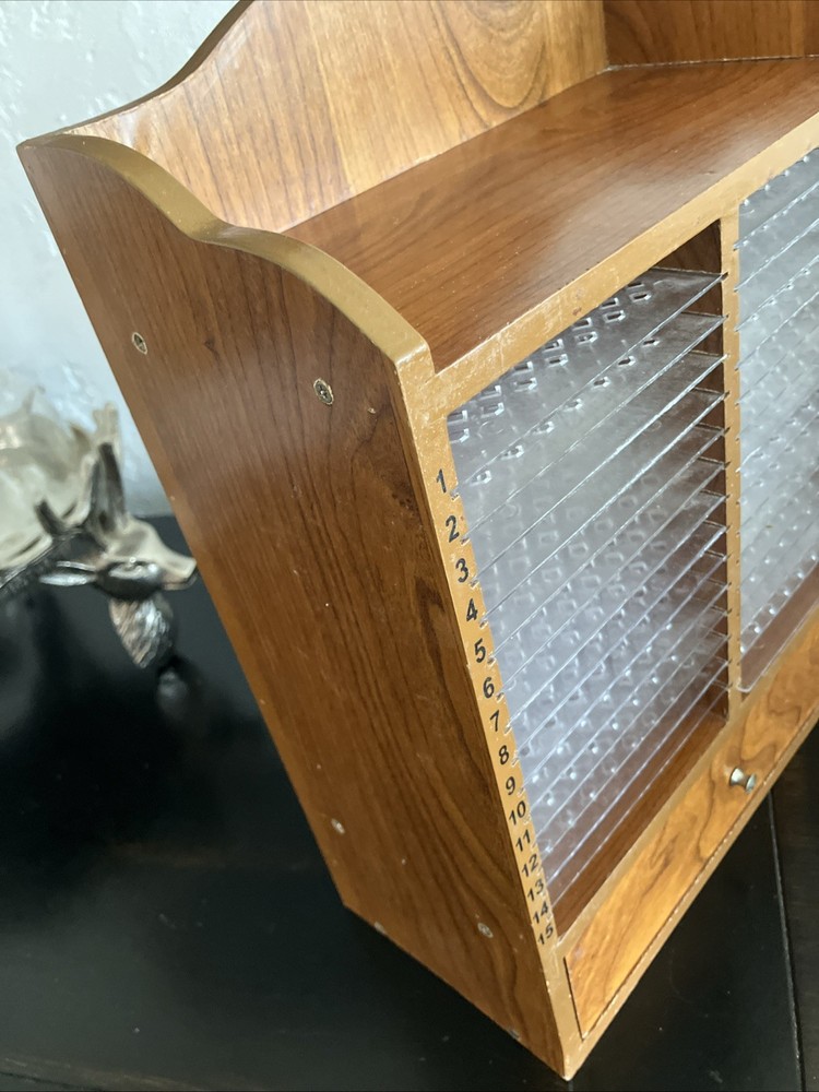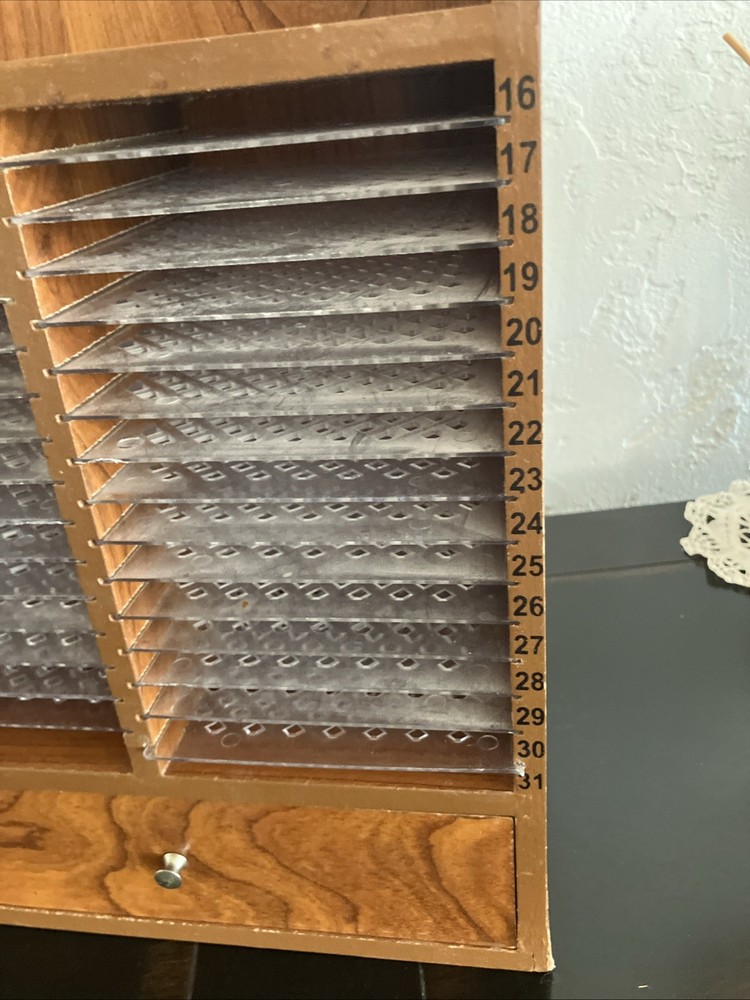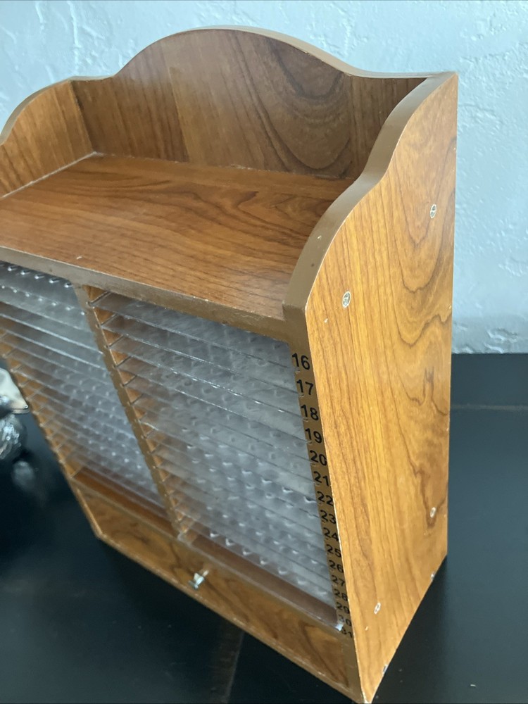 Keep your desktop tidy and your letters and bills neatly filed away with this Vintage 31 Day Wooden Monthly Mail Organizer. Constructed from sturdy wood, this organizer features a convenient drawer and removable slots to suit your filing needs. The classic design adds a touch of sophistication to any desk, making it a perfect addition to your home or office decor. Ideal for organizing your mail, this desktop organizer is a practical and stylish solution to keep your space clutter-free.