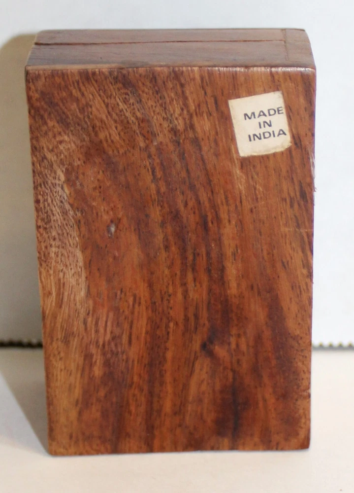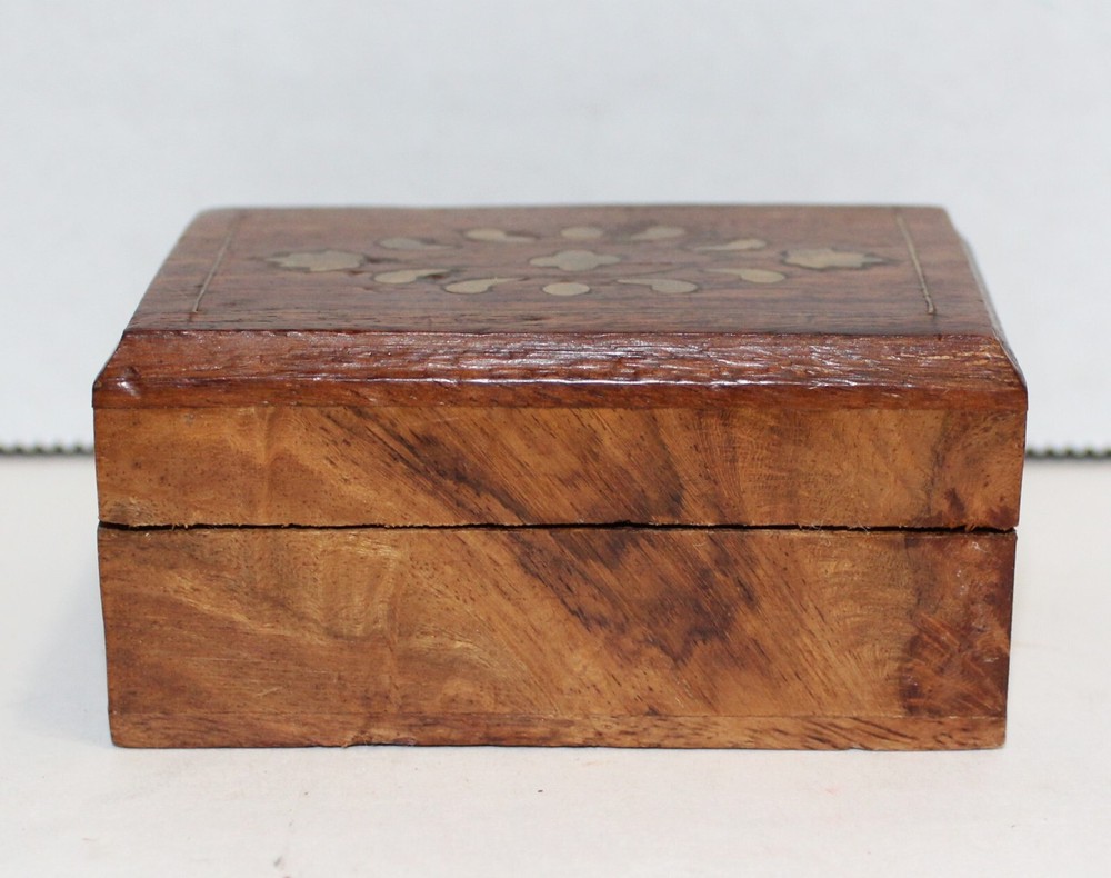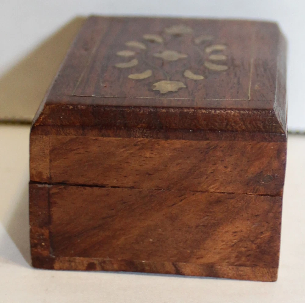 Vintage Retro Small Wooden Stash/ Trinket Box Gold Filigree Design Crafted with care, this vintage wooden stash trinket box is a delightful nod to the past. Its intricate gold filigree design, inspired by the timeless flower pattern, transforms the humble storage piece into a piece of art. Suitable for all occasions, this medium-sized rectangle box is as functional as it is aesthetically pleasing. The trinket box, originating from India in the 1970s, showcases the craftsmanship of the era with its wood-finished surface and carved details. Measuring 3 inches in length, 1.5 inches in height, and 2 inches in width, this keepsake is both practical for everyday use and special enough for those unique items. Its push lock closure ensures your treasures are secure, while the boxed feature adds an extra layer of protection and presentation. See Photos