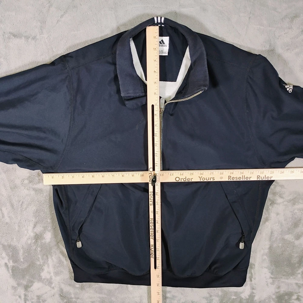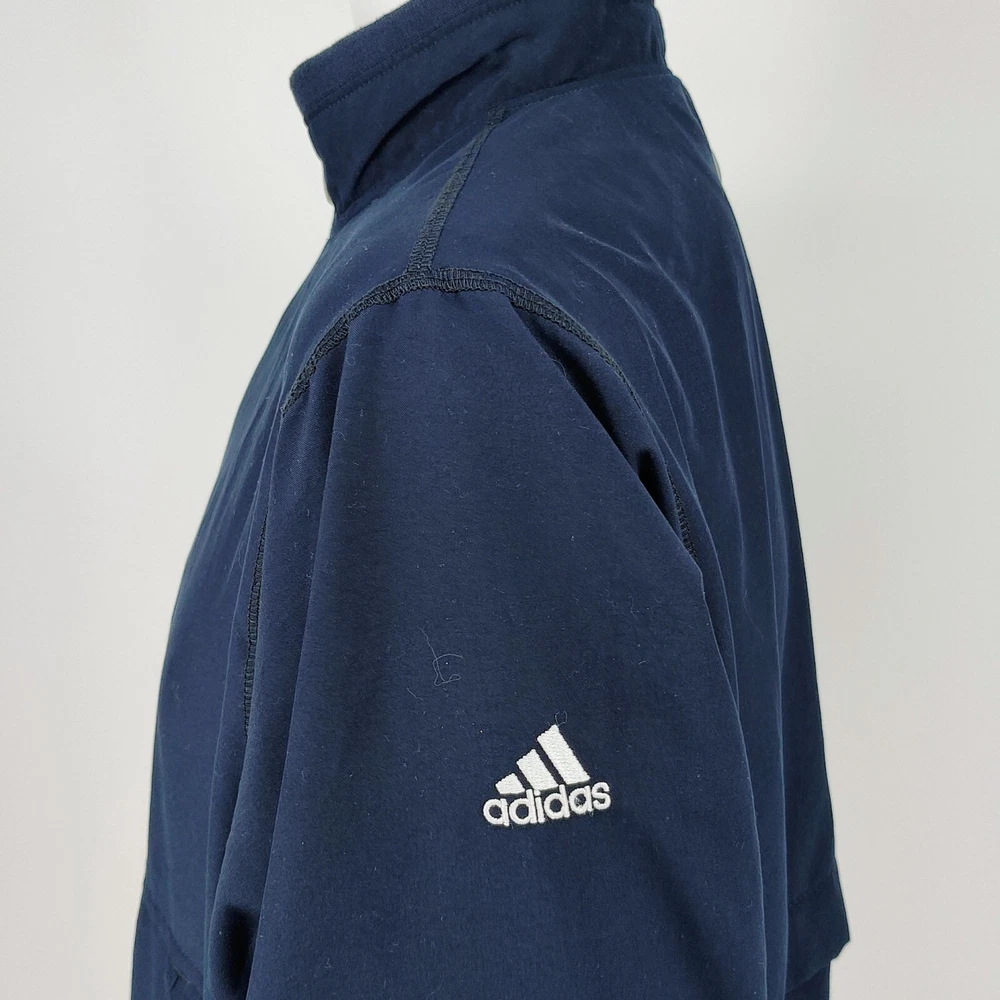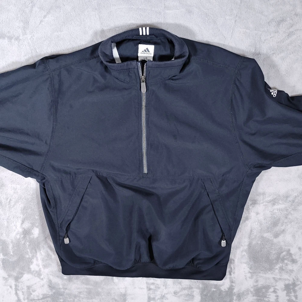 Condition Notes: Fair/good vintage condition. Multiple spots of dark discoloration spread out over front and back of jacket. Moderate wear throughout. See photos. Product Notes • Half-Zip Closure • Embroidered Adidas Logo • Elastic Hem & Cuffs • Side Pockets • Machine Washable • Mesh Lining • Vinted Back Measurements: Pit to Pit: 24 inches Chest: 48 inches Hem to Collar: 26.125 inches Please check photos and measurements carefully. Note the boxy fit and relatively short length.