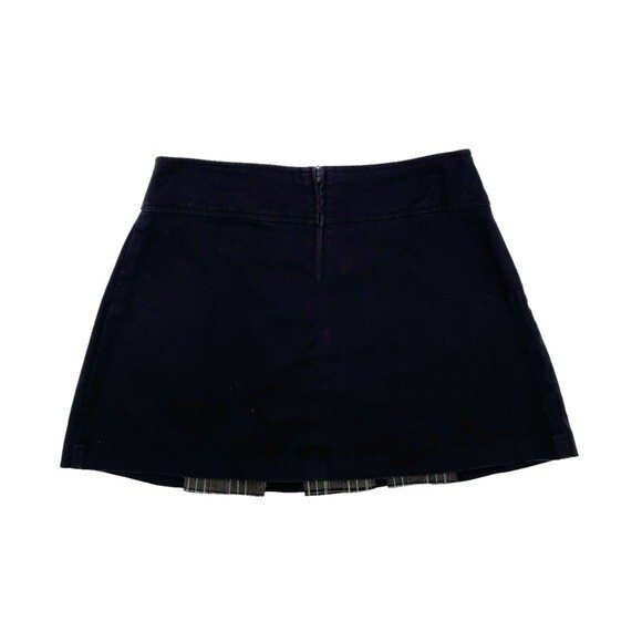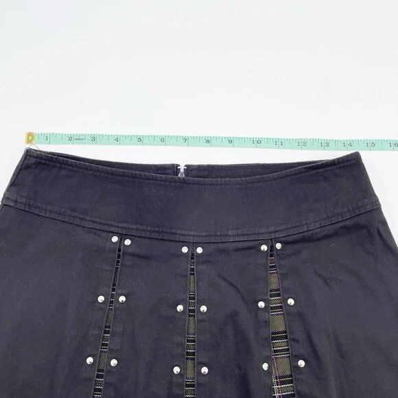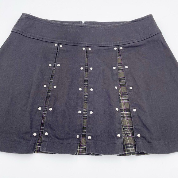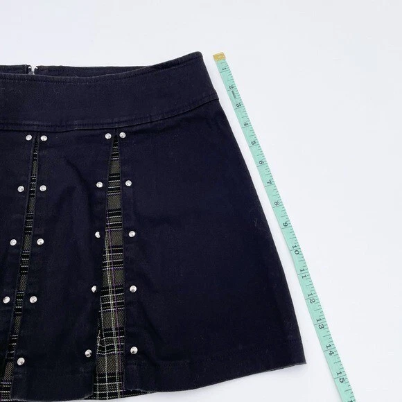 Vintage Blest Pleated Mini Skirt with Studs Black mini skirt with pleating detail and olive green plaid print underneath Stud detailing along pleats Low rise Micro mini length Pleated Back zipper closure Cotton/Spandex Made in USA Size Medium Good pre-owned/vintage condition Approximate measurements laying flat: Waist: 14.5" across Length: 14” tags: 90s, 2000s, punk, grunge, fairy, y2k, micro mini, low rise, mean girls, retro, dark academia, preppy, schoolgirl, goth, mall goth, gothic, emo