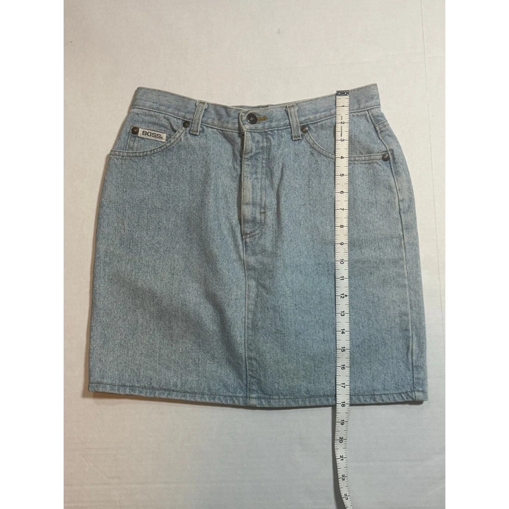 Vintage Y2K Boss by IG Design Denim Jean Skirt Womens Small Light Wash Mini Blue Festival Country Cowgirl Cowgirlcore Western Basic Everyday Staple Capsule Wardrobe Classic Timeless 5 pocket design Casual High Rise High Waisted America American Made 2000s denim skirt by Boss. Light blue. High waist. Leather brand logo tag on back. PLEASE READ – As with all vintage pieces please see measurements for sizing. VTG tag size 11/12, measurements indicate would be todays size small, please review measurements. Made in the USA. This VTG piece in great preowned condition for age. Professional, highly rated seller, quick shipper, open to offers! Approximate measurements: Waist: 29 inches Length (waist to hem): 18 inches 71602