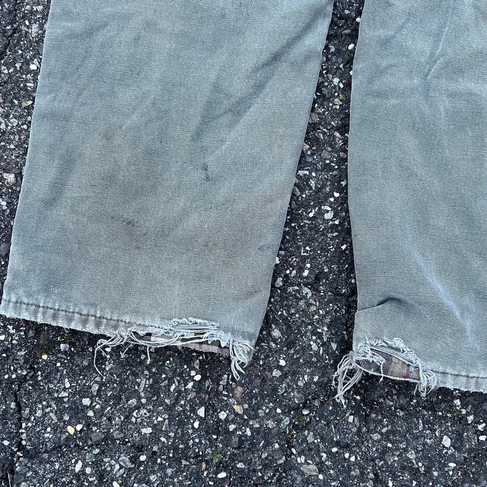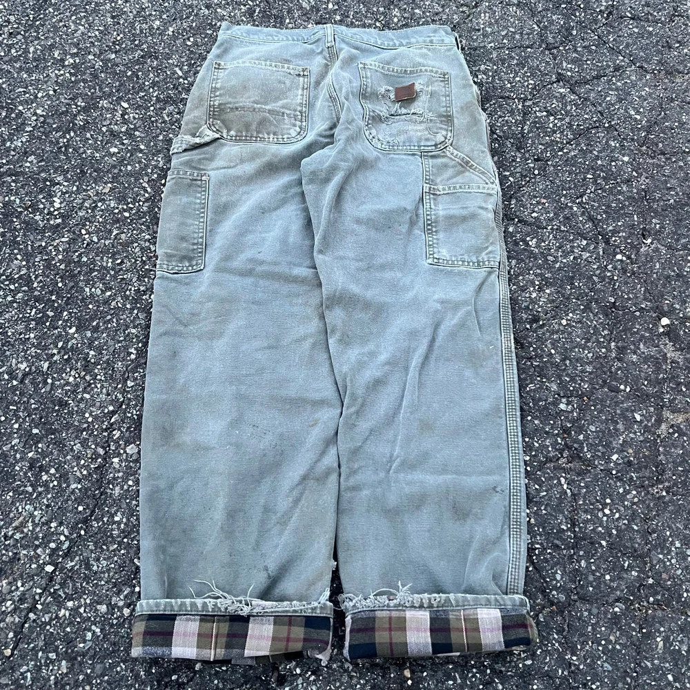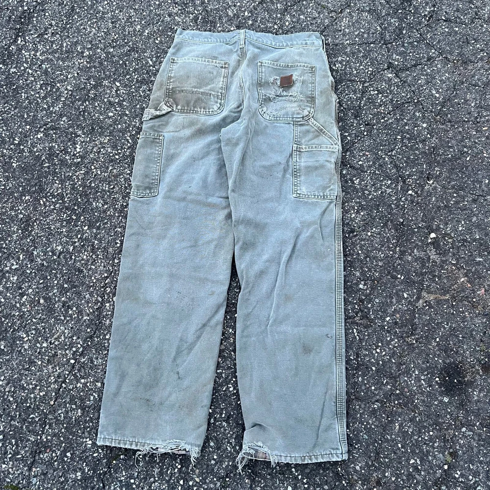 Vintage Y2K Carhartt mos flannel lined dirty green work wear carpenter pants. Clearly have stains hahahah please just be ready to wash these ones. Kinda smell too. Measure 30x30 and a 8.75 leg opening. Please check measurements before purchasing. I do my best to show any flaws in pictures. Quick shipping! Bundles encouraged! @ants_haul on Instagram. 408!!!