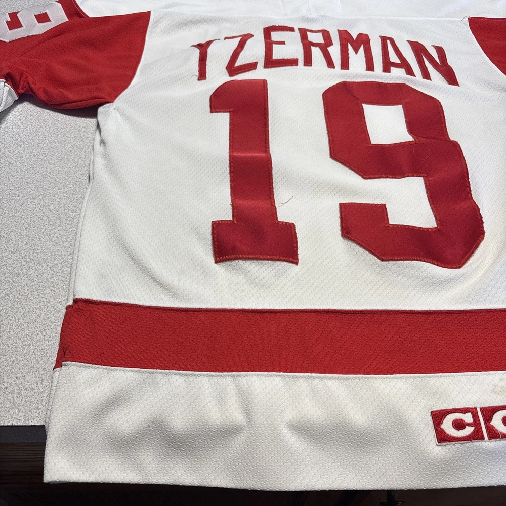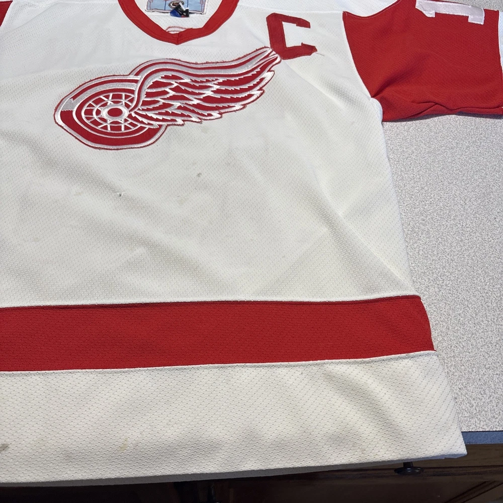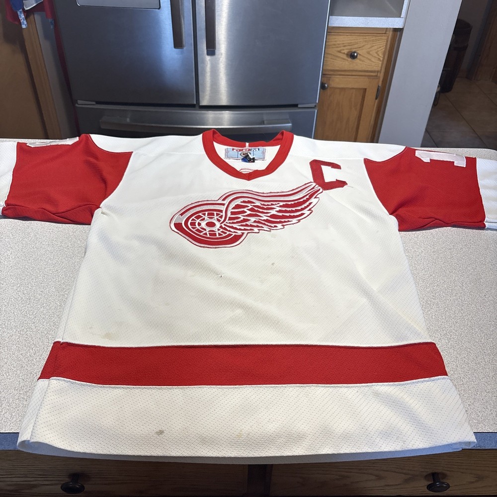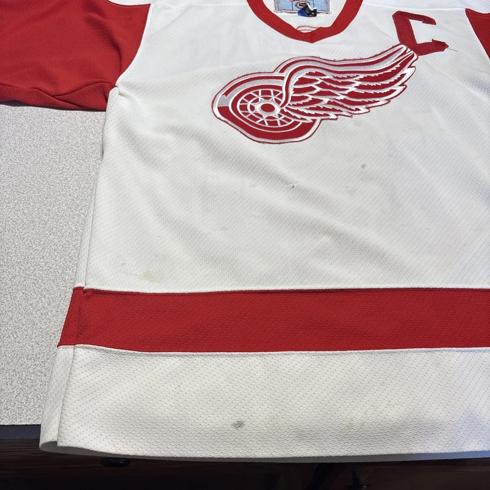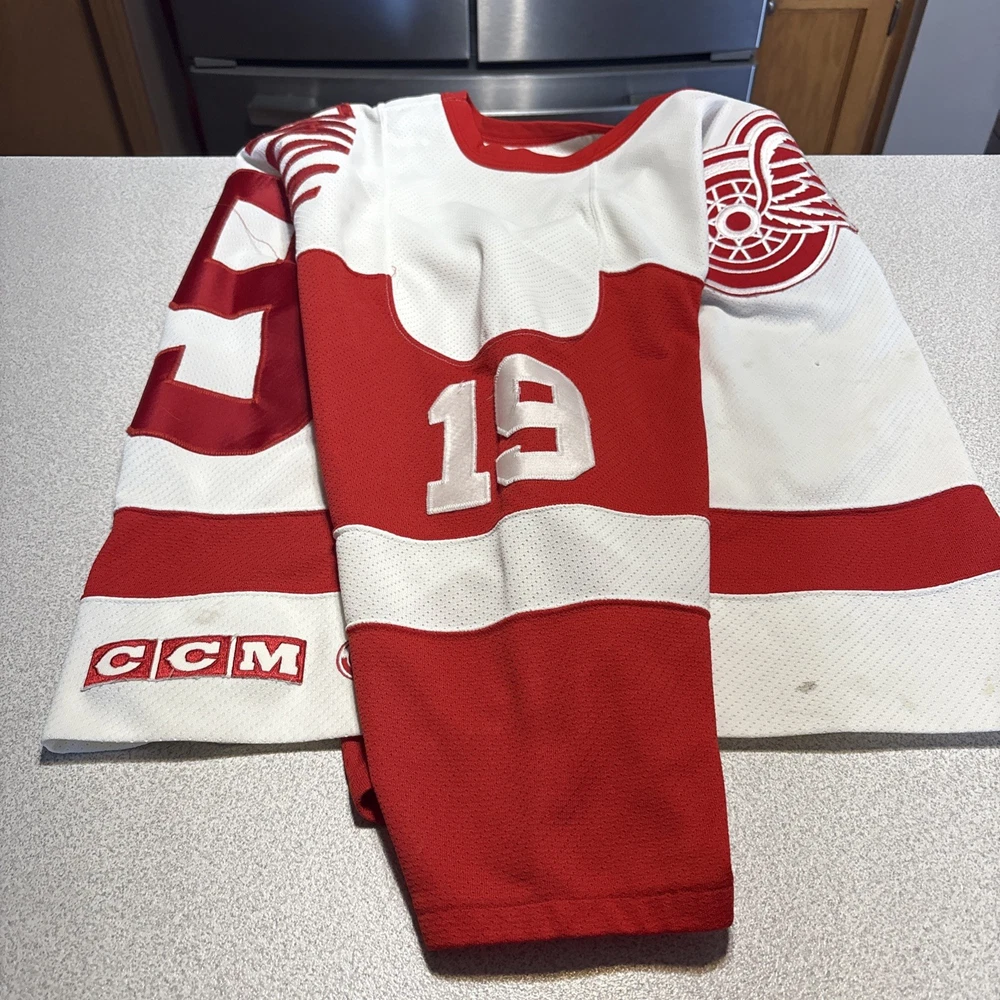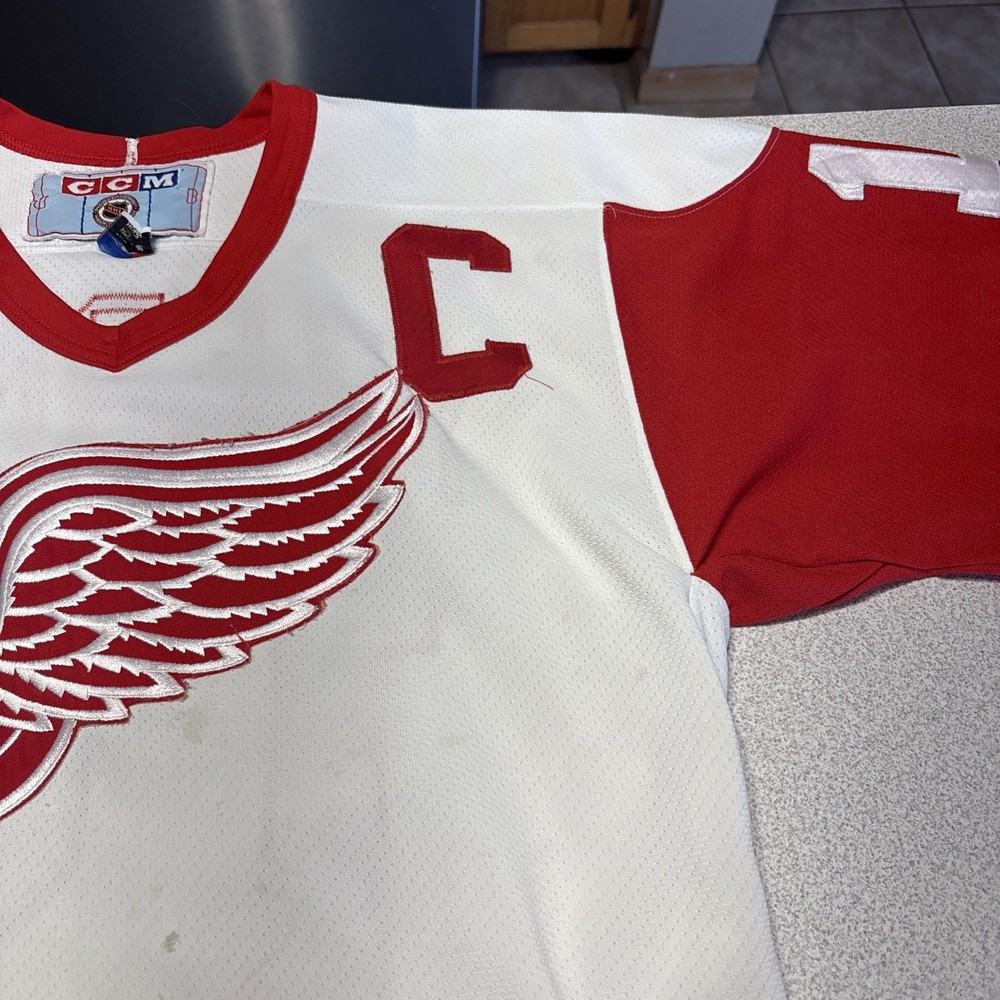 This Vintage Y2K Detroit Red Wings Steve Yzerman #19 Hockey CCM Jersey in size Medium is a classic piece of sports memorabilia. Made with a striped white jersey fabric and featuring an embroidered Yzerman character on the back, this athletic fit shirt is perfect for any fan of the Red Wings and Yzerman. The long sleeves and V-neck design make it a comfortable and stylish choice for any casual outfit, while the lightweight and lined construction adds a touch of vintage charm. Machine washable for easy care, this jersey is a must-have for any collector or fan of the sport. Has some stains and wear (see photos)
