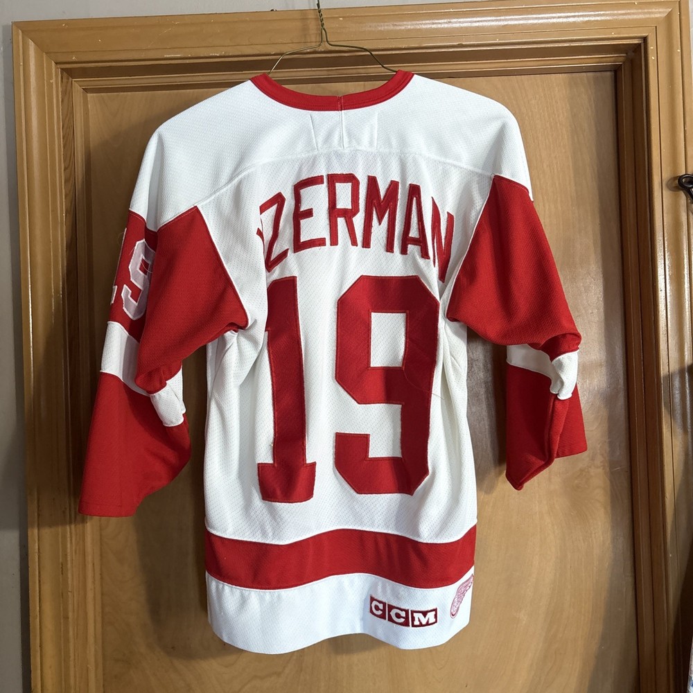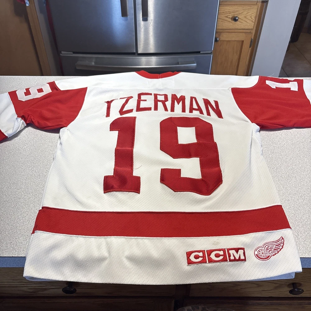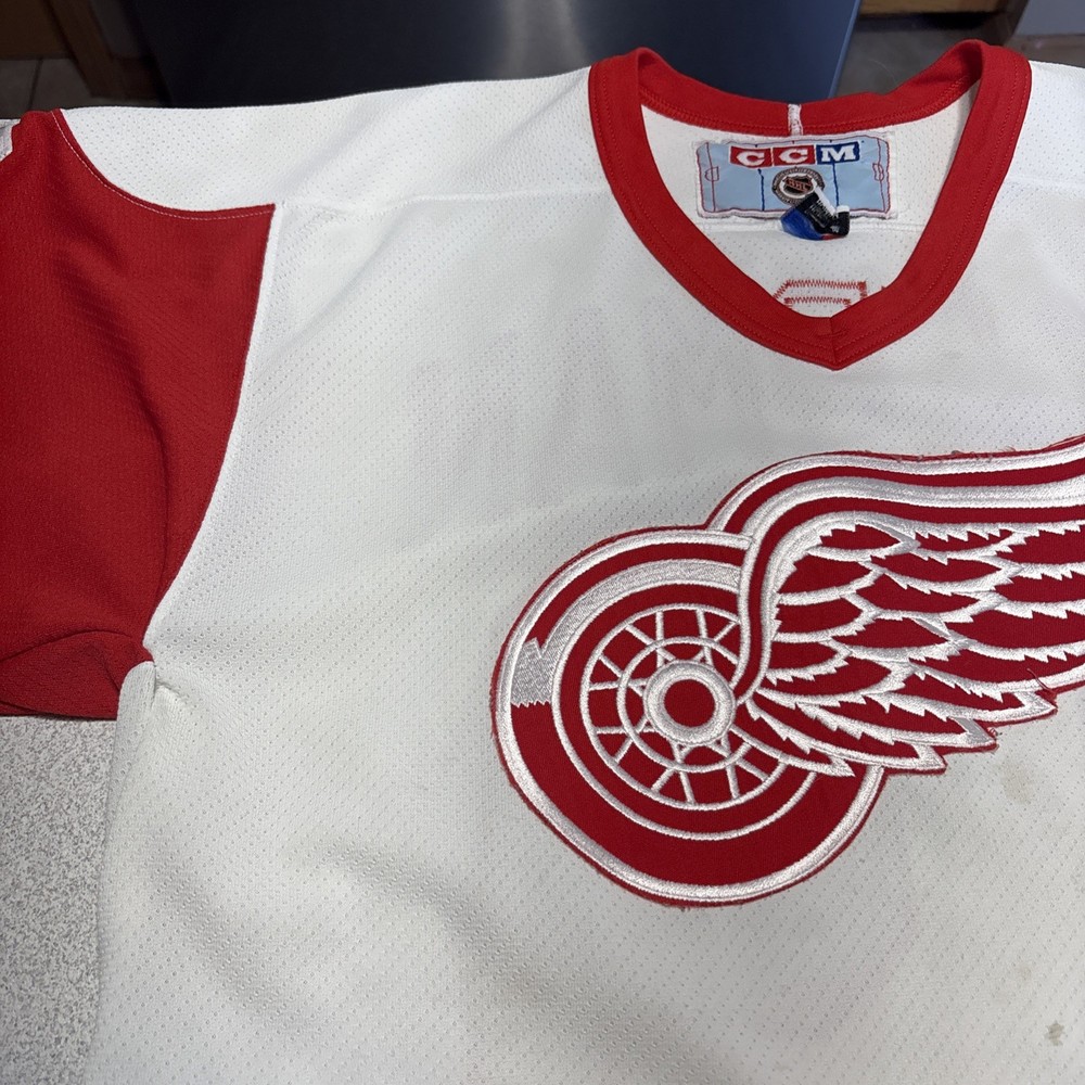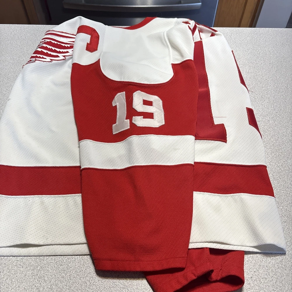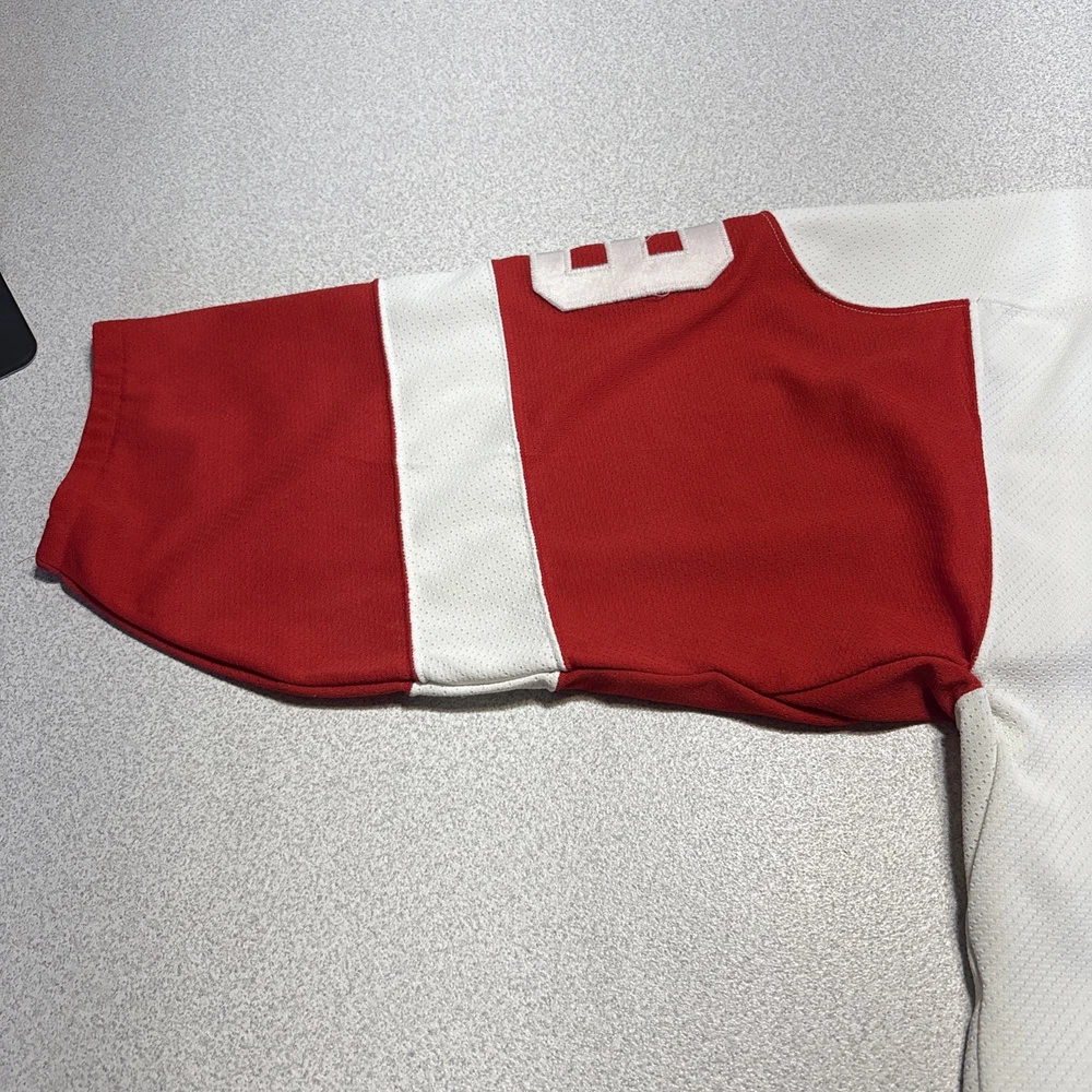 This Vintage Y2K Detroit Red Wings Steve Yzerman #19 Hockey CCM Jersey in size Medium is a classic piece of sports memorabilia. Made with a striped white jersey fabric and featuring an embroidered Yzerman character on the back, this athletic fit shirt is perfect for any fan of the Red Wings and Yzerman. The long sleeves and V-neck design make it a comfortable and stylish choice for any casual outfit, while the lightweight and lined construction adds a touch of vintage charm. Machine washable for easy care, this jersey is a must-have for any collector or fan of the sport. Has some stains and wear (see photos)
