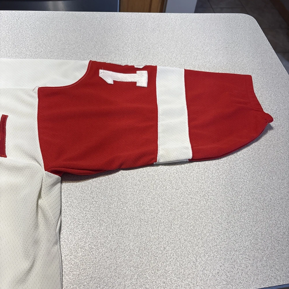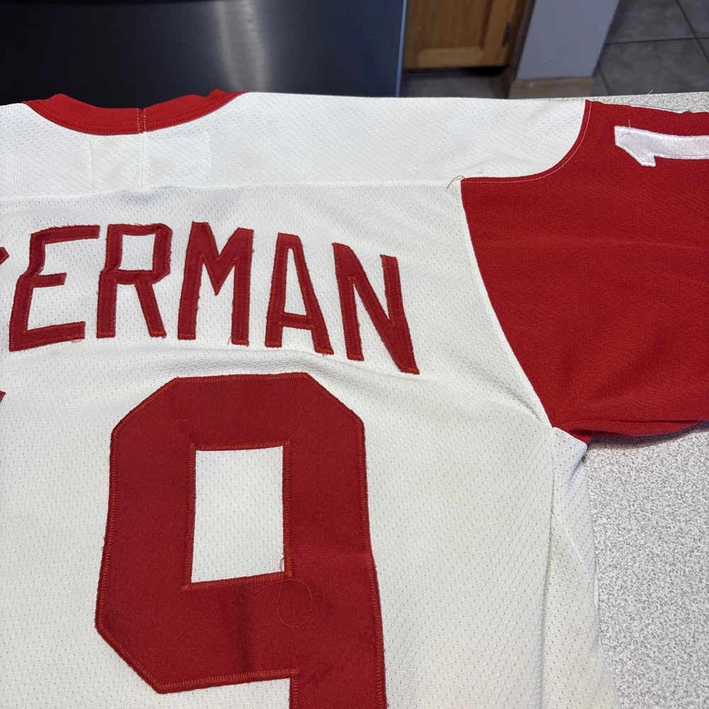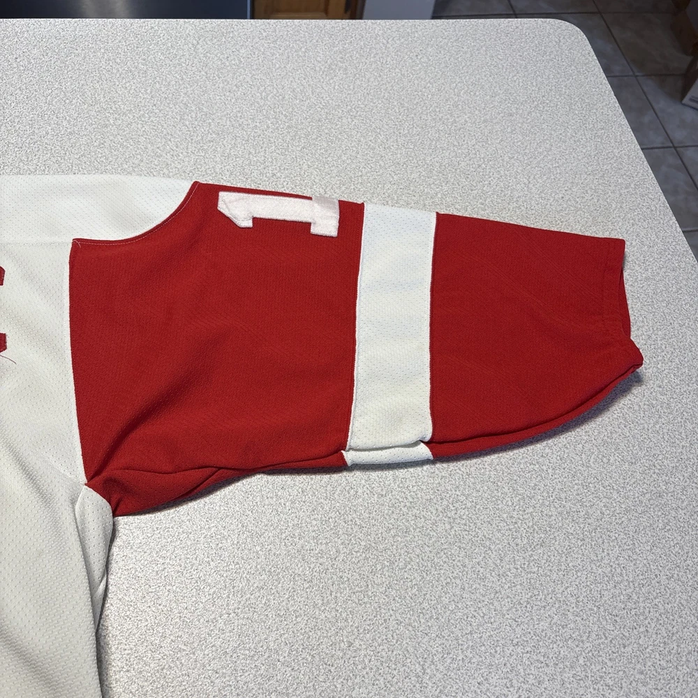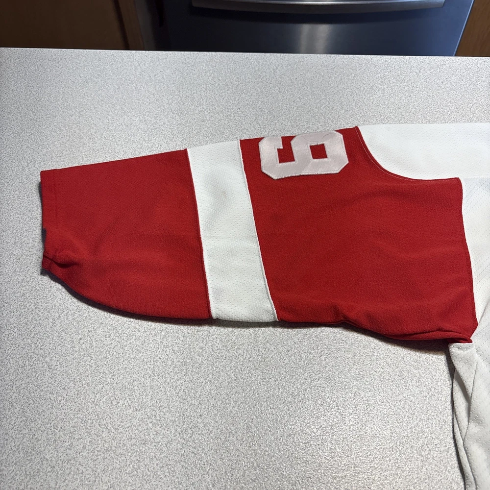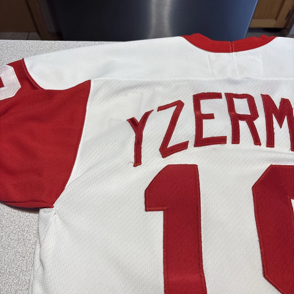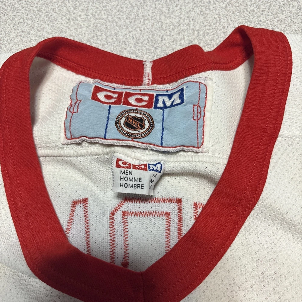 This Vintage Y2K Detroit Red Wings Steve Yzerman #19 Hockey CCM Jersey in size Medium is a classic piece of sports memorabilia. Made with a striped white jersey fabric and featuring an embroidered Yzerman character on the back, this athletic fit shirt is perfect for any fan of the Red Wings and Yzerman. The long sleeves and V-neck design make it a comfortable and stylish choice for any casual outfit, while the lightweight and lined construction adds a touch of vintage charm. Machine washable for easy care, this jersey is a must-have for any collector or fan of the sport. Has some stains and wear (see photos)