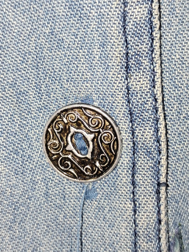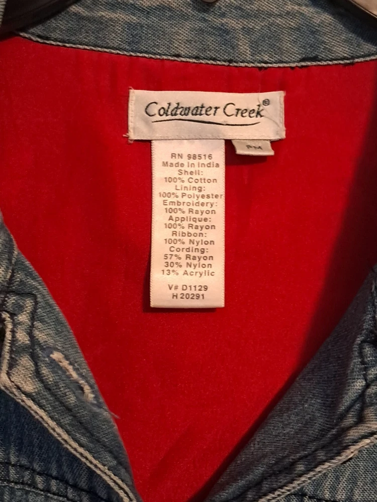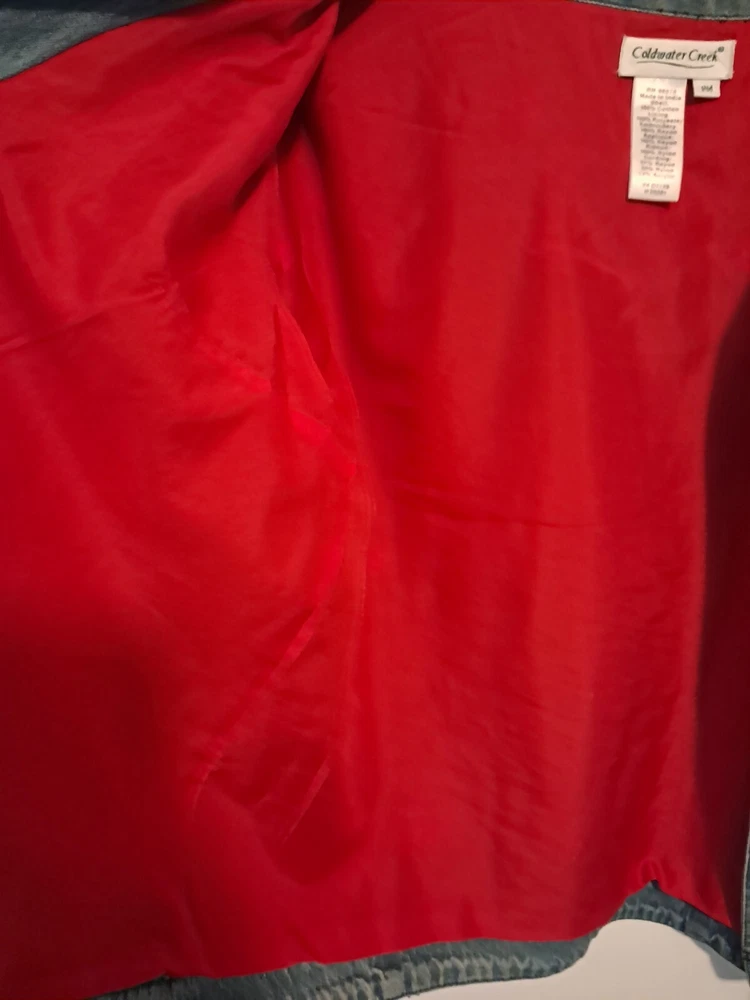 This vintage Coldwater Creek jacket is a unique piece that features a patchwork of floral embroidered denim. The jacket has a short length with long sleeves and a collared neckline. It is made of cotton outer shell material with a polyester lining and insulation material. The jacket is decorated with button closure and decorative buttons that add a bohemian touch to the overall look. The jacket is a regular fit and is available in petite size. This item is a must-have for any vintage clothing enthusiast.