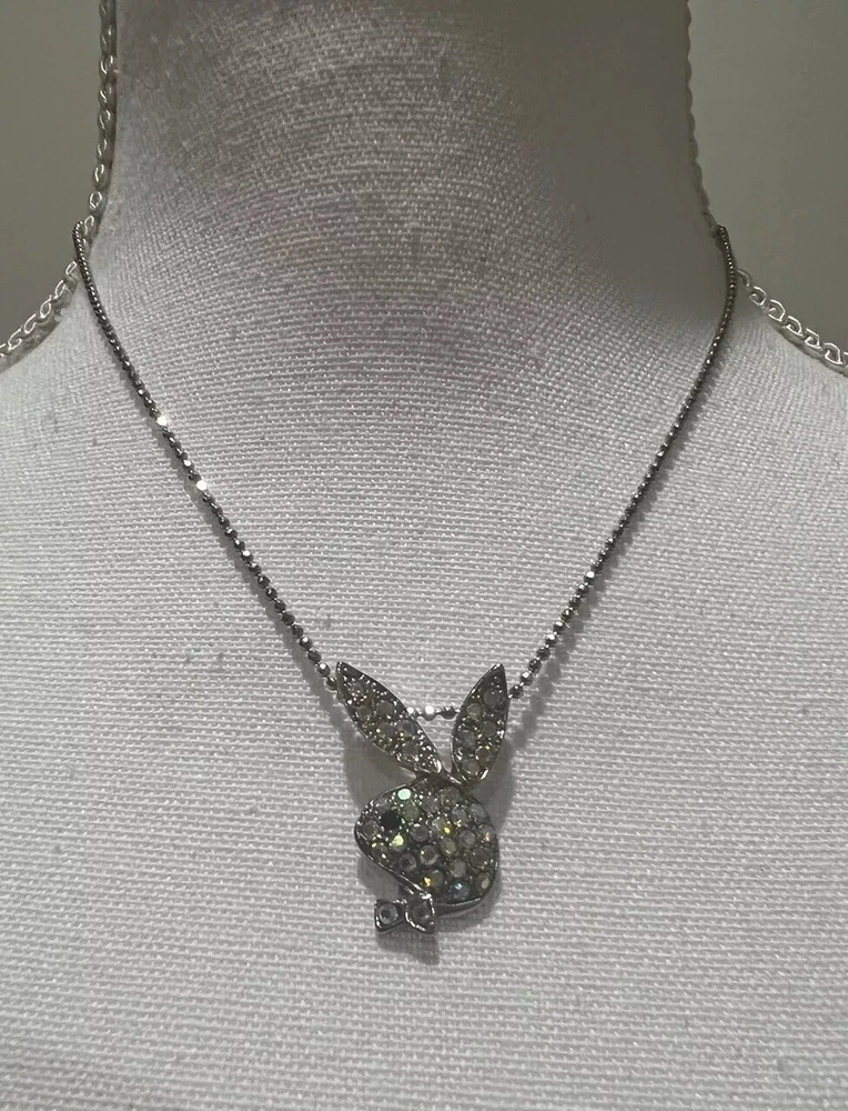 Add a touch of nostalgia to your jewelry collection with this Vintage Y2K Playboy Bunny Pendant Necklace. The necklace features a silver-tone chain with a lobster closure and a rhinestone pendant with a black eye design. The pendant is adorned with multicolor crystal stones that give it a unique and eye-catching look. Perfect for any occasion, this necklace is ideal for graduations, Christmas, birthdays, or Valentine's Day. The necklace has a 16-inch length and is plated with silver metal. This piece is a must-have for anyone who loves vintage jewelry and wants to add a touch of glamour to their outfit.