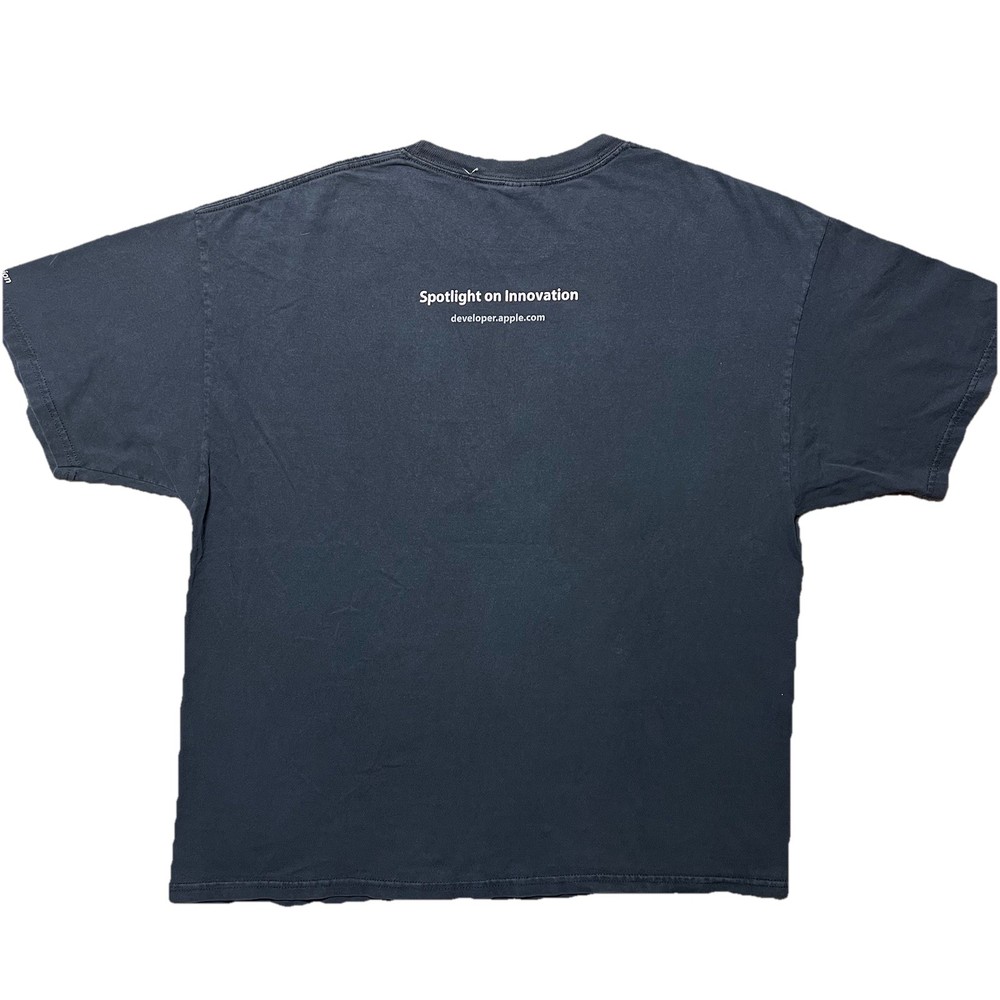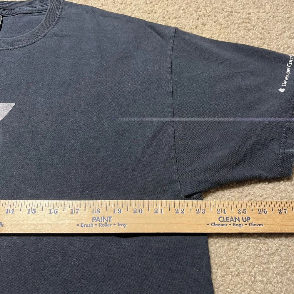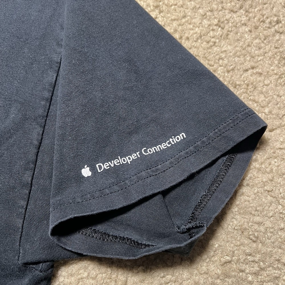 The product is a Vintage Y2K Rare Apple Developer Connection "X" Faded Graphic Logo T-Shirt in XL size. This black tee features a solid pattern with a faded logo accent, short sleeves, and a crew neckline. Made of cotton knit fabric, it is machine washable and has a regular fit. This 90s themed shirt is perfect for the summer, fall, and spring seasons, and it is a unique addition to any man's wardrobe.