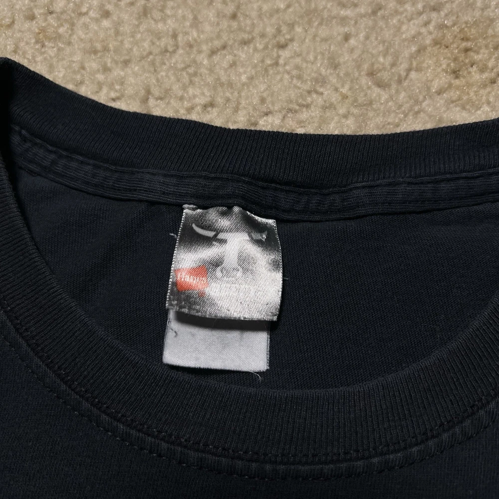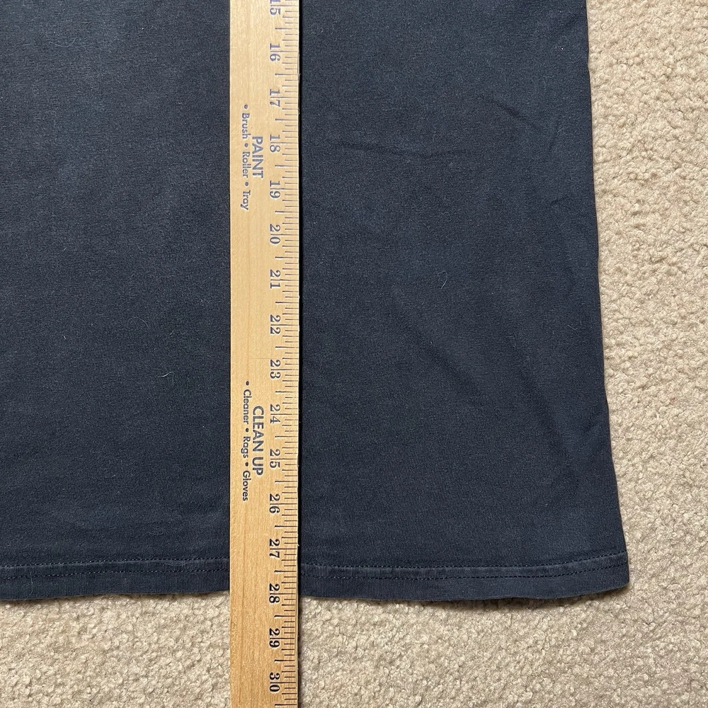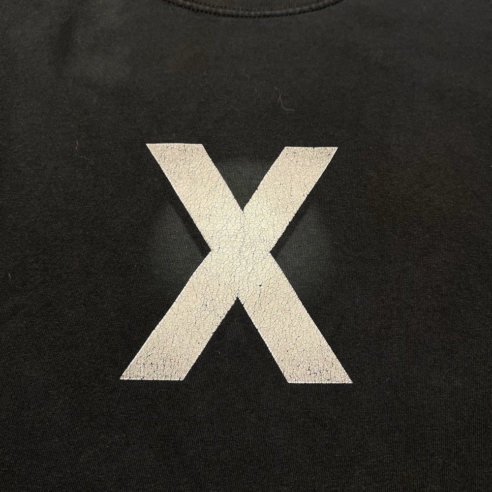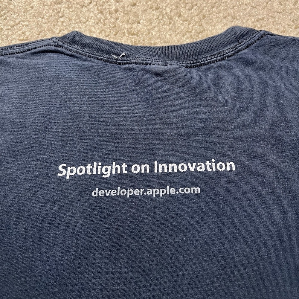 The product is a Vintage Y2K Rare Apple Developer Connection "X" Faded Graphic Logo T-Shirt in XL size. This black tee features a solid pattern with a faded logo accent, short sleeves, and a crew neckline. Made of cotton knit fabric, it is machine washable and has a regular fit. This 90s themed shirt is perfect for the summer, fall, and spring seasons, and it is a unique addition to any man's wardrobe.