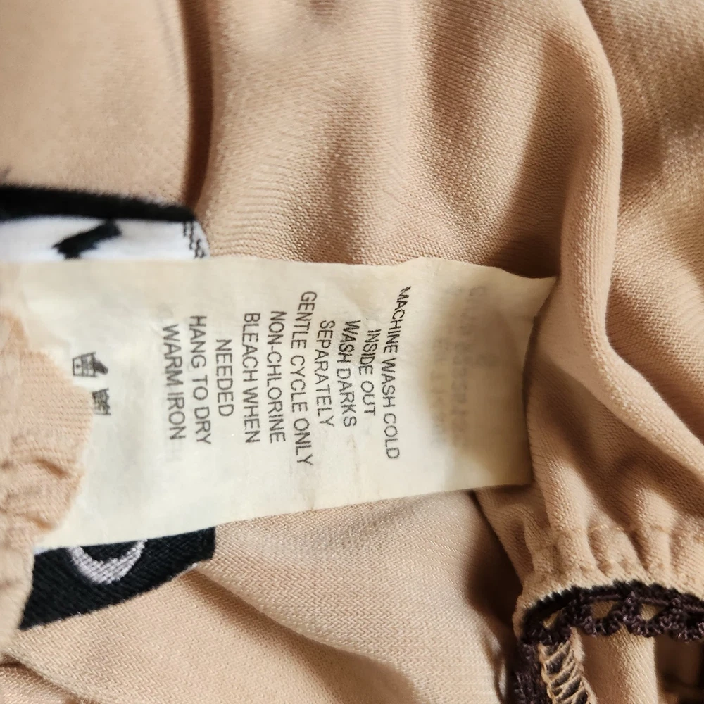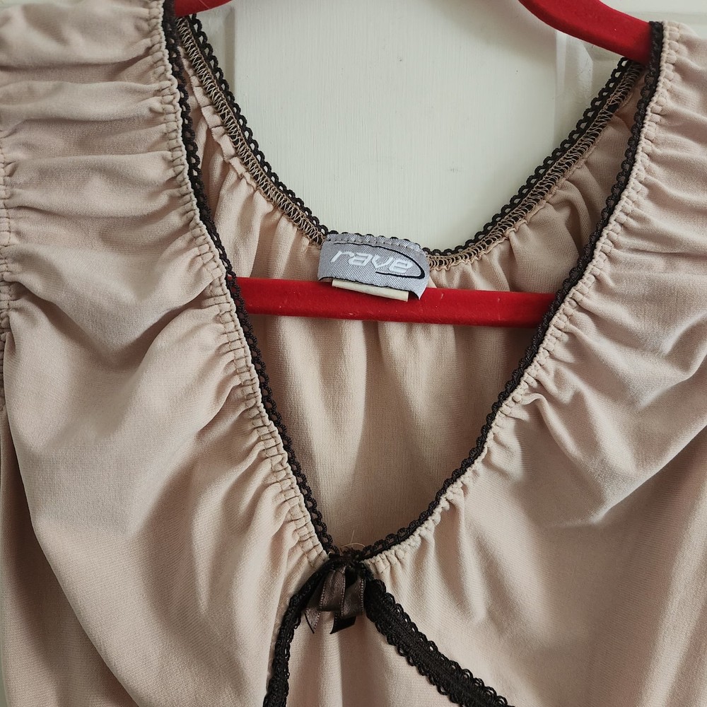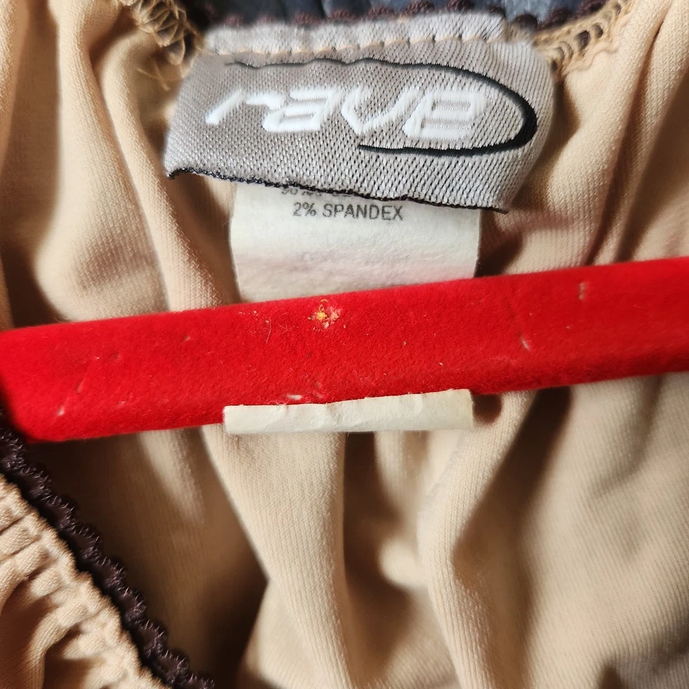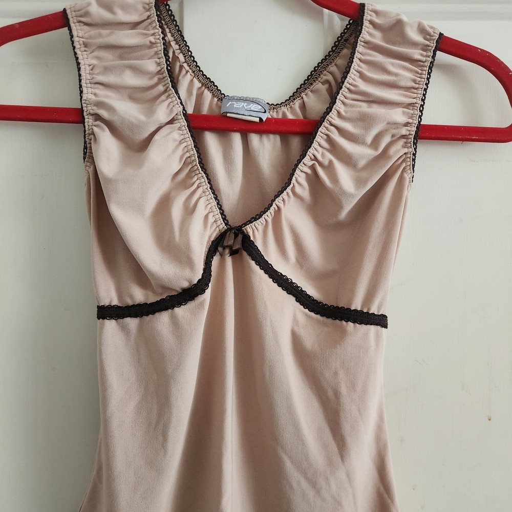 The Vintage Y2K Rave Women's Top in beige with brown trim is a stylish and trendy piece perfect for casual occasions. This sleeveless blouse features a V-neckline and is made from a comfortable polyester blend material. With a size small fit and a regular size type, this top is a basic style ideal for the summer and spring seasons. The tie back shirt design adds a unique touch to the overall look, making it a standout piece in any wardrobe. Machine washable for easy care, this vintage item from the brand Rave is a must-have for any fashion-forward woman.