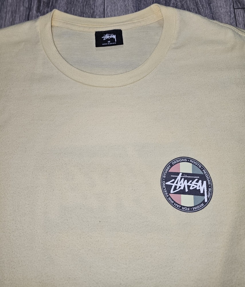 Elevate your wardrobe with this vintage Y2K Stussy Classic Dot Logo T-Shirt in beige. Made from comfortable knit cotton fabric, this classic fit t-shirt features a crew neck, short sleeves, and a graphic print with the iconic Stussy logo. Perfect for all seasons, this t-shirt is easy to care for and machine washable. With its timeless design and skate-inspired character, this Stussy t-shirt is a must-have for any fashion-conscious man. Whether you're hitting the beach or running errands, this versatile t-shirt is suitable for any occasion. Add a touch of vintage style to your wardrobe with this medium-sized t-shirt, made in Mexico during the early 2000s.