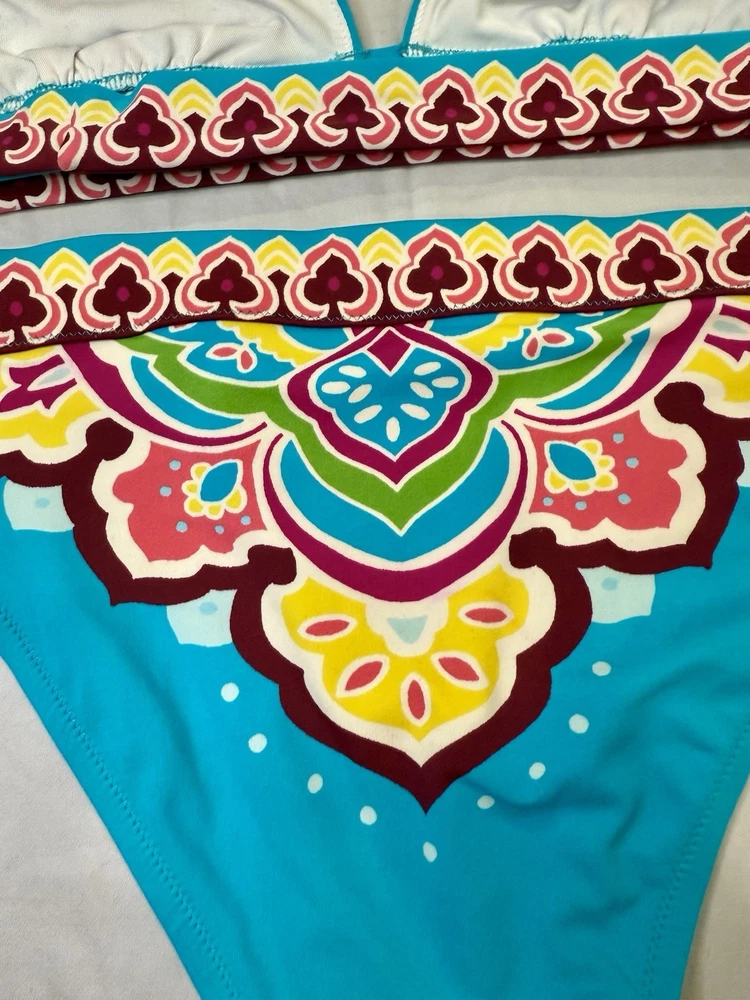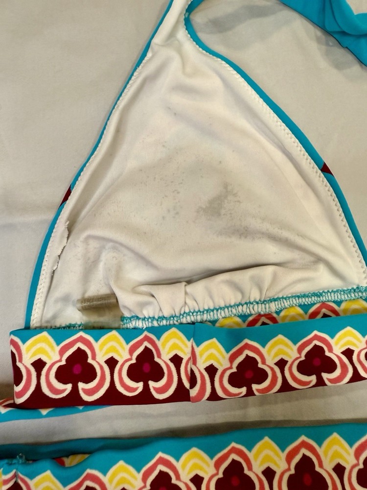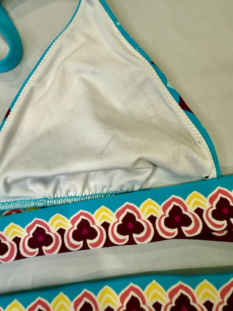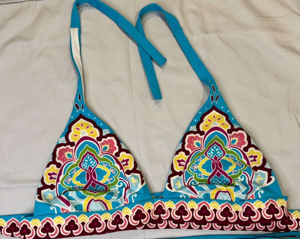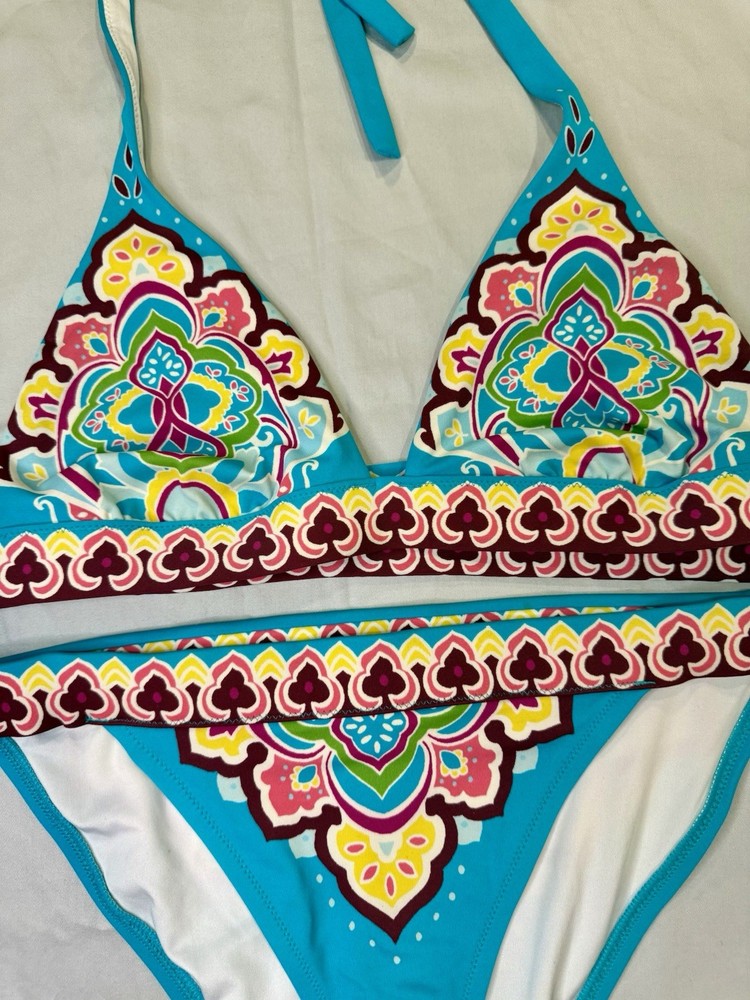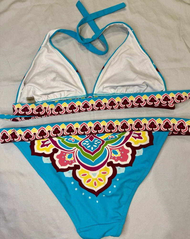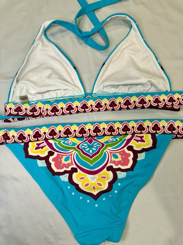 The Vintage Y2K “Tattoo” Victoria’s Secret bikini in size medium features a blue multi-color tattoo pattern on a 2-piece bikini set. The triangle halter top and bikini bottom style make it a stylish and fun choice for any beach or pool day. The Victoria's Secret brand adds a touch of luxury and nostalgia to this trendy swimwear piece, perfect for women looking to make a statement with their swimwear choices.