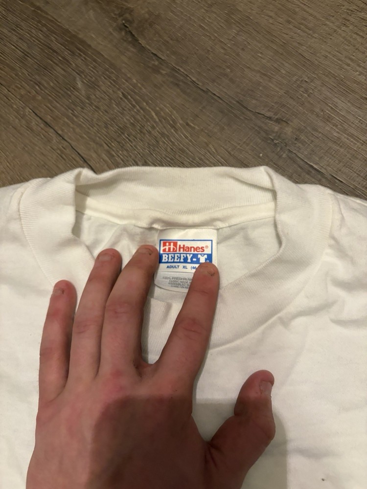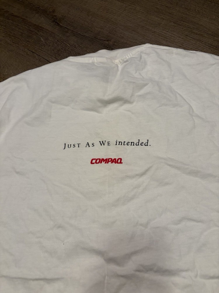 The Vintage Y2K VTG COMPAQ Computers Hanes Beefy T Size XL White T-Shirt is a nostalgic piece from the 90s featuring a solid white color with a crew neck and short sleeves, making it a comfortable and stylish option for men. This heavyweight cotton shirt is machine washable and includes a logo accent, perfect for tech enthusiasts and fans of retro computing. The XL size and regular fit ensure a comfortable and flattering look, while the vintage design adds a unique touch to any wardrobe.