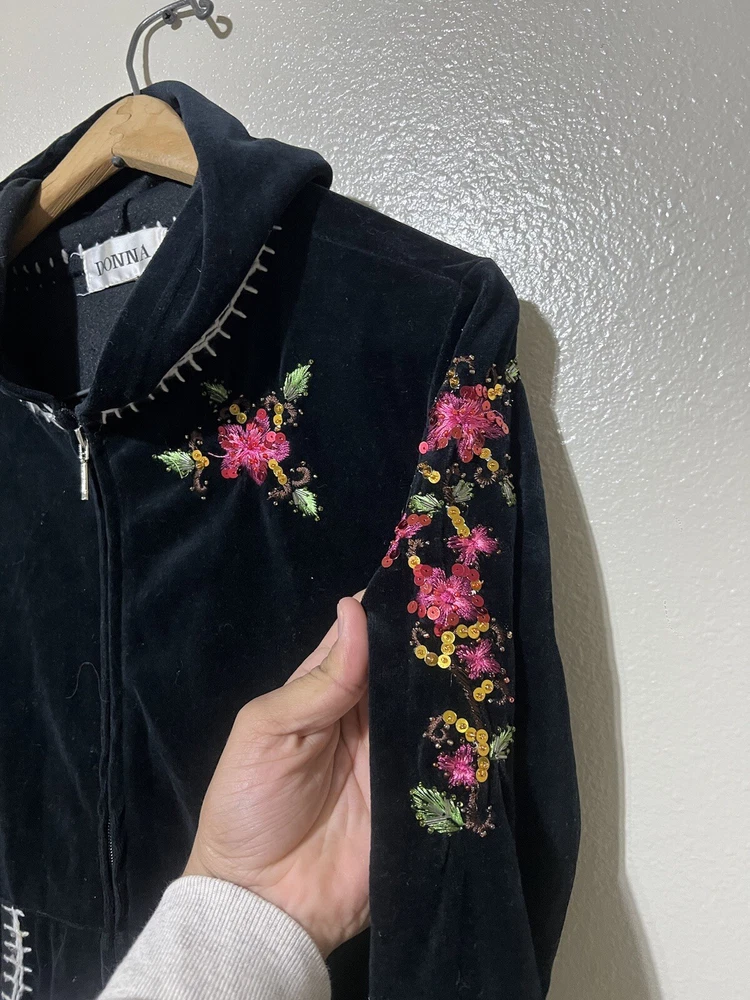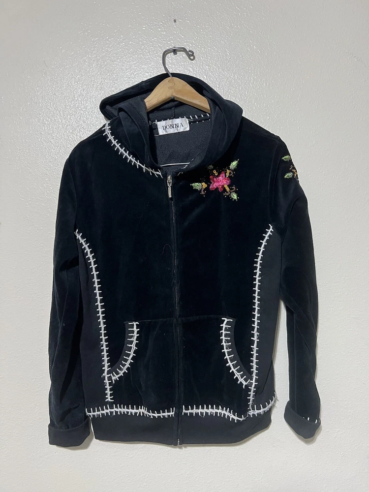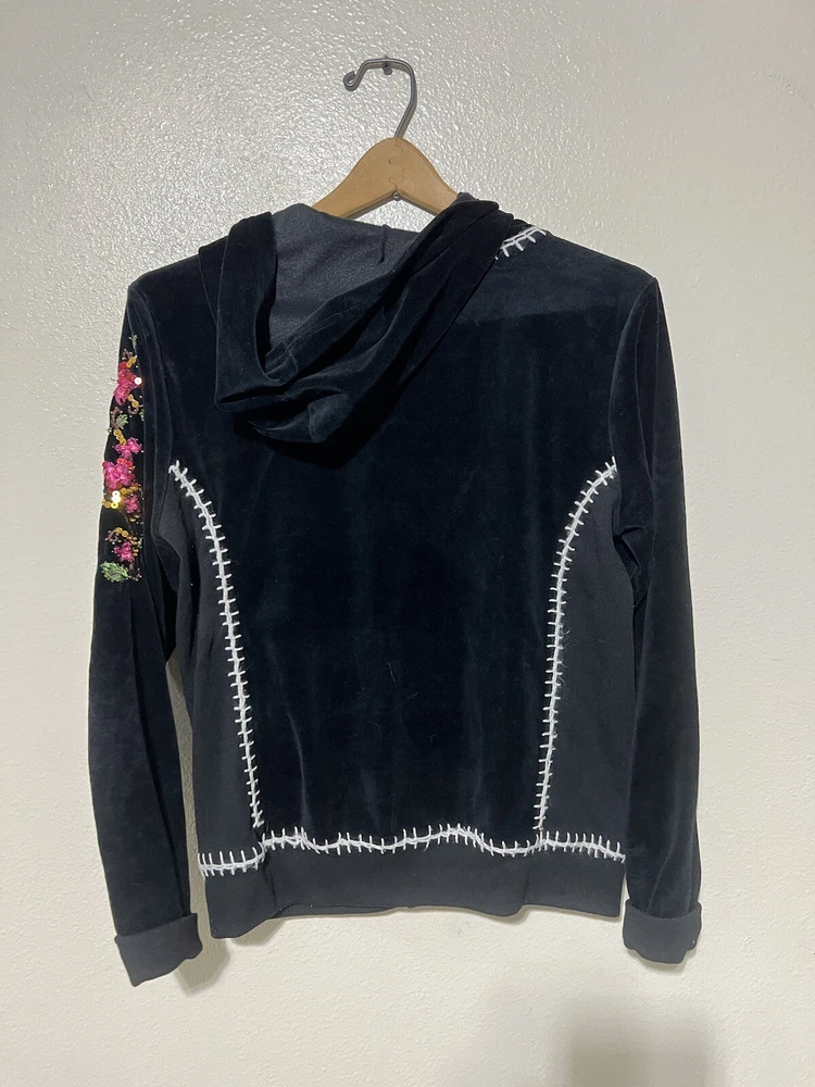 Vintage Y2K Women’s Suede Embroidered Zip-Up Black Hoodie Size Large 2000s VTG