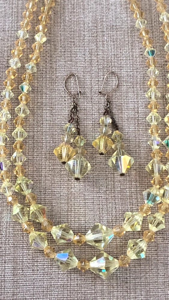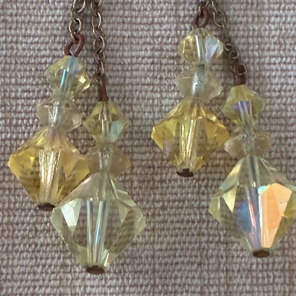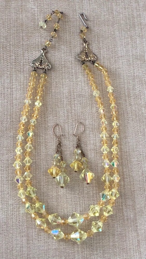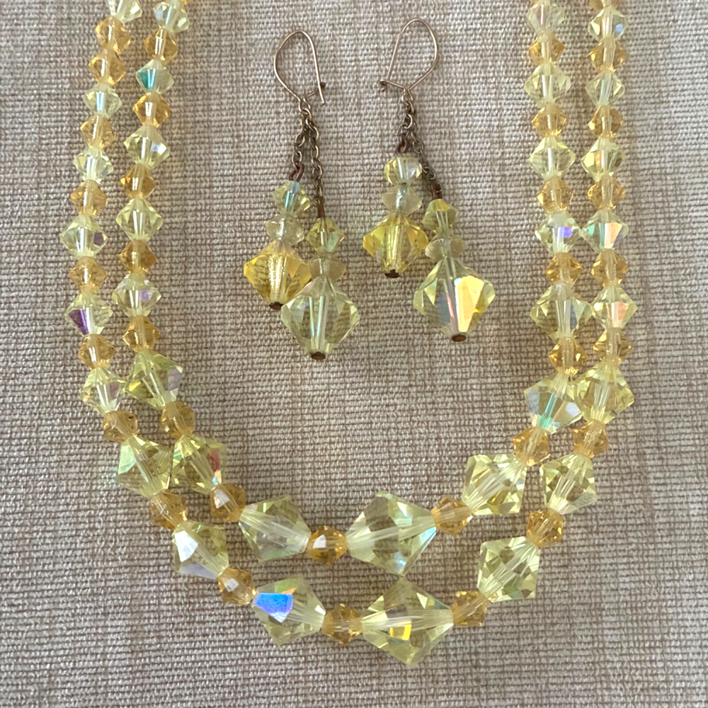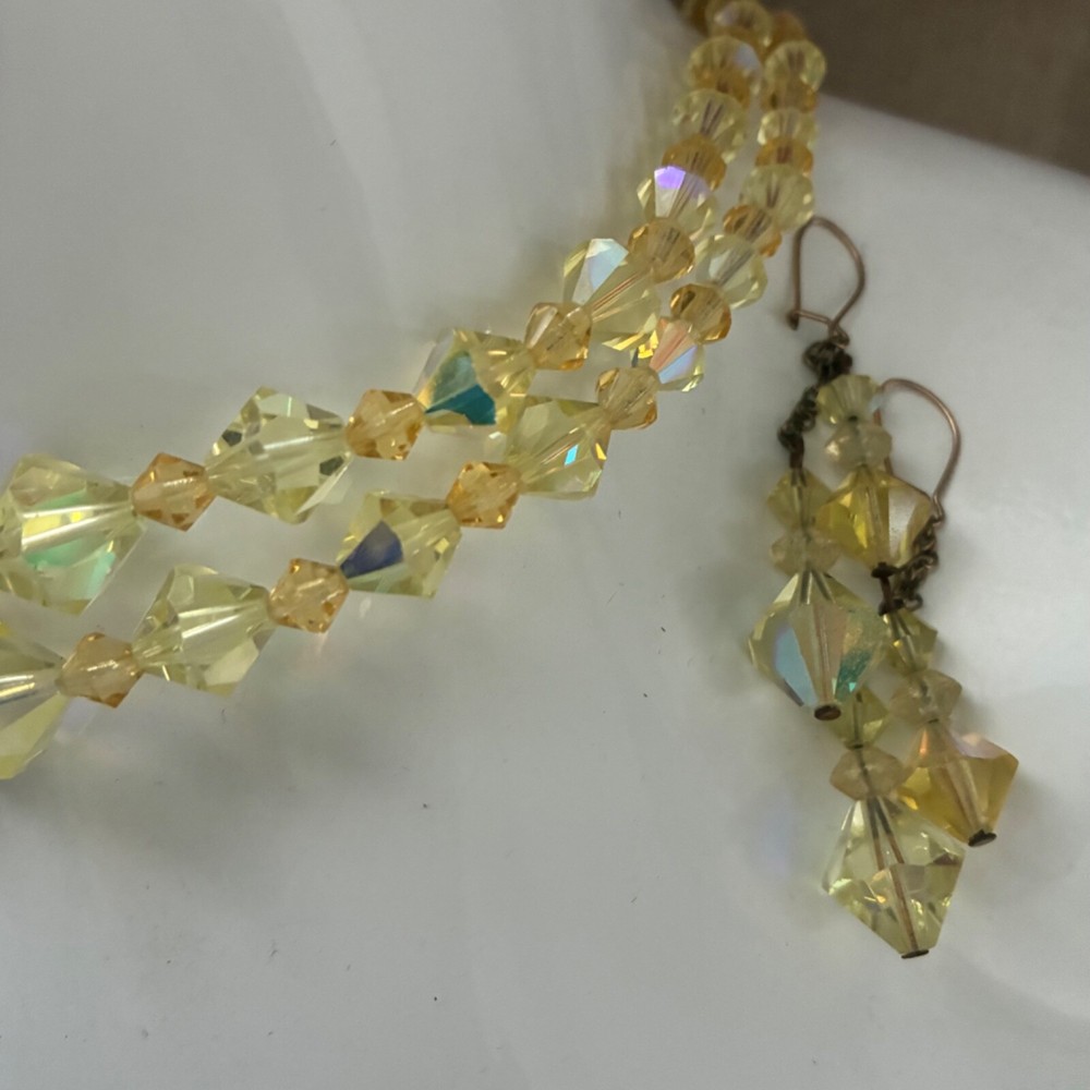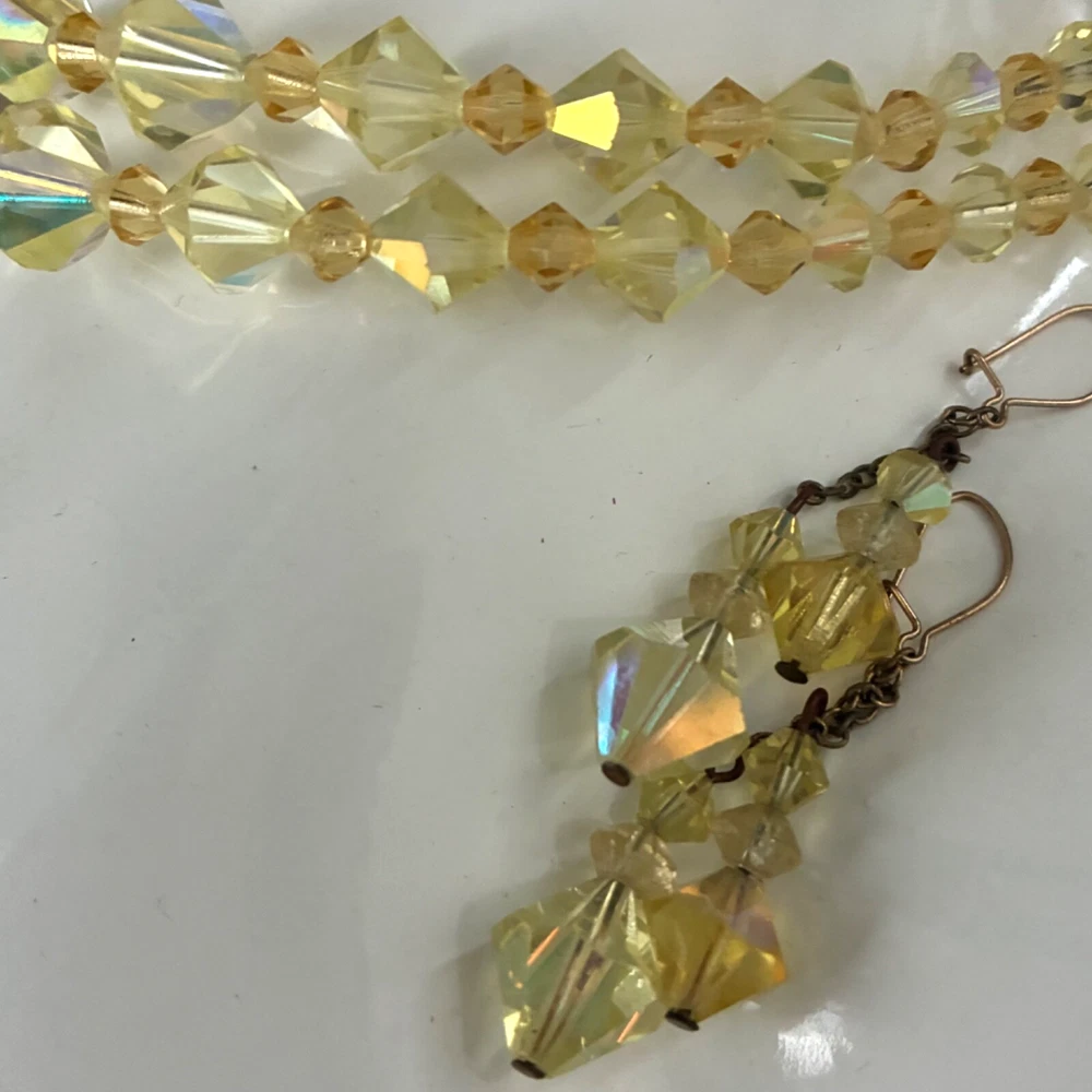 Vintage 1950s Yellow Aurora Borealis (AB) Glass Crystal Necklace & Dangle Earrings Set Adjustable J-Hook Necklace Closure - 15"-18" 2" Earring Length w/ Kidney Shape Closures Pre-owed Condition: Very Pretty Appearance - See pics to confirm ( also includes metal discoloration).