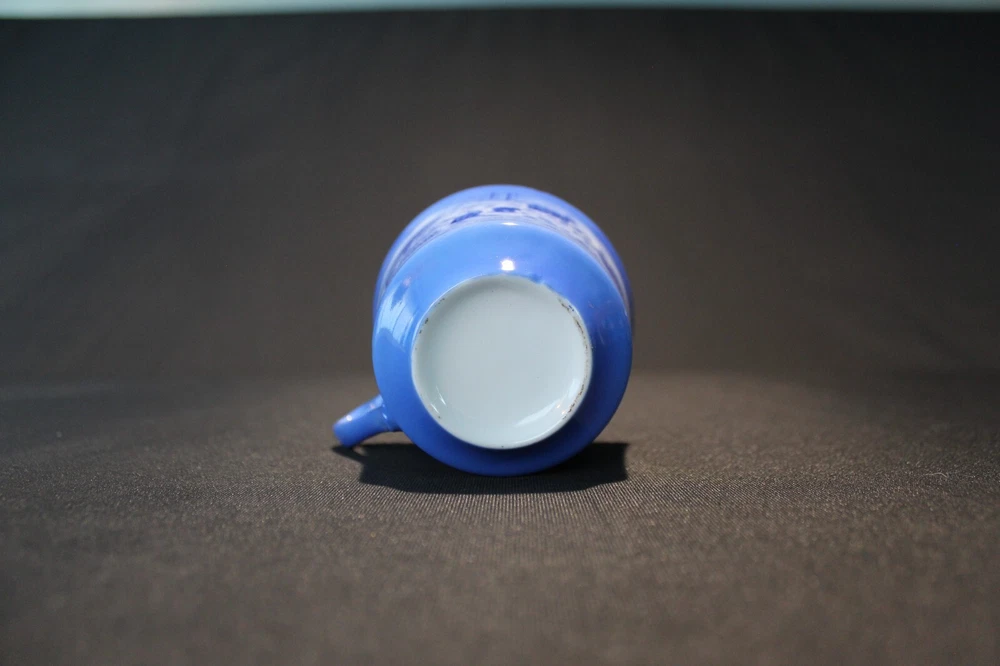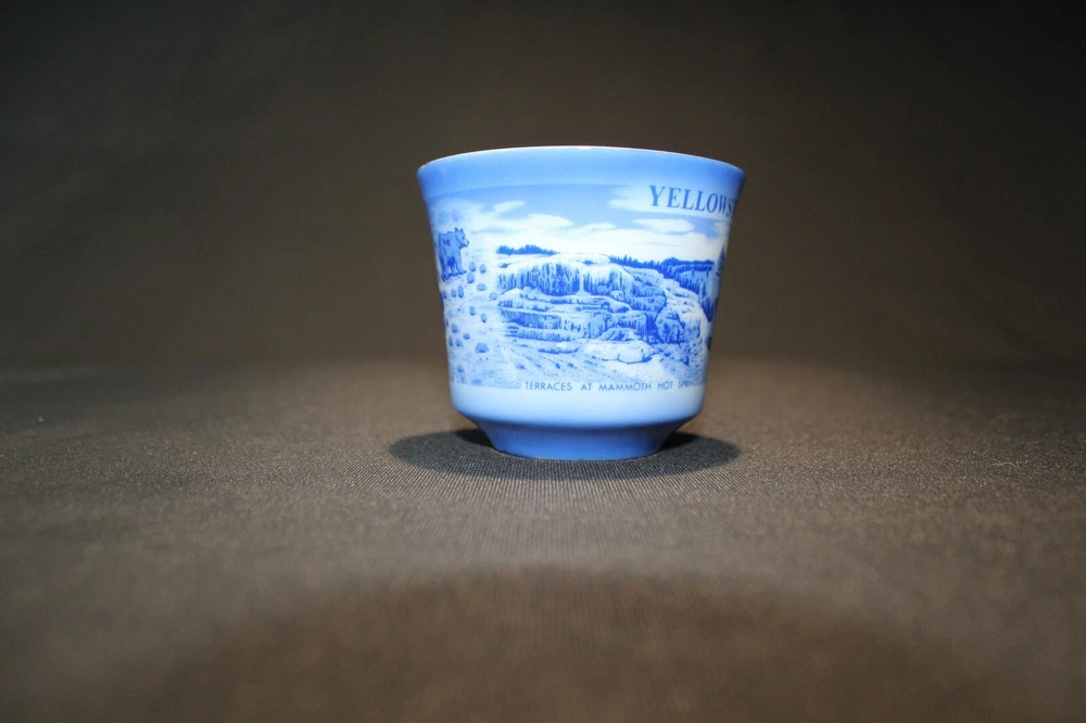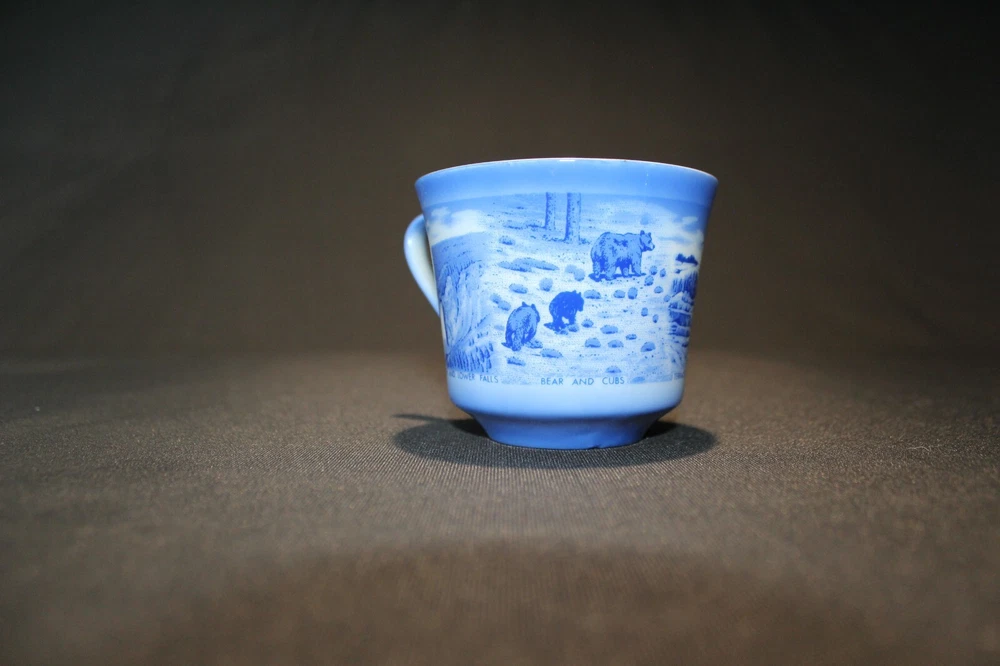 The vintage Yellowstone National Park souvenir mug features a blue and white design with a sign depicting bears, capturing the essence of the iconic national park. This collectible item serves as a nostalgic remembrance of the park's natural beauty and wildlife. Perfect for enthusiasts of national parks and historical memorabilia, this mug offers a charming glimpse into the past.