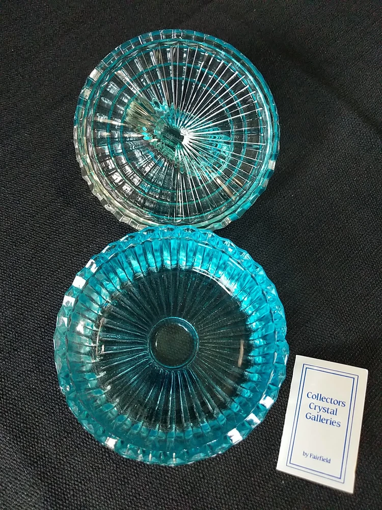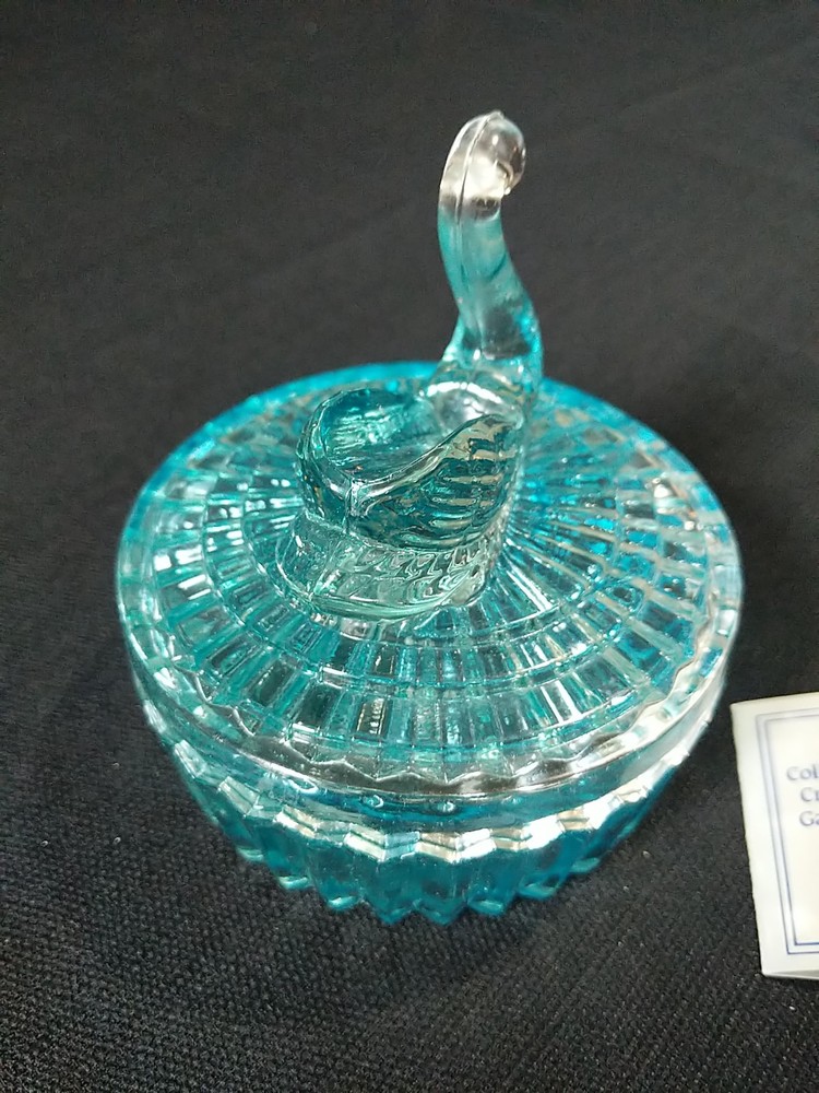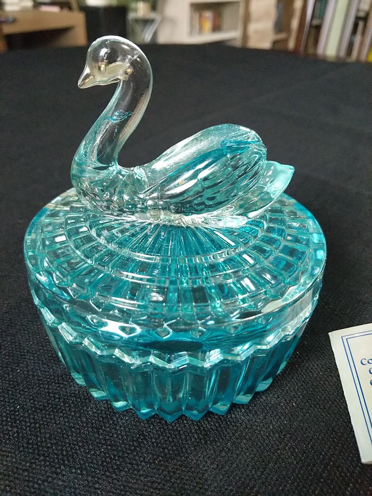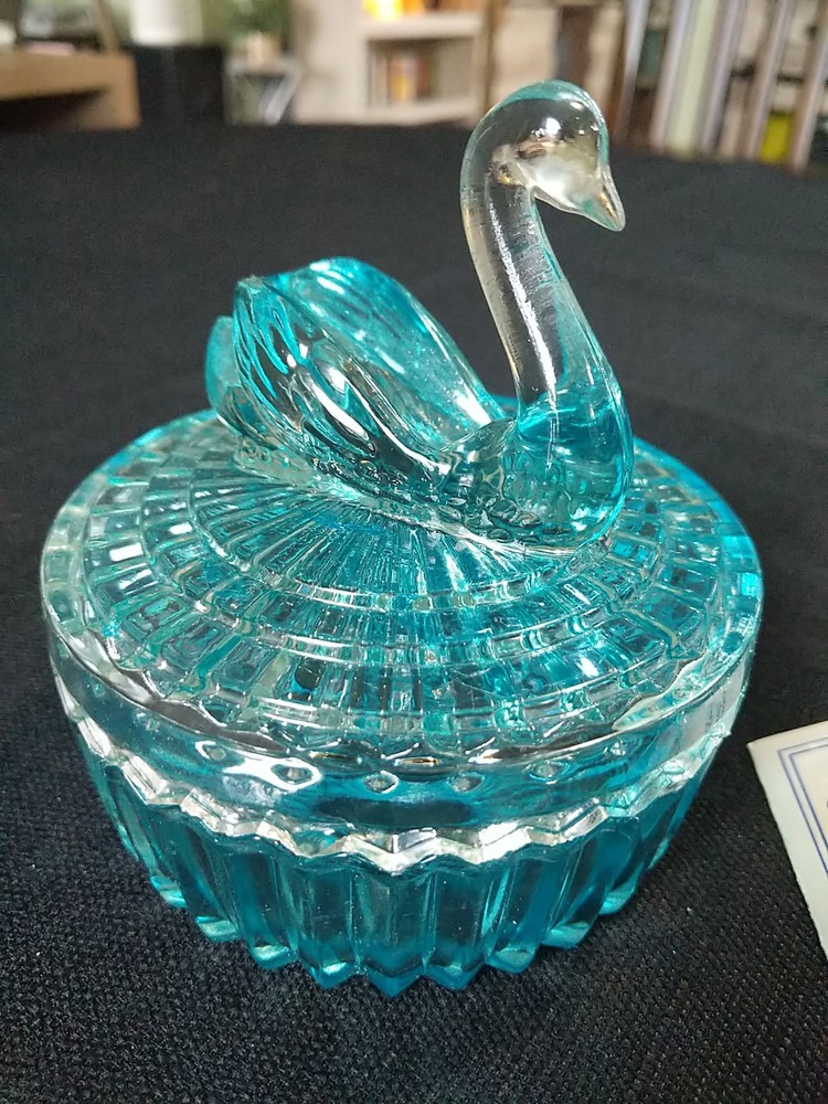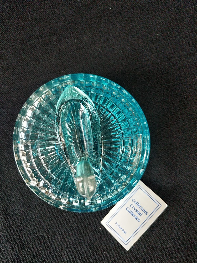 New Open Box. Blue Swan. A crystal candy dish or trinket dish made by Zajecar in Yugoslavia. The dish is crafted from 24% lead crystal, known for its quality and clarity. It features intricate design and is suitable for various decorative purposes. T8 jh