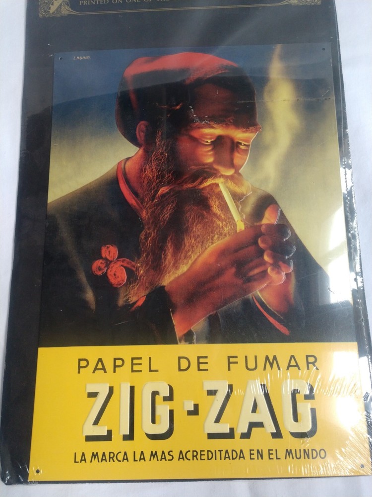Zig Zag Cigarette Rolling Papers Tobacco Gas Oil 60s 70s And Embossed Metal Sign. In original, unopened packaging as shown. Sign is 16 3/4" x 11 3/4". Perfect for a man cave, garage, or home decor.