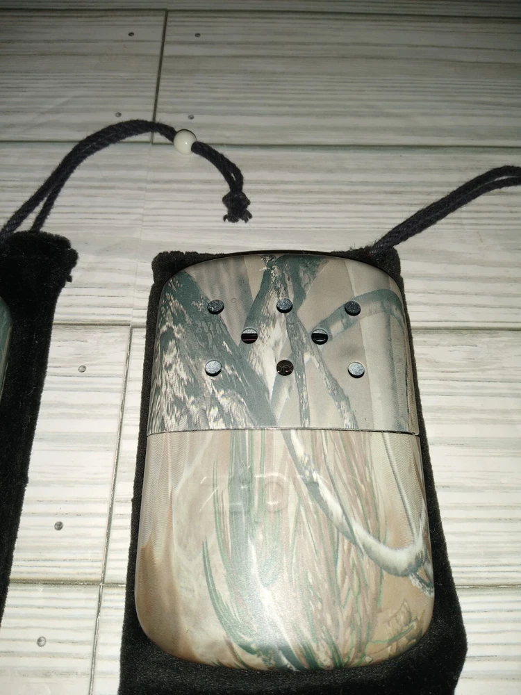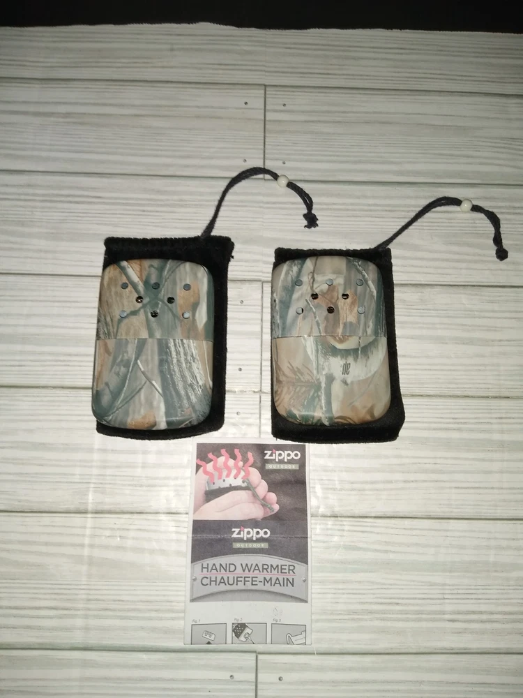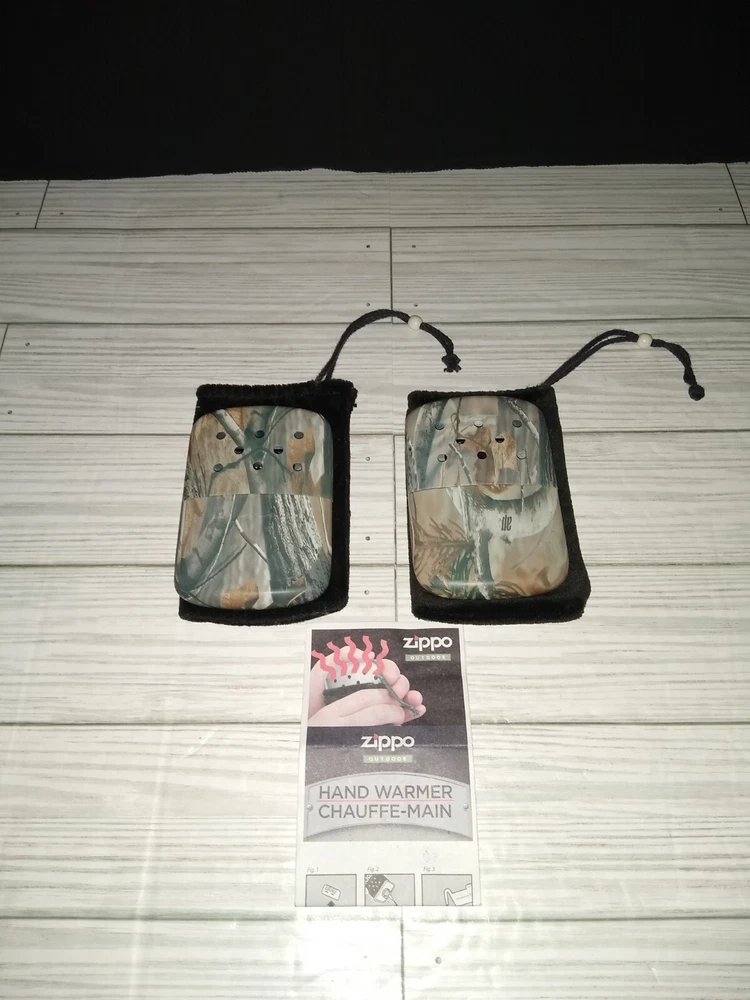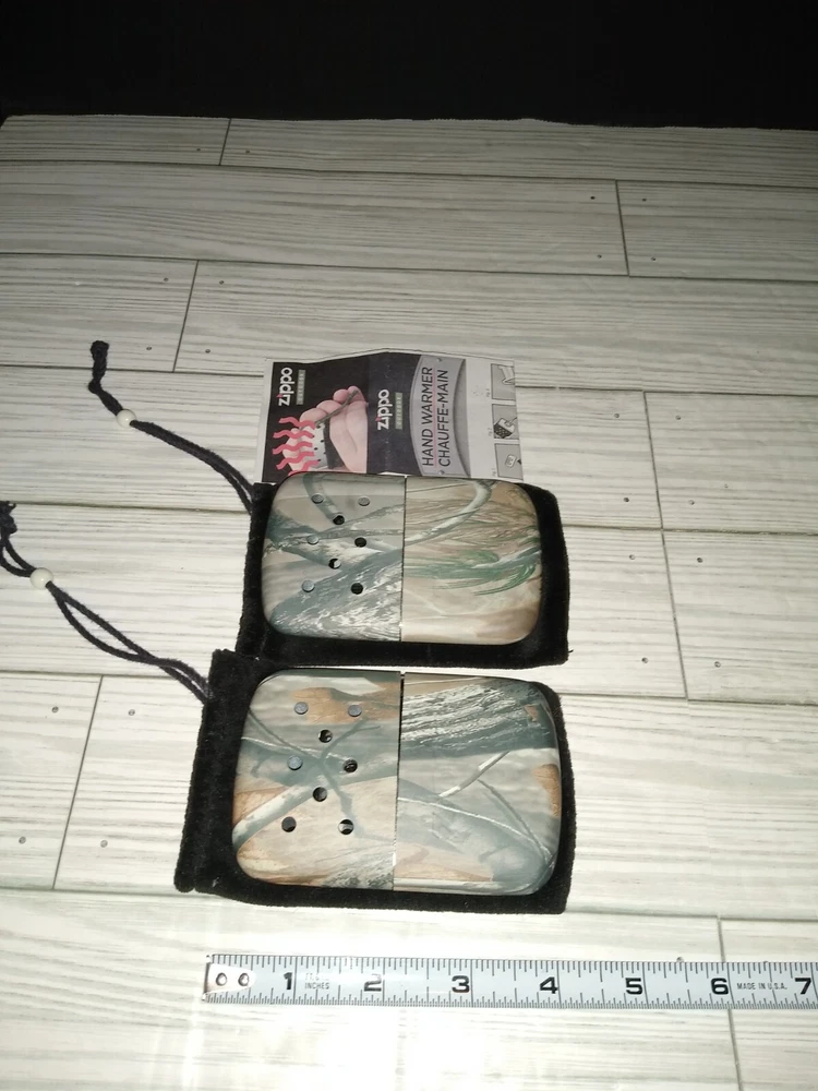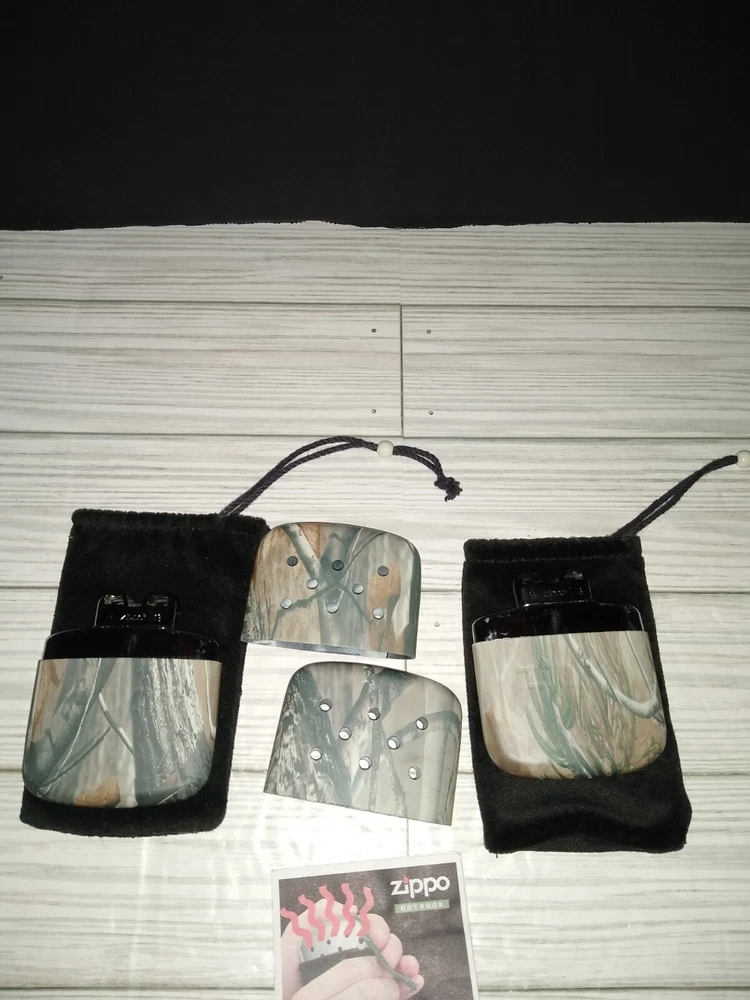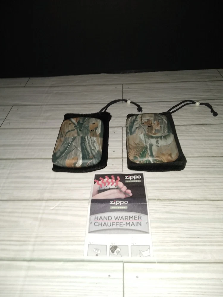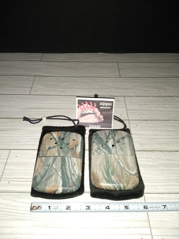 Vintage Zippo Outdoor Camping Hunting Hand Warmers With Camo Print. The caps fit loose. Has wear from age use and storage. See pictures. Sold as is.