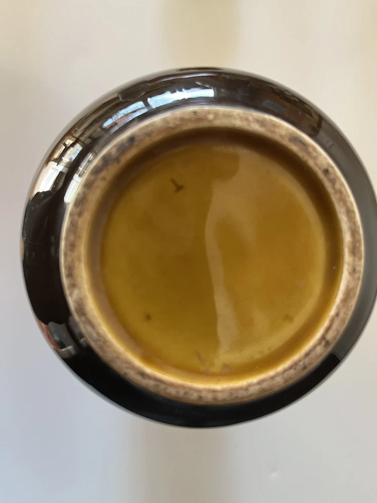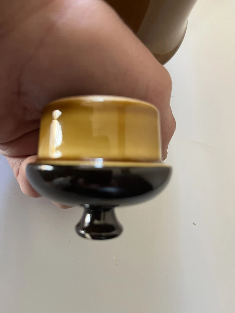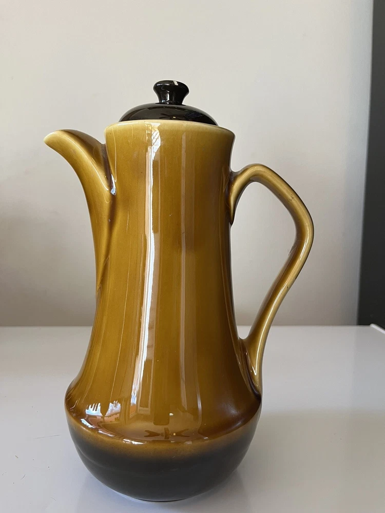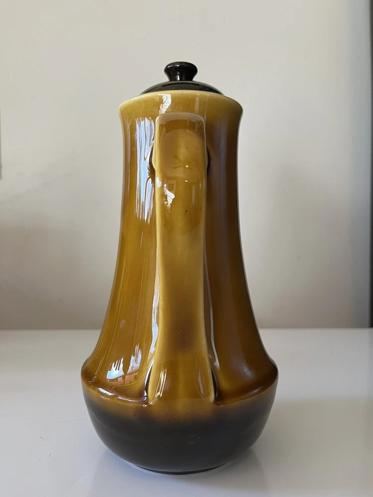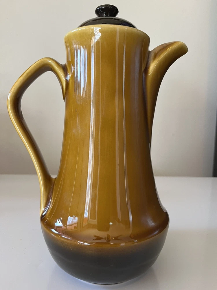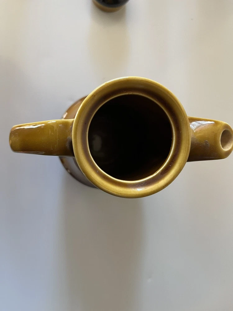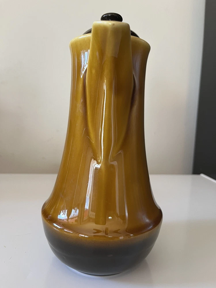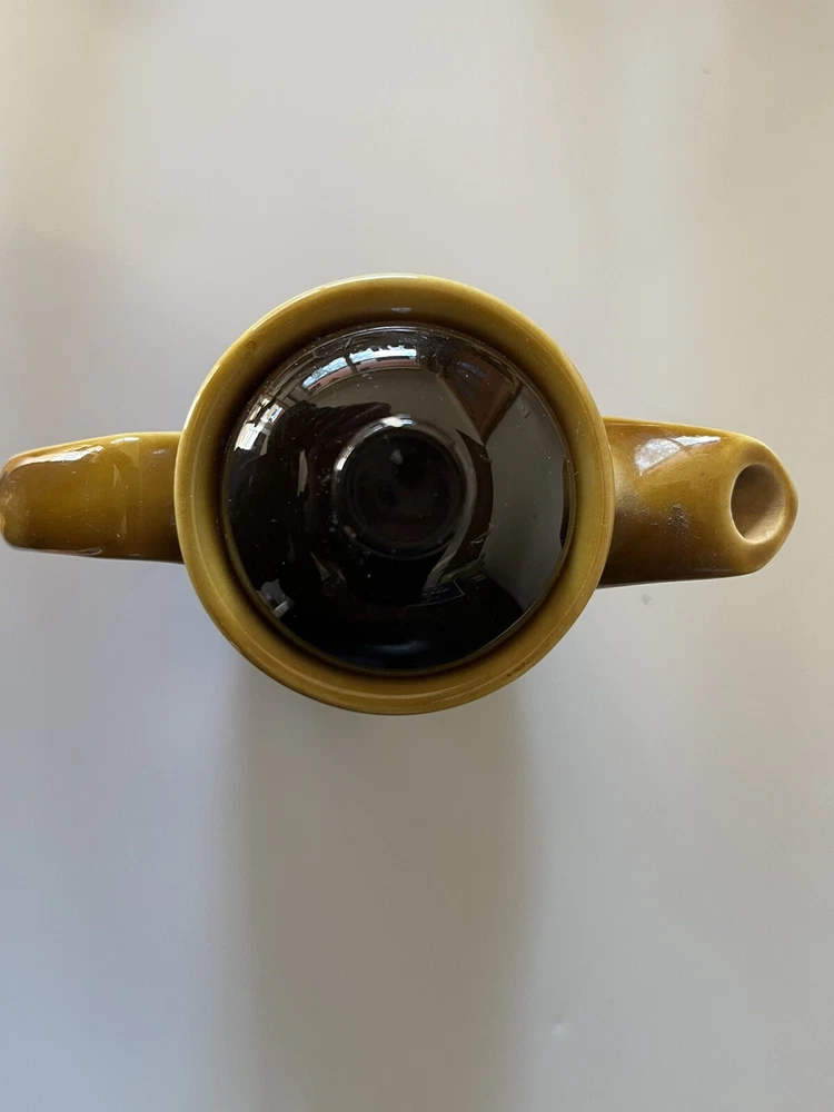 Vintage ceramic teapot. Really neat piece, in good condition. There is a small chip in the finish on the top of the lid. Approximately 7 1/2" wide x 9 1/2" high The only marking I see is a a Capital letter T on the bottom of the teapot.
