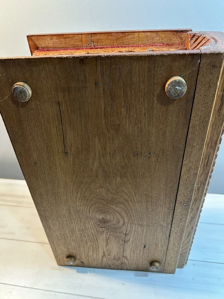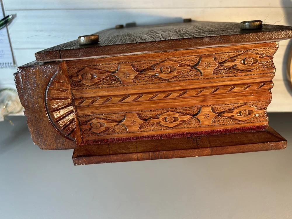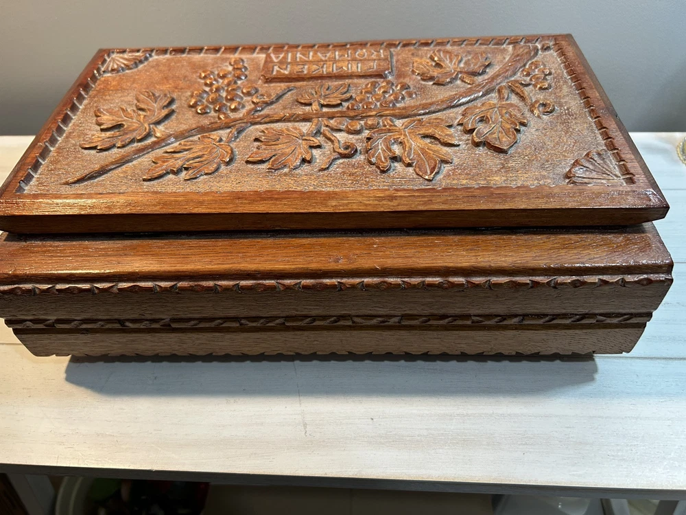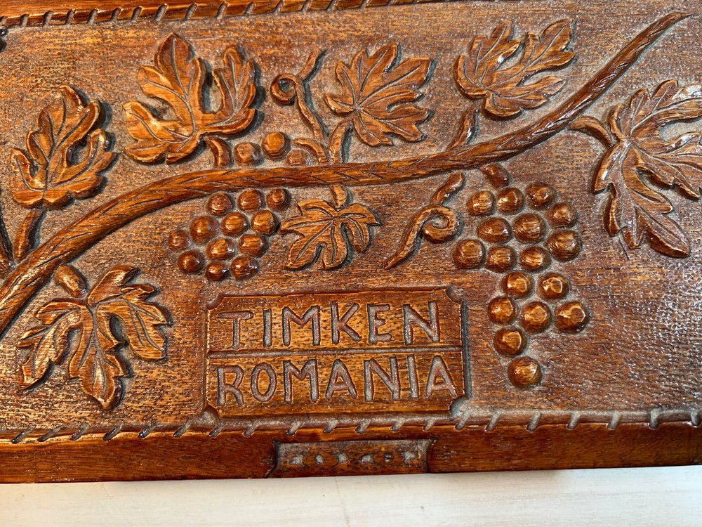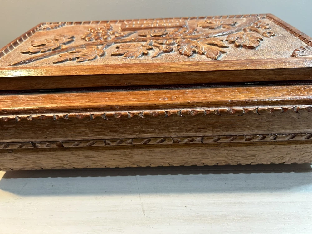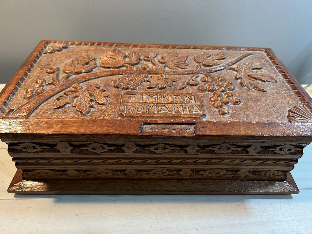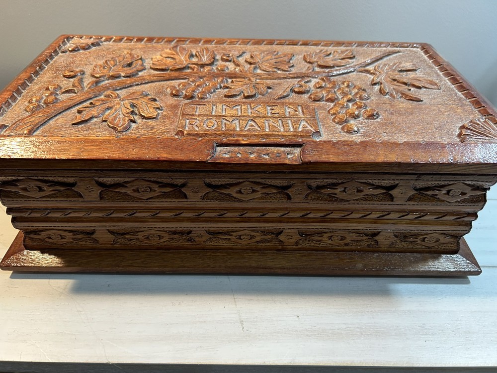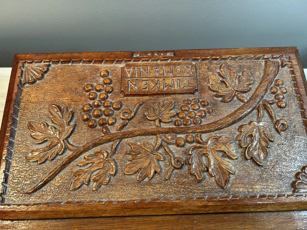 vintage large hand carved Folk Art Wood Box, Leaves , Branches Romania . Box measures 15.5 inches long, 10 inches wide 5 inches tall and 9.5 deep. Not sure of use or origin but beautiful work of art. Very good condition