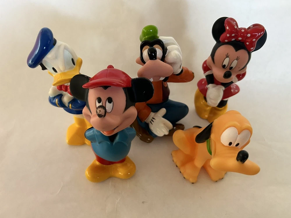 Vintage lot of 5 Disney Bath Toys 1985 Mickey Minnie, Donald, Goofy, Pluto. There are some markings and scratches on them. Worst is Mickeys nose as shown in photo.