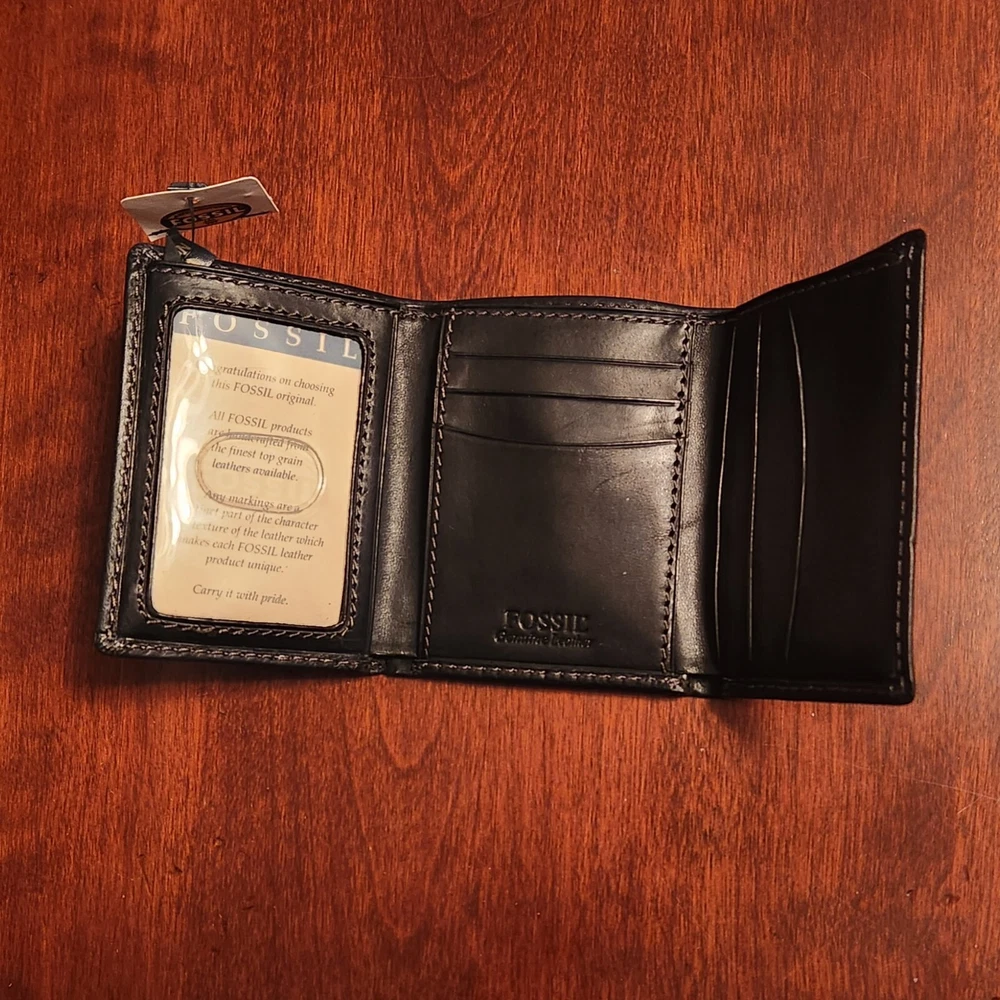Vintage mens fossil leather trifold wallet (New - original box 1954 ) This is a vintage men's Fossil leather trifold wallet in black. The wallet features a classic design with a focus on holding money and credit cards. It is made of high-quality leather and exudes a timeless style. The brand is Fossil, known for its durable and stylish accessories.