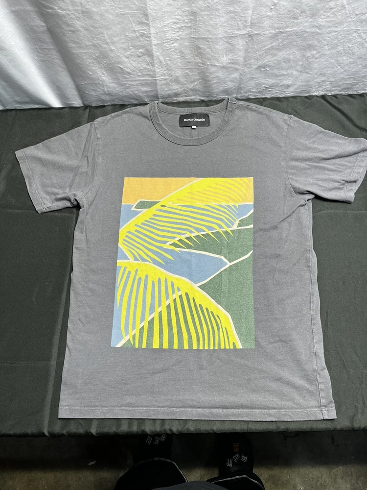 This vintage t-shirt features a stunning abstract landscape with palm fronds, perfect for any nature lover. The shirt is designed with a geometric pattern and is made from high-quality materials, ensuring durability and comfort. The shirt is perfect for those who appreciate unique and eye-catching designs. The t-shirt is a size L and has a regular fit, making it suitable for most men. The shirt is perfect for casual wear and can be paired with jeans or shorts. The shirt is a great addition to any wardrobe and is sure to make a statement.