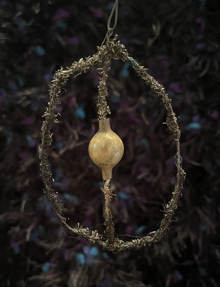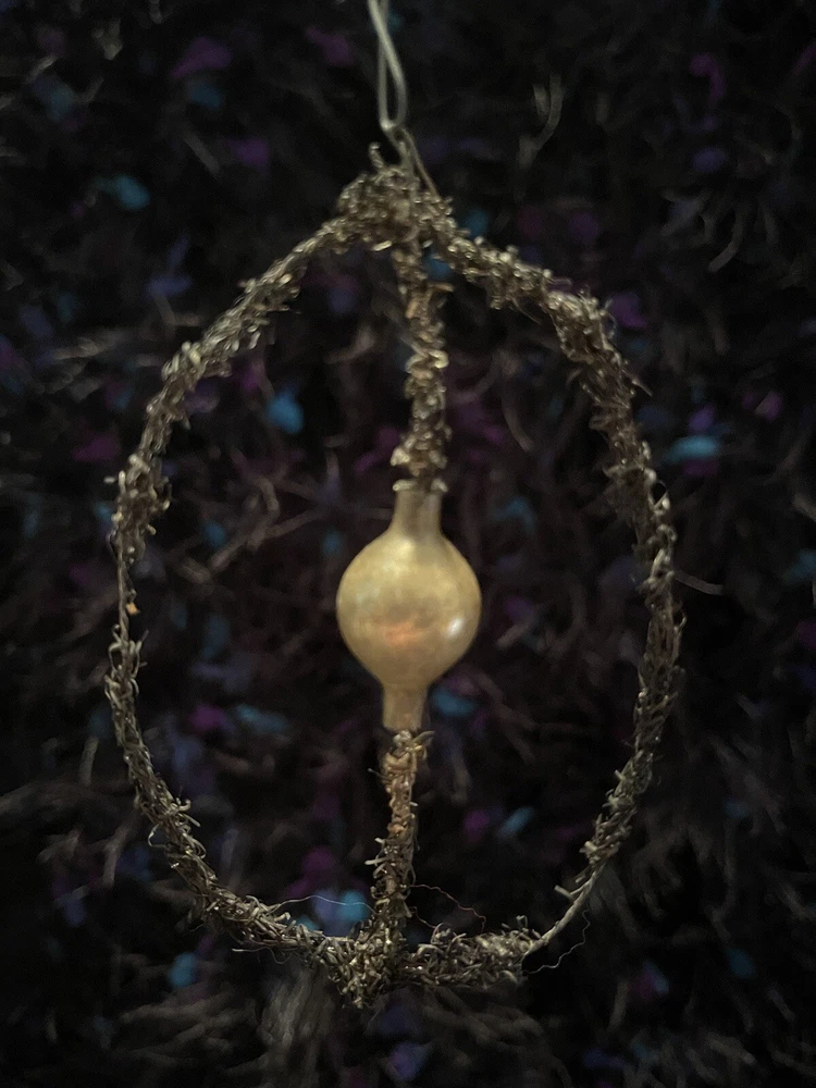 Vintage tinsel Japanese wreath ornament 3.5”, there is a tiny yellow glass ornament in the center Will combine shipping, check out other offers!