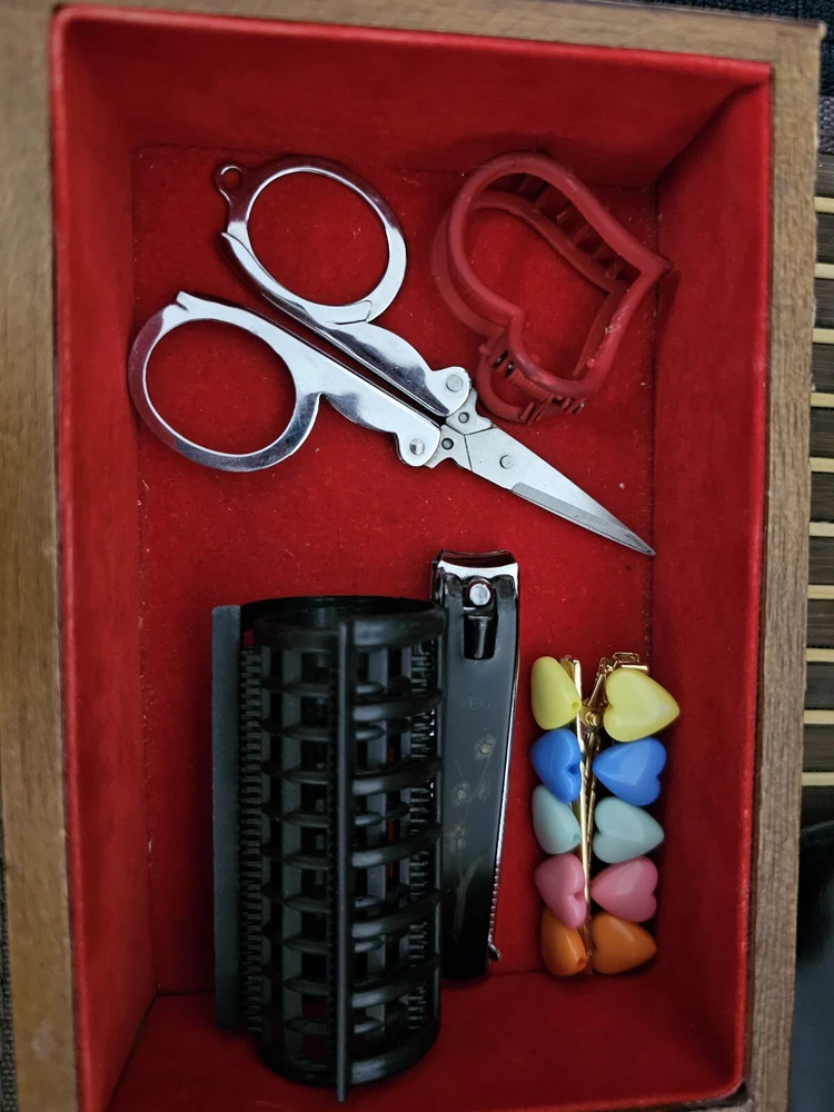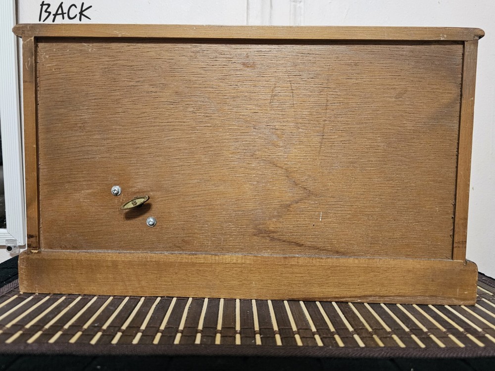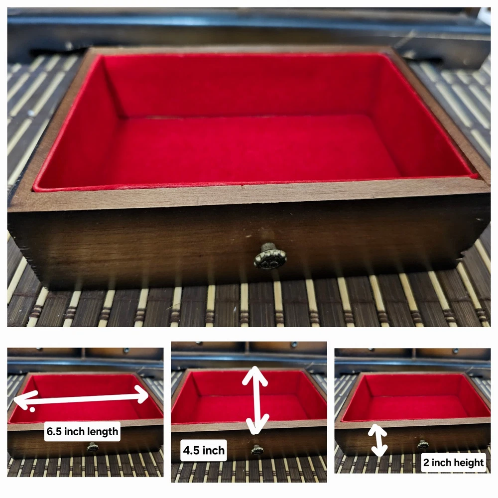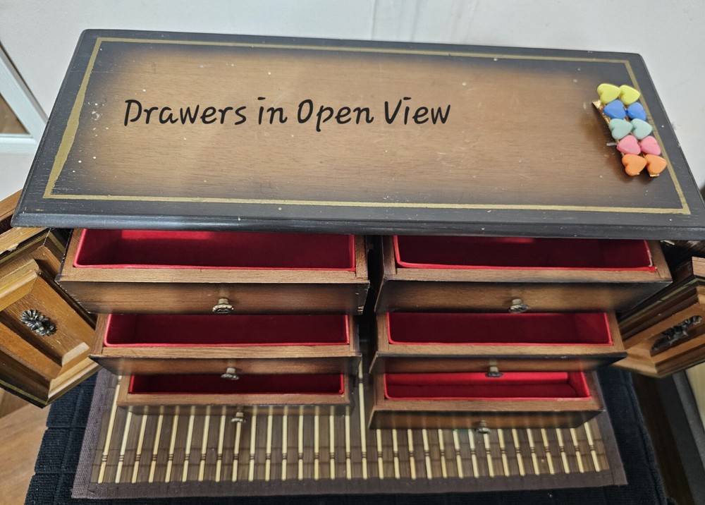 Vintage 1950s Wooden Jewelry Box β Made in Japan | 6 Drawers + Music Mechanism π Timeless Vintage Jewelry Box β Rare Find! This beautiful 1950s wooden jewelry box, crafted in Japan, is a classic storage solution for your treasured accessories. Made from solid wood, it features six drawers, two side doors, and a built-in music mechanism that plays a charming tune. π Key Features: βοΈ Authentic Vintage Design β Elegant woodwork with intricate metal handles. βοΈ 6 Spacious Drawers + 2 Side Doors β Perfect for organizing jewelry & keepsakes. βοΈ Plays Music Beautifully β A nostalgic tune adds to its charm. βοΈ Durable Solid Wood Construction β Sturdy and built to last. βοΈ Unique Decorative Piece β A collectorβs dream or a stylish organizer. π Measurements: Jewelry Box: 9" (H) Γ 14.3" (L) Γ 6" (W) Each Drawer: 6.5" (L) Γ 4.5" (W) Γ 2" (H) π Condition: Gently used with minor scratches due to age β adds to its vintage character. π Perfect for vintage lovers, collectors, or as a unique gift!