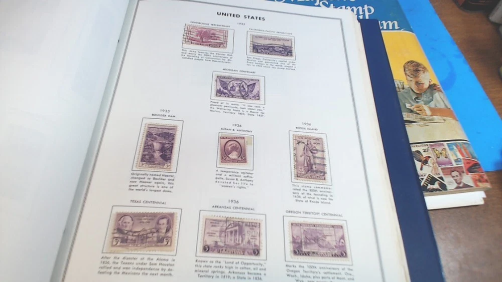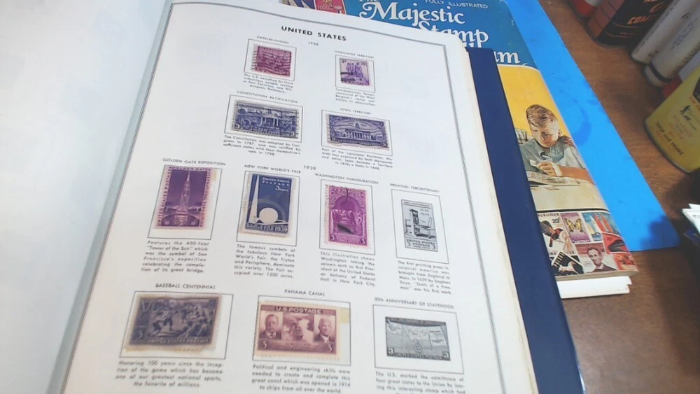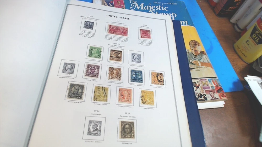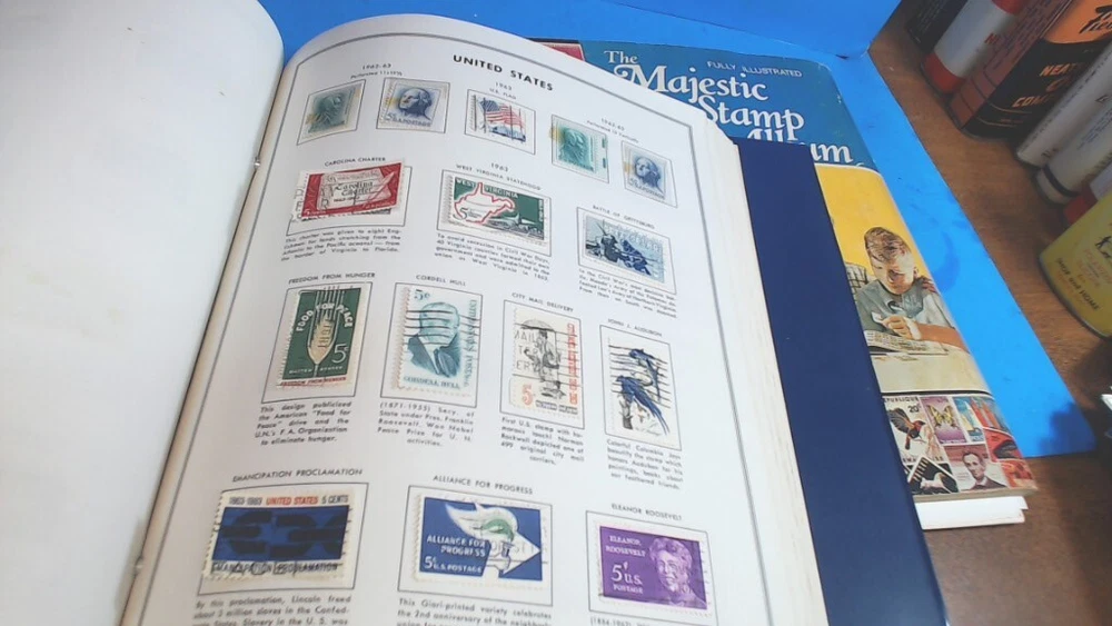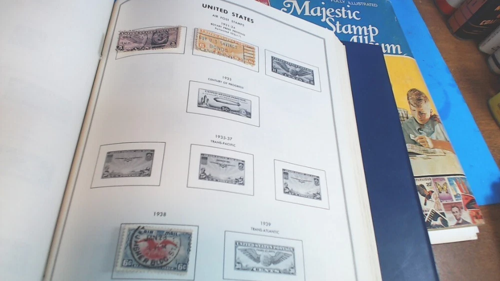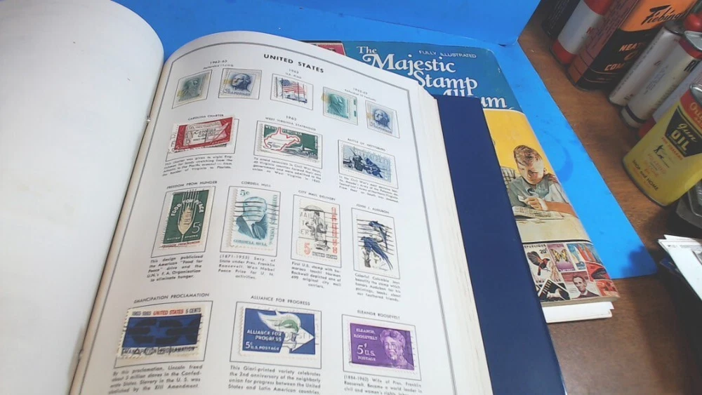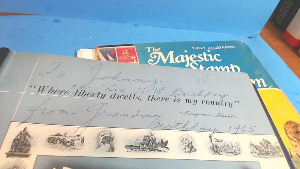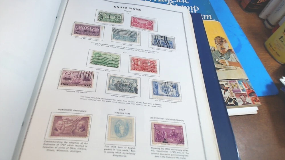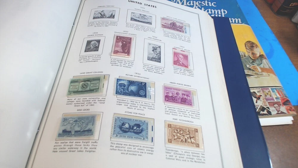 Vintage-UNITED STATES--The LIBERTY STAMP ALBUM -1965 series-with about 345 WORLD WIDE STAMPS in It--About 500 Stamps in MAJESTIC STAMP - Album-- see second group of pictures-- a lot of stamps falling off-- Most on with 2 sided tape see Some of the pictures i took of various Stamps from various countries-- Most are very nice stamps--- some had some tape on them to hold in-- loose ones from age and Glue drying UNITED STATES LIBERTY--12-1/4 " tall by 8-1/2 " wide book- thick---2 pin--binder second book is 11 " tall by 8-1/2 " wide----- lots of LOOSE SHEETS ADDED---inside the pages--and lots of stamps falling off from glue drying-- see pictures of the stamps from pages that had the most on them any questions-please ask see pictures for best description on Condition
