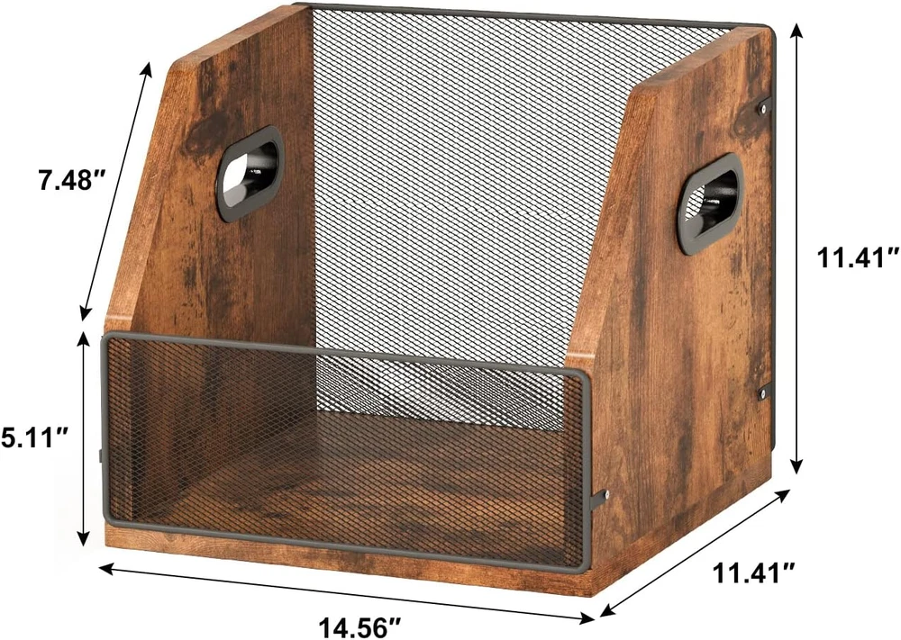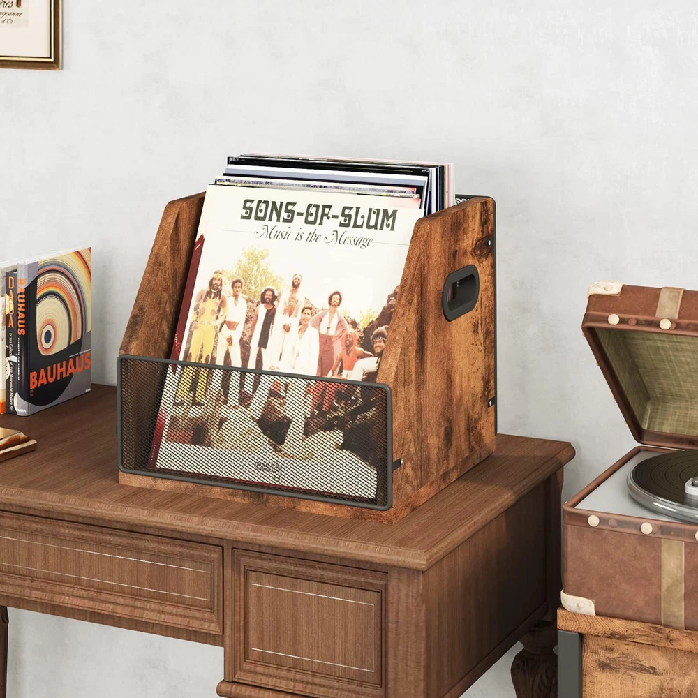 【HOLD up to 60 VINYL LPs】 The size of our rustic storage crate is about 14.6" × 11.41" × 11.4", allows our record collection rack to hold up to 60 standard sized vinyl records. 【Sturdy Metal & Wood structure 】This Vinyl Record Storage Crate is made of a high-quality metal & MDF board, which ensures strong stability and maximum load-bearing capacity is 44 lbs, built to last. 【Multi-Function】 It can not only be used as a record rack, but also be used as a desktop storage crate, collect your magazines, toys, files, books etc. 【Updated User-friendly Design】1. Handles on both sides for take it anywhere. 2. Visualization design, convenient for you to find your records quickly. 3. Silicone gasket on the bottom (no assembly required), which can prevent sliding when holds many records. 【Easy Assemble】Just tighten 10 screws to assemble the album holder only takes 5 mins.