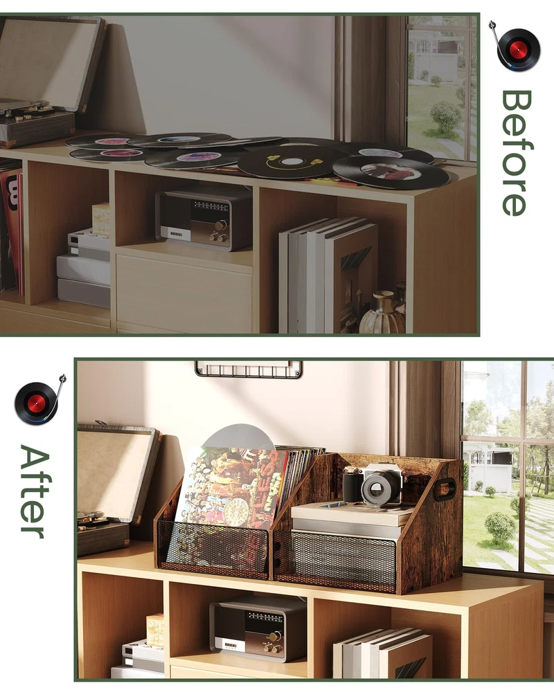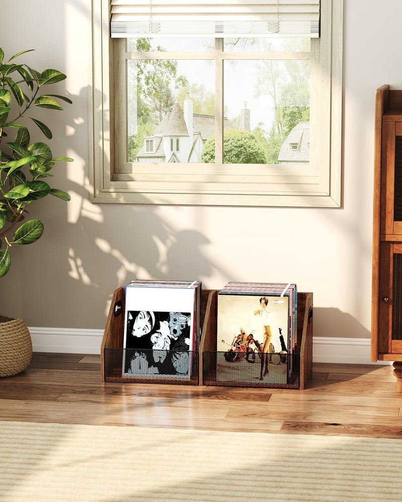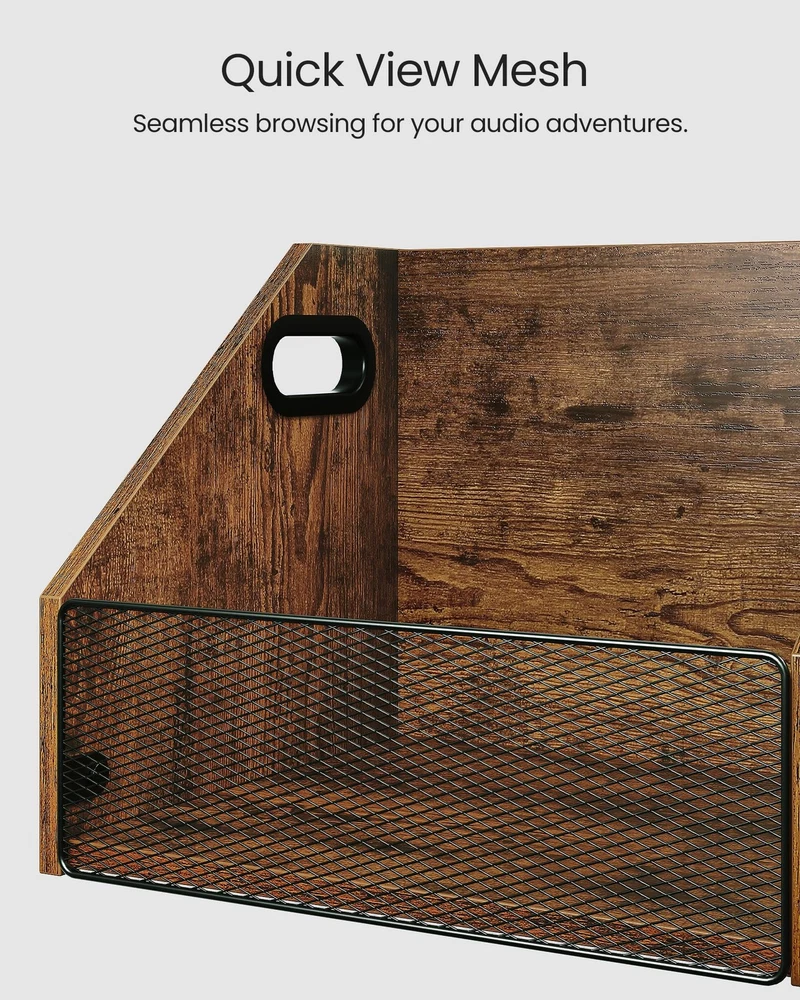 Vinyl Record Storage Double-Compartment 27.6" Record Holder with Metal Mesh F Capacious Storage Capacity: Our 2-compartment record storage, measuring 27.6"L x 11.8"W x 11"H, boasts ample room for 80+cherished records, meticulously crafting a neat, melodic sanctuary for your musical realm. Simplicity meets versatility in every inch Visible Metal Mesh: Featuring a unique metal-grid facade, this vinyl record holder delicately shelters your vinyls while revealing them in full view. Every disc stands out, inviting your favorite melodies with ease and grace Versatile Storage Solution: Beyond vinyls, this vinyl storage crate transforms into a home for albums, essential documents, playful knick-knacks, or daily essentials. Customize to your heart's desire, unlocking endless storage potential Retro Industrial Charm: Embracing a rustic brown finish, complemented by a distinct trapezoidal silhouette and intricate metal mesh, this vinyl record storage exudes industrial elegance. Enrich your living space with a unique blend of artistry and nostalgia Effortless Assembly: With a straightforward design of vinyl record storage, numbered components, and a step-by-step illustrated manual, assembling your classic and elegant vinyl storage box is a breeze. Follow the guide and create a masterpiece in minutes Vinyl Record Storage Crate Shipping We offer FREE shipping on all orders! We ship within Three business days of payment, usually sooner. We use a selection of shipping services such as UPS, FedEx, USPS etc. We only ship to the lower 48 states, no APO/FPO addresses or PO Boxes allowed. Local pickups and combined shipping options are not provided at this time. Return You can return a product for up to 30 days from the date you purchased it. Any product you return must be in the same condition you received it and in the original packaging. Please keep the receipt. Payment We accept payment by any of the following methods: PayPal Please pay as soon as possible after winning an auction, as that will allow us to post your item to you sooner! Feedback Customer satisfaction is very important to us. If you have any problem with your order, please contact us and we will do our best to make you satisfied. Contact Us If you have any queries, please contact us via ebay. We usually respond within 24 hours on weekdays. Please visit our eBay store to check out other items for sale! Thank you for shopping at our store.