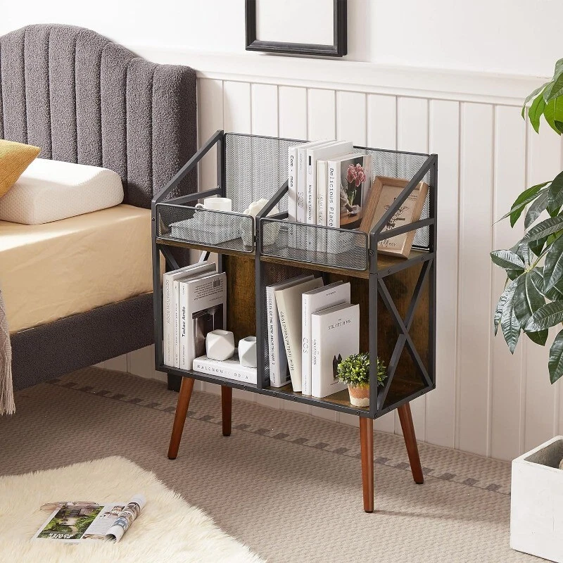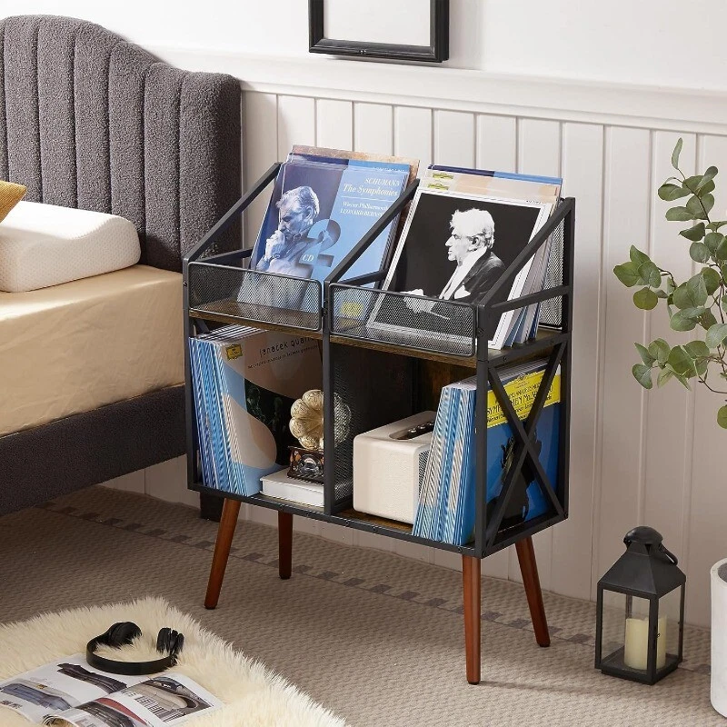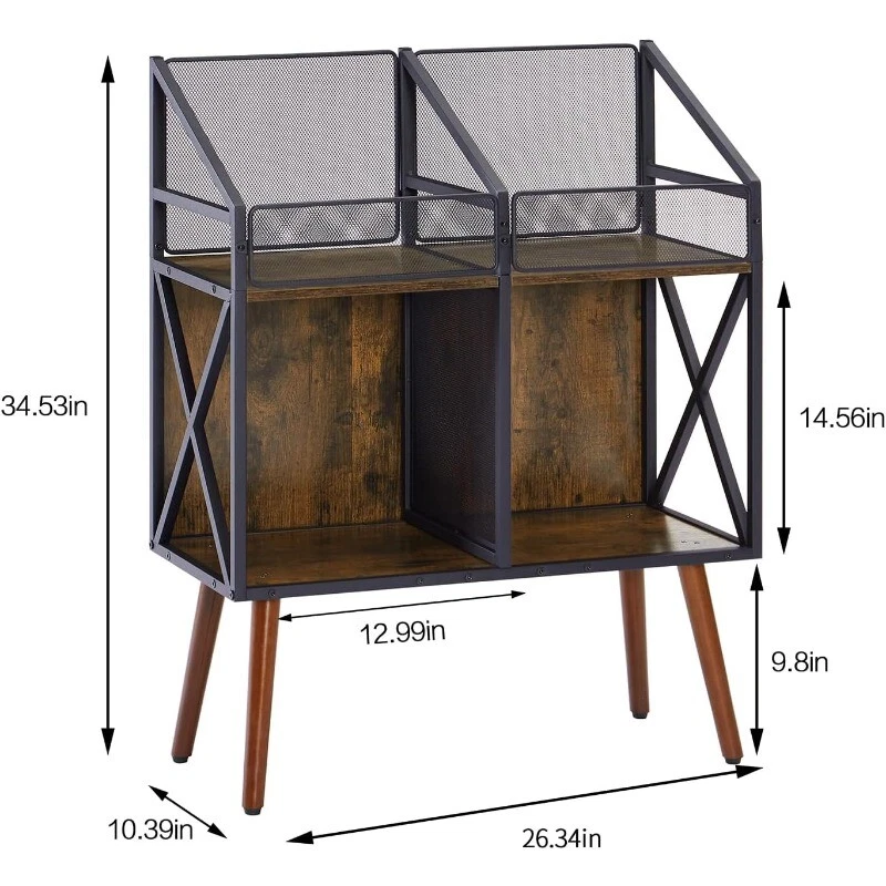 Material Wood Color BLACK Product Dimensions 12"D x 10"W x 12"H Number of Shelves 2 Room Type Living Room About this item Large capacity: This record storage cabinet can accommodate 250 records, with two layers of space for storage. The records in the upper layer will be displayed on the front for easy viewing and retrieval Size 26.34 * 10.39 * 34.53 inch The record storage stand is not only functional, but also stylish, making it the ideal addition to any living room or bedroom. The compact size allows for easy storage and transport, making it a great choice for those who love to take their collection on the go. High quality materials: Made of high-quality MDF wood boards and steel skeleton, sturdy and durable, environmentally friendly and waterproof. The four wooden legs are designed with an inclined angle and can withstand a weight of 200lb. Retro design can adapt to various home styles, while diamond mesh design maintains visualization. Retro style design: The black vinyl record holder is made of brown wooden boards and a matte black steel frame, with sharp edges giving a strong nostalgic atmosphere. Each piece is a unique artwork. This printer stand is the perfect addition to your home or office. Made of durable materials, it provides a stable and secure platform for your printer to sit on. With a sleek design, it is both functional and stylish. Its compact size makes it easy to move around when needed. Ideal for those who want to keep their workspace organized and clutter-free. Wooden leg This product adopts a four sided sloping wooden back design, ensuring the overall stability of the product and not tipping. The feet are equipped with anti slip pads to avoid damaging the wooden floor or easily sliding Steel frame The overall support of the product is made of carbon steel skeleton, and the thick iron pipe ensures the load-bearing capacity of the product, without shaking or falling apart. The steel surface is black matte, improving aesthetics while protecting the product from rusting Wooden boards Made of high-quality MDF board, it is sturdy and durable, free from stains, easy to clean, and can be refreshed by wiping with clean water. Vintage wood colored surface, which will not turn yellow or discolor after prolonged use