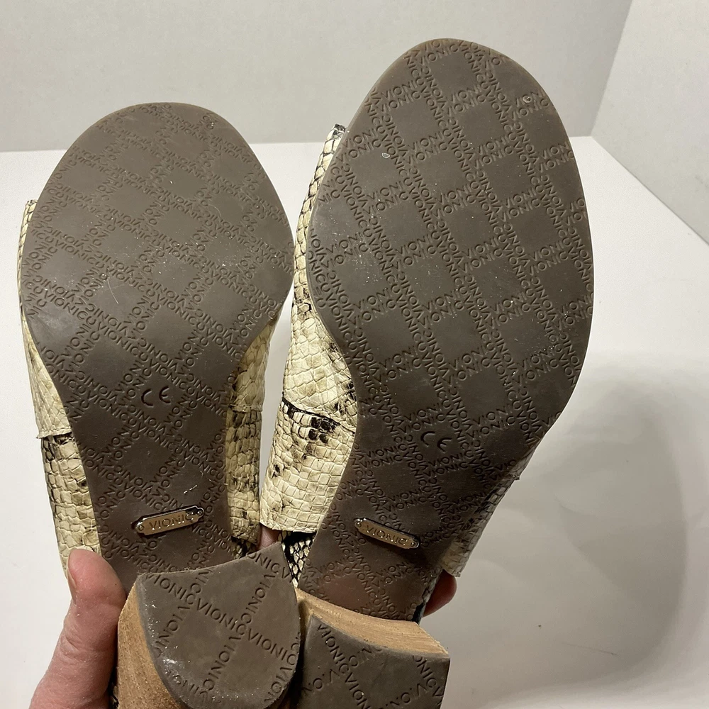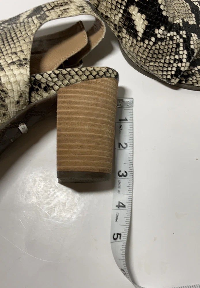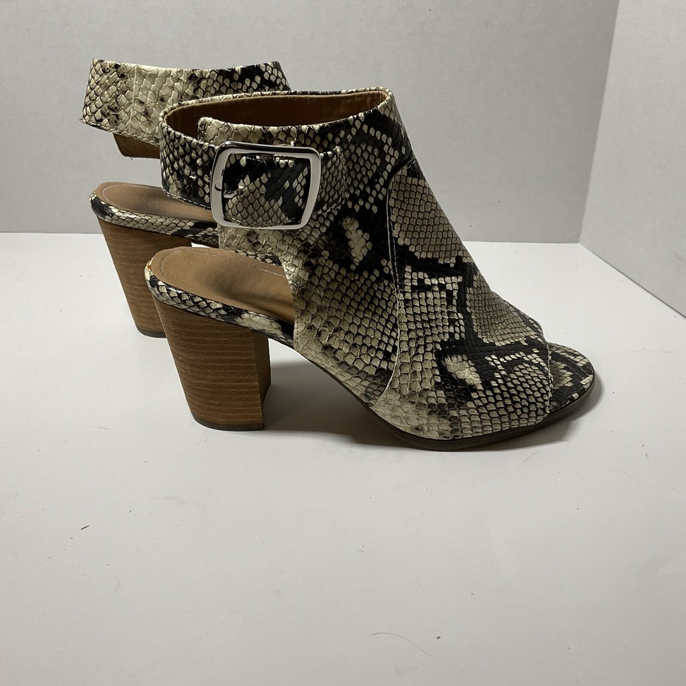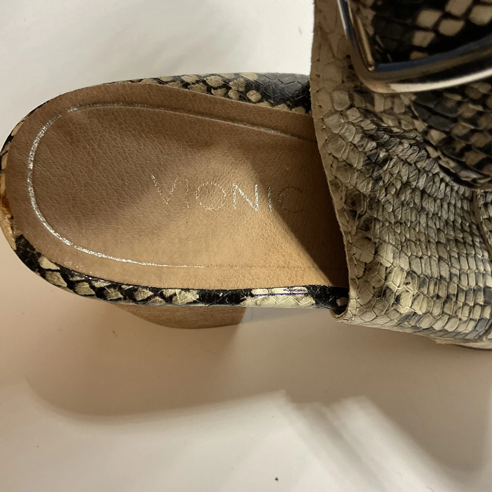 Vionic Blakey Snakeskin Block Heel Open Toe Sandals in size 8 for women. These sandals feature a stylish snake skin pattern, a block heel, an open toe design, and an ankle strap with adjustable buckle closure. Made of leather, these sandals offer both style and comfort with Vionic's signature support. Very good condition