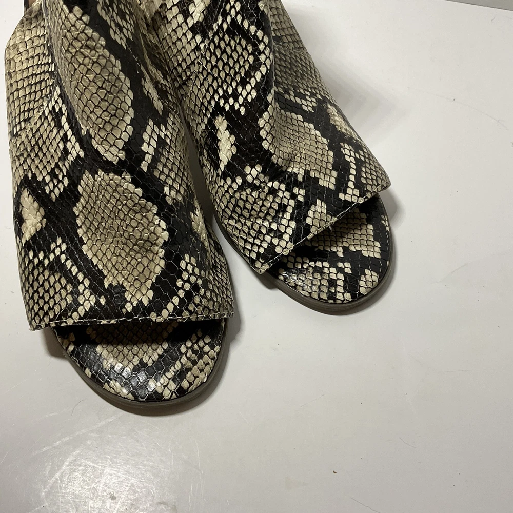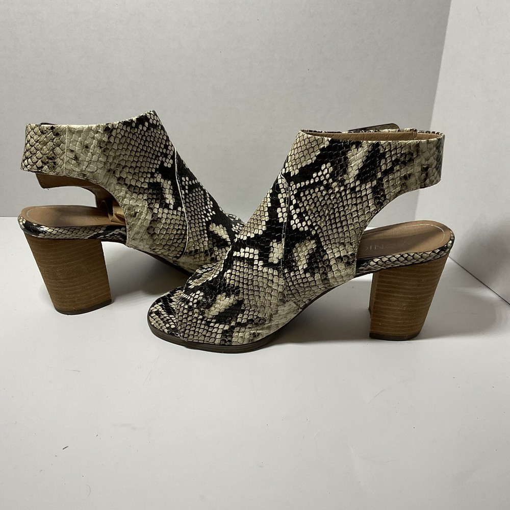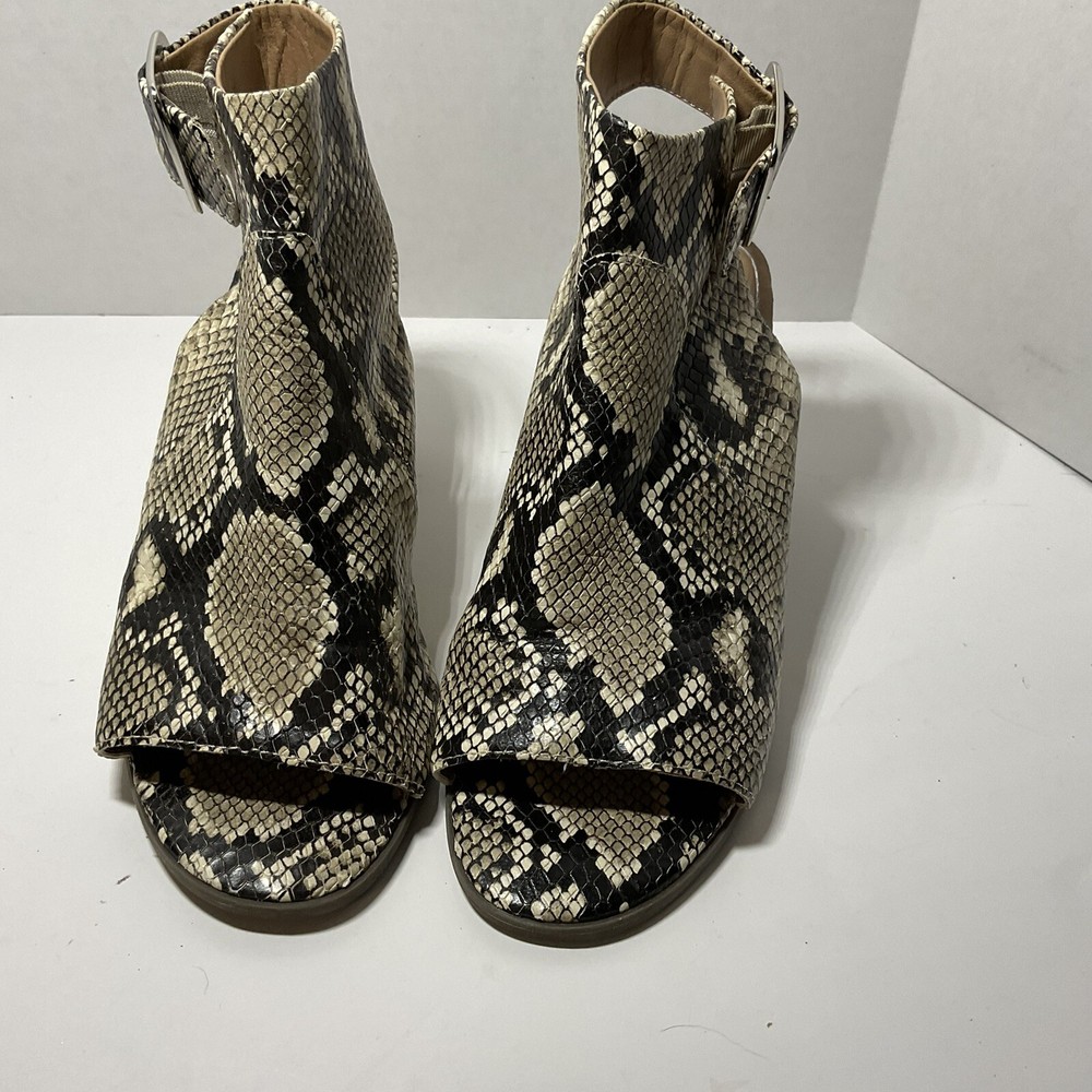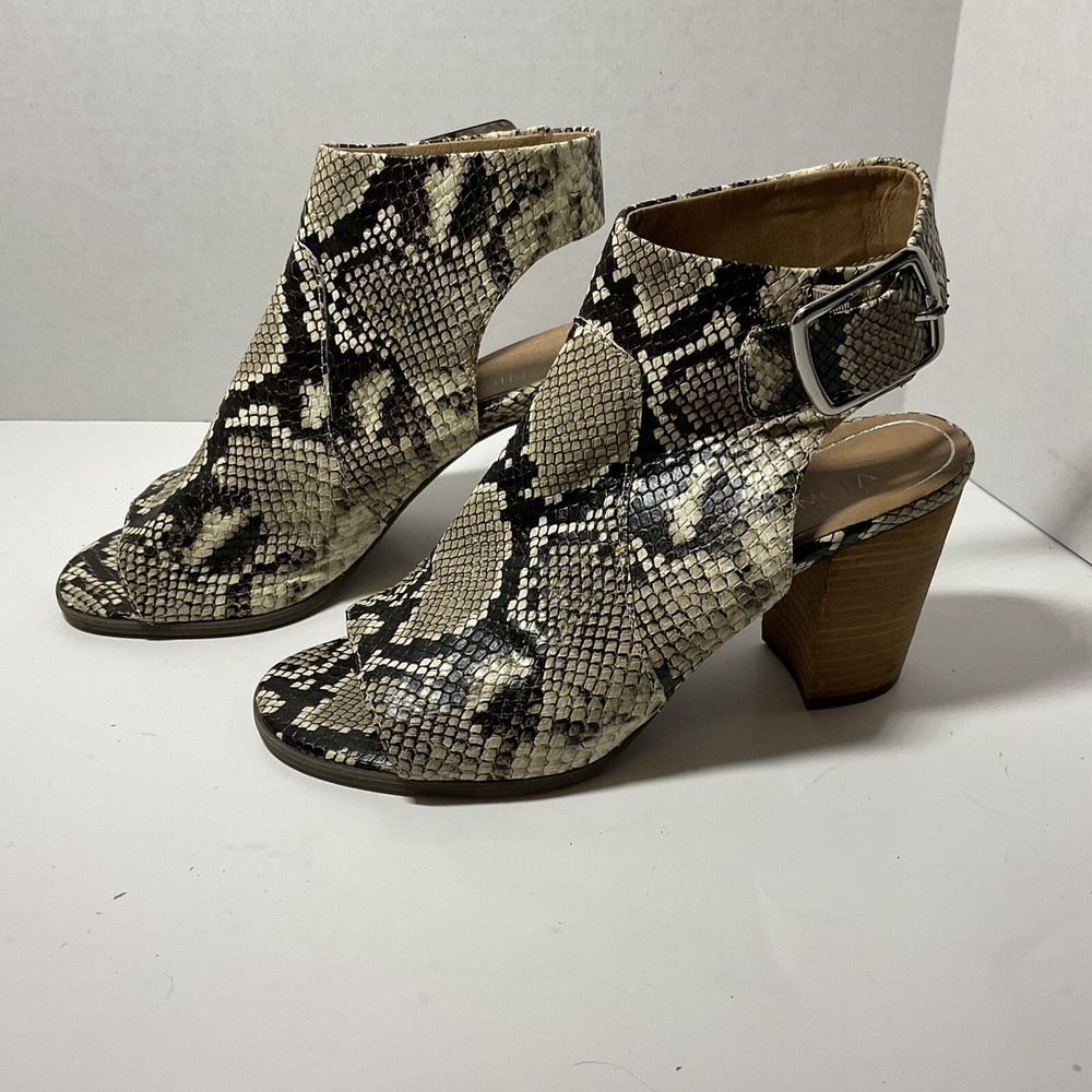 Vionic Blakey Snakeskin Block Heel Open Toe Sandals in size 8 for women. These sandals feature a stylish snake skin pattern, a block heel, an open toe design, and an ankle strap with adjustable buckle closure. Made of leather, these sandals offer both style and comfort with Vionic's signature support. Very good condition