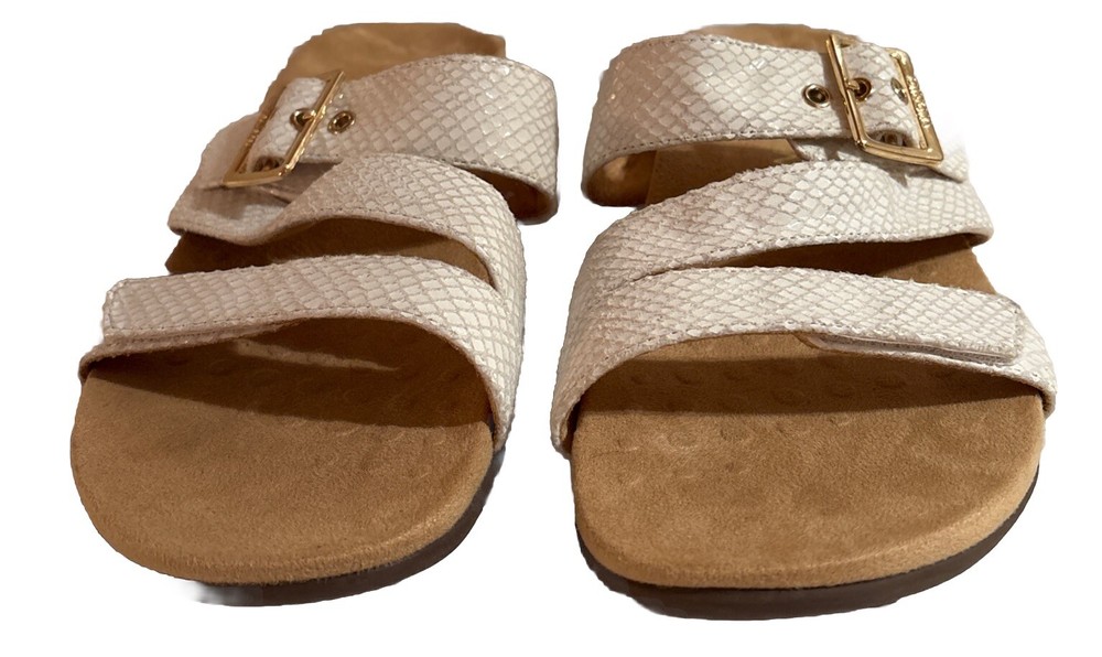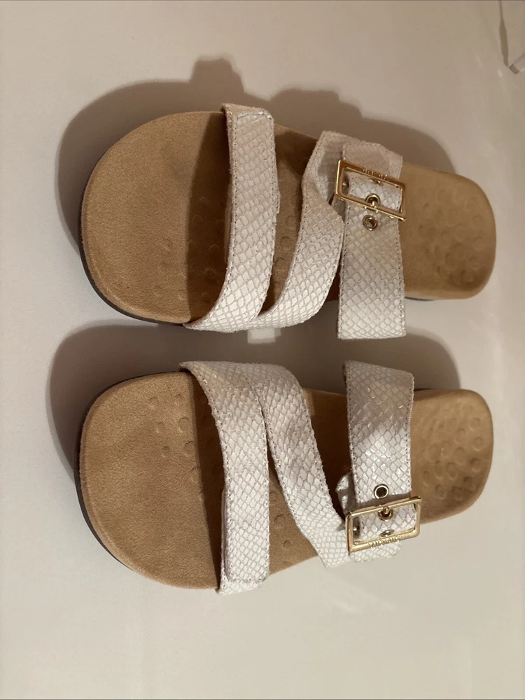 The Vionic Skylar leather sandals in size 11 for women feature a white color with gold buckle detailing. These slip-on sandals have a stylish design with straps and a cushioned insole for added comfort. The upper material is made of leather, giving the sandals a durable and high-quality feel. Perfect for a casual or dressy look, these Vionic sandals offer both style and support for all-day wear. Beautiful sandal with extreme comfort