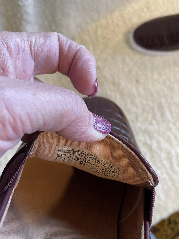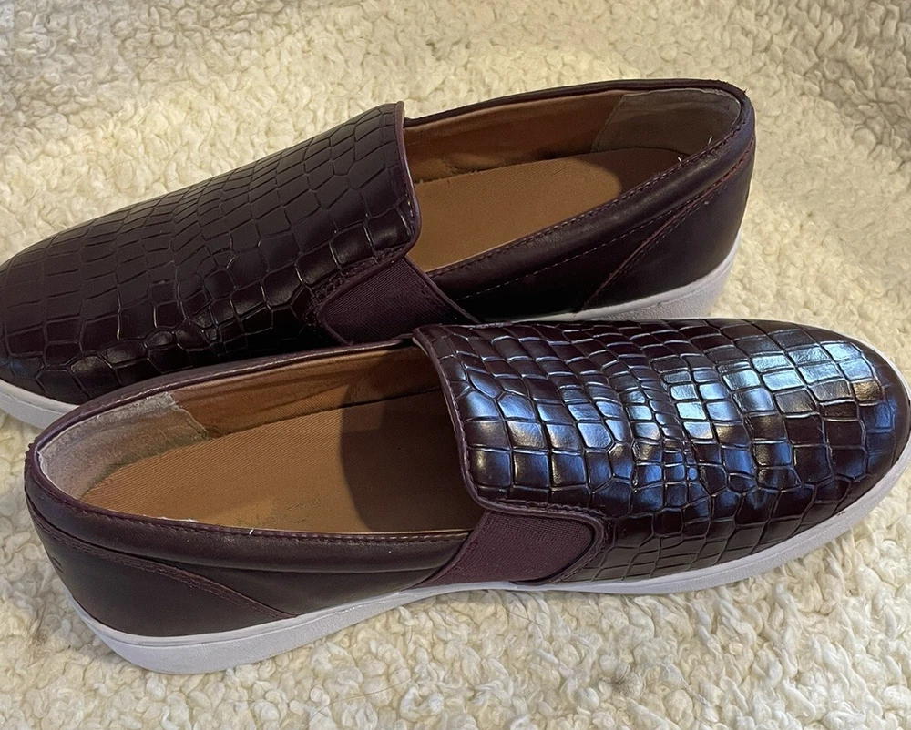These Vionic Demetra slip-on shoes feature a stylish croc-embossed wine brown leather upper with a comfortable foam insole and soft leather lining. Designed for women in US size 8 (UK size 6, EU size 39), these casual loafers have a standard width and a durable rubber outsole. Perfect for everyday wear, these Vionic shoes combine fashion and function for a versatile addition to any wardrobe. From a smoke free home