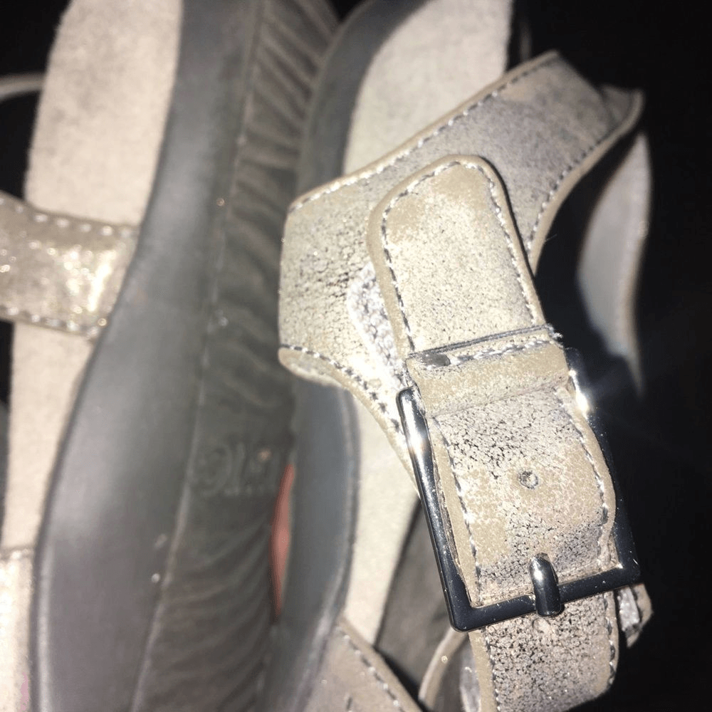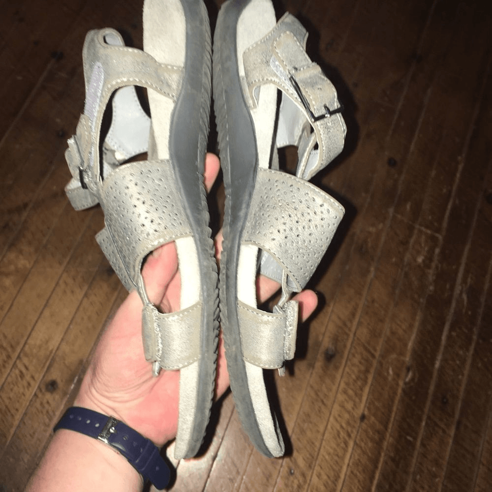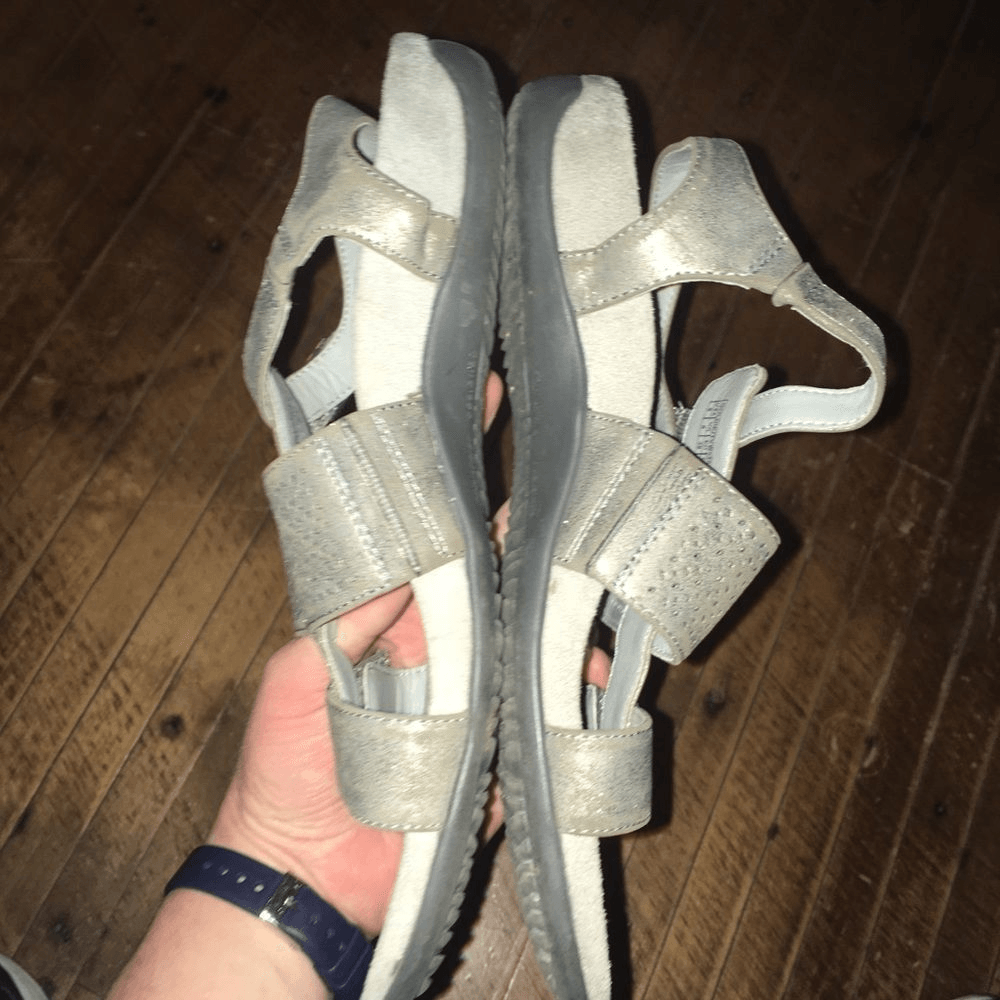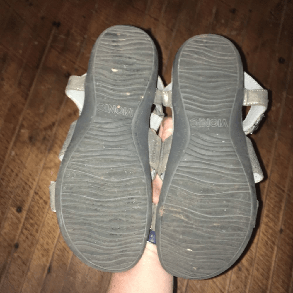 Vionic silver, metallic, ortho, comfortable, strappy sandals. Great arch support. Some wear on the straps in the way of the silver being scratched off a bit. From a pet and smoke free house. Happy to bundle!